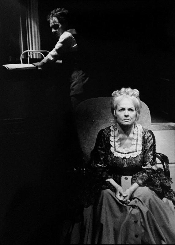 Anneli Sauli näytelmässä Tribadien yö. Näytelmä sai ensi-iltansa 23.3.1996 ja jäi se Anneli Saulin viimeiseksi näytelmäksi Joensuun kaupunginteatterissa. Taustalla näyttelijä Seppo Timonen. Näytelmän ohjasi Ossi Räikkä. Kuva Mikko Savolainen, Joensuun kaupunginteatterin arkisto.