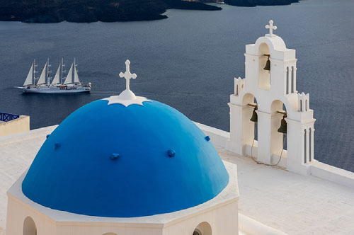 Many people recognize Santorini for the intense blue domes and bright white buildings. Scattered throughout the island you can find several beautiful examples of the blue domes gleaming in the sunshine. There aren't as many as one might suspect. However they all provide a beautiful focal point for a photo of the island.