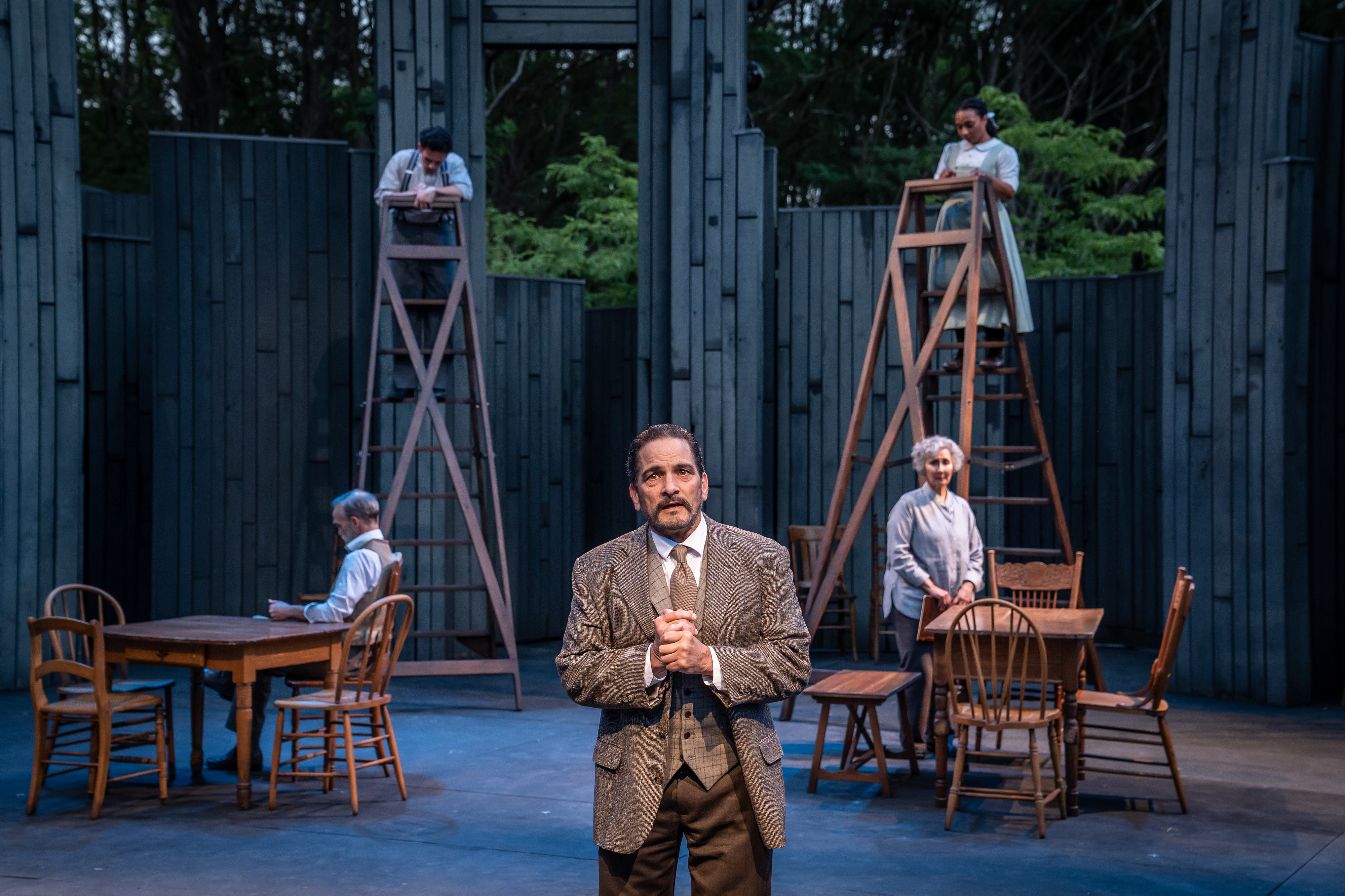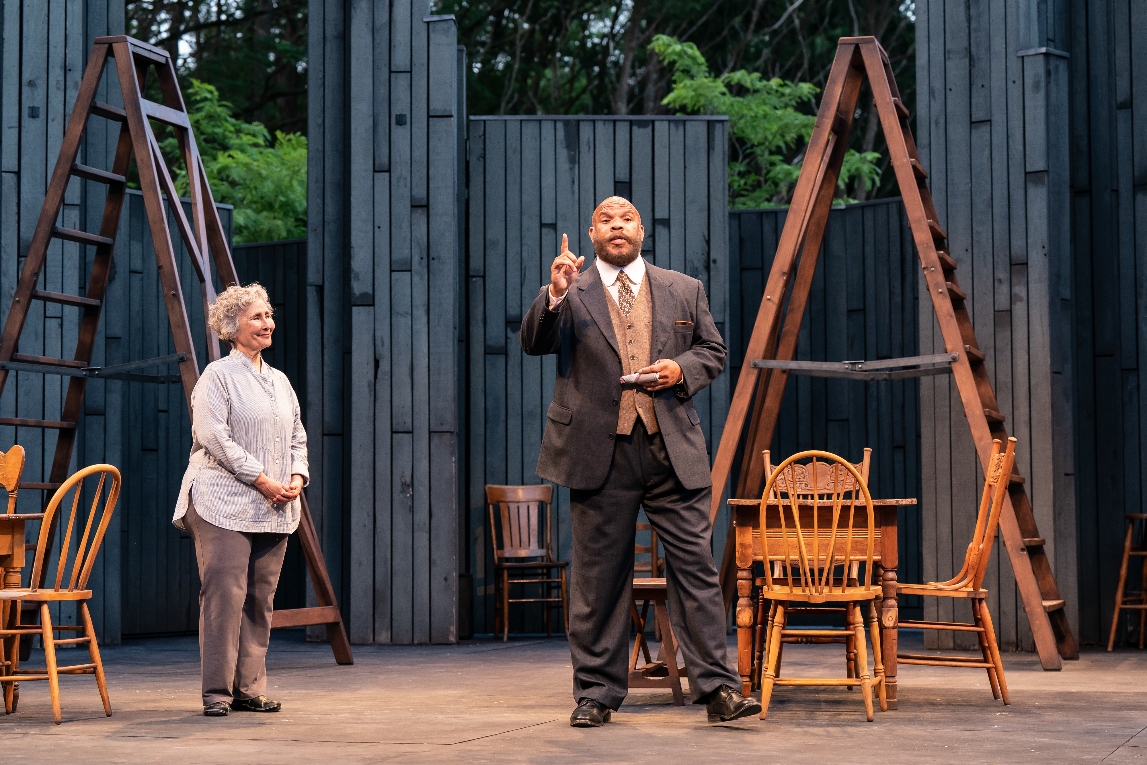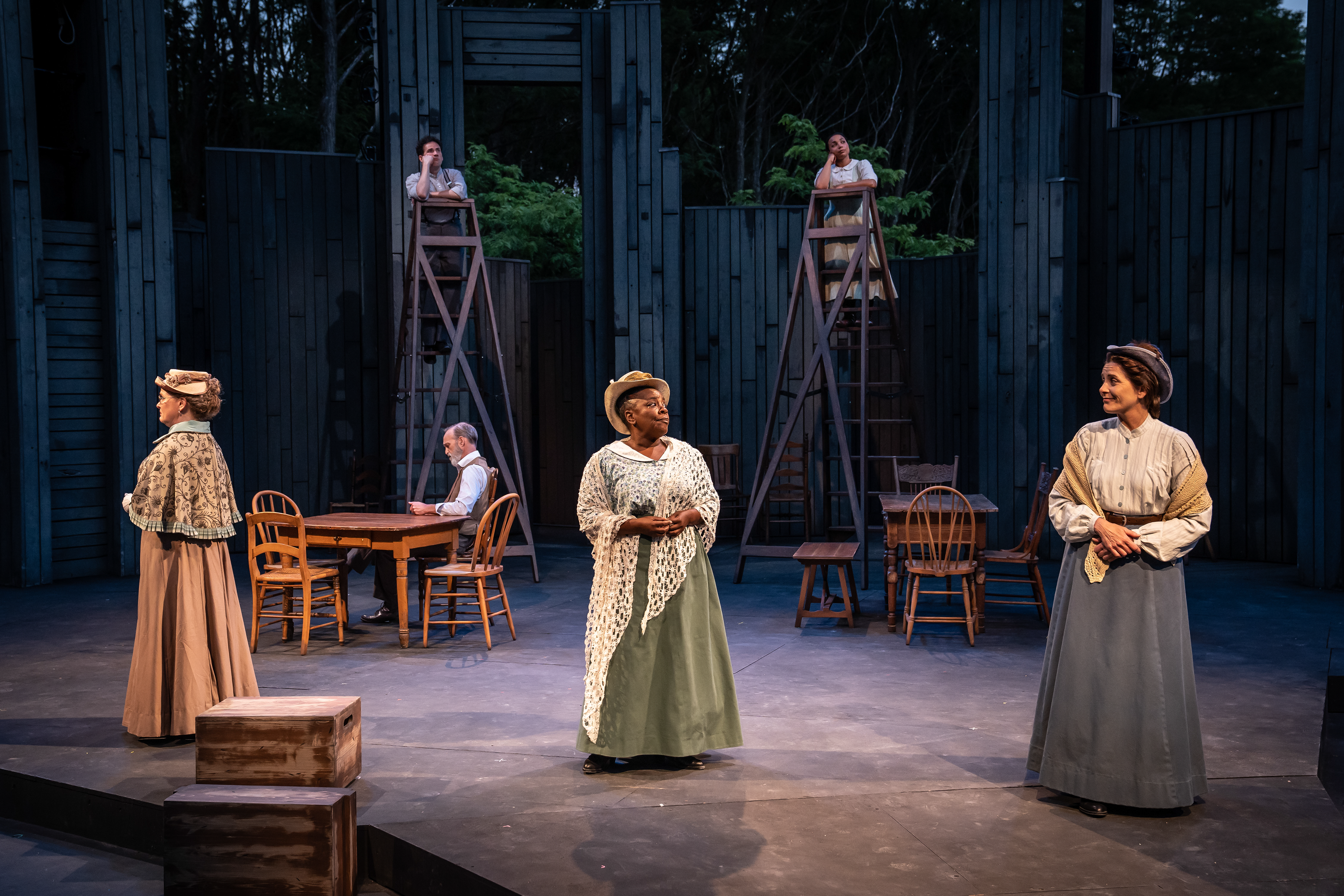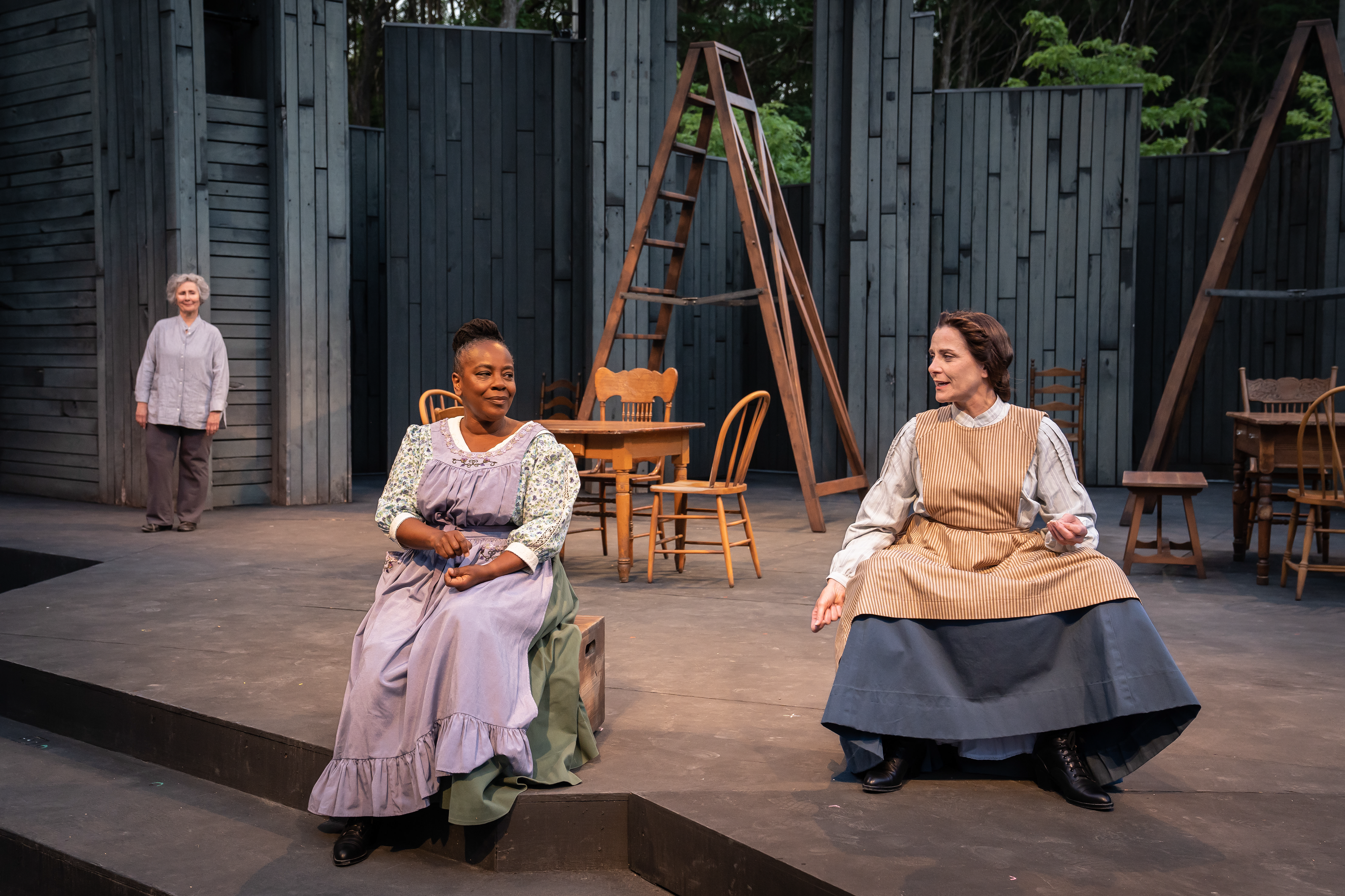 At the sound of the first bell, all of the children - Emily, Wally, George and Rebecca - charge out of the house and run for school. Then Mrs. Gibbs feeds her chickens from her apron. She and Mrs. Webb string beans. Mrs. Gibbs tells of a second-hand furniture dealer who is offering three hundred and fifty dollars for her heirloom highboy, which is a tall chest of drawers on legs. She would like to sell it and use the money for a trip to Paris, but Doc Gibbs likes to travel only to Civil War battlegrounds. Mrs. Webb encourages her to make the sale.