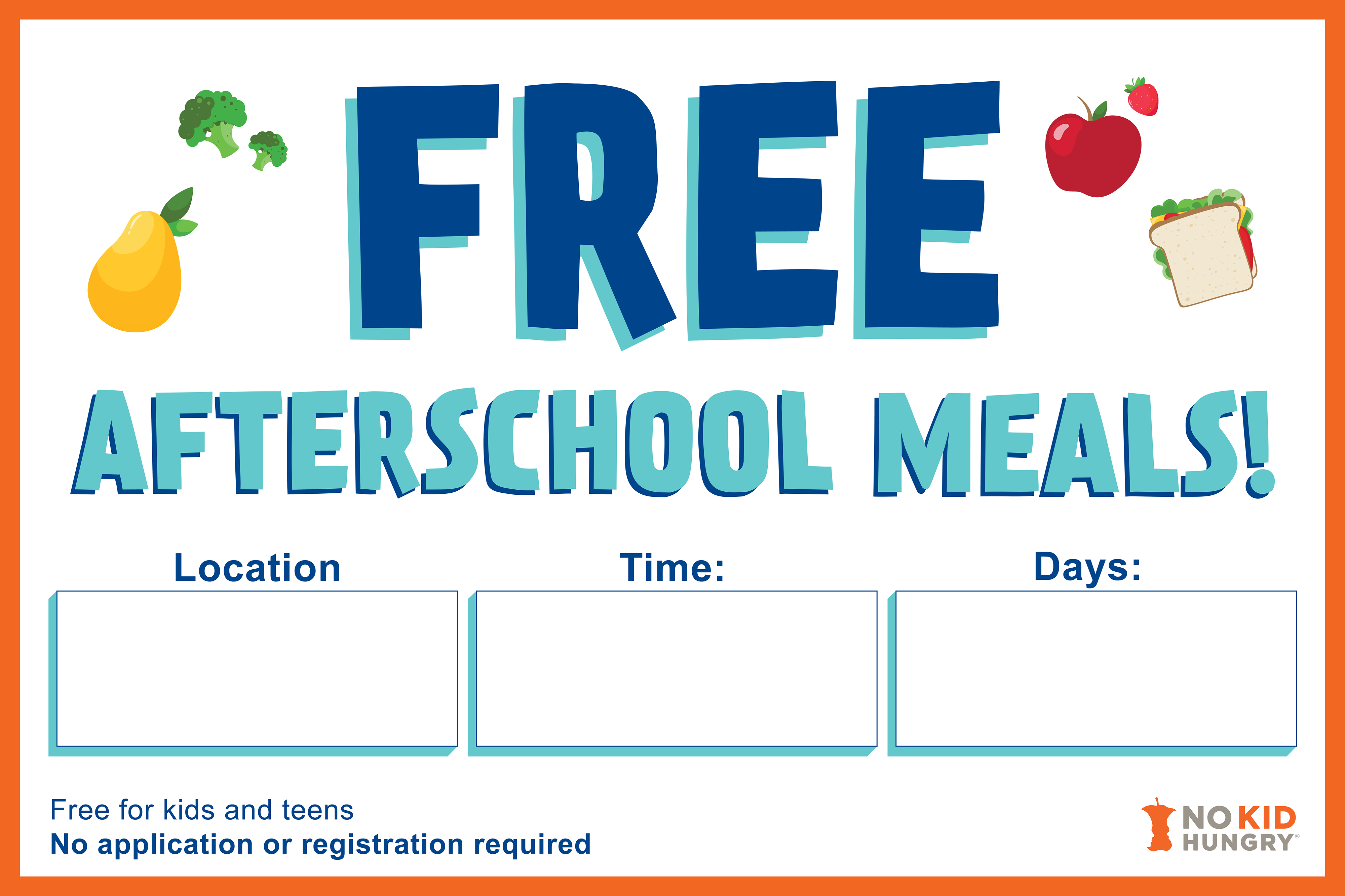 - Are your children craving a snack when the school day ends? Save time and money with afterschool meals! Available for free to all children and teens at [meal service location and time].
