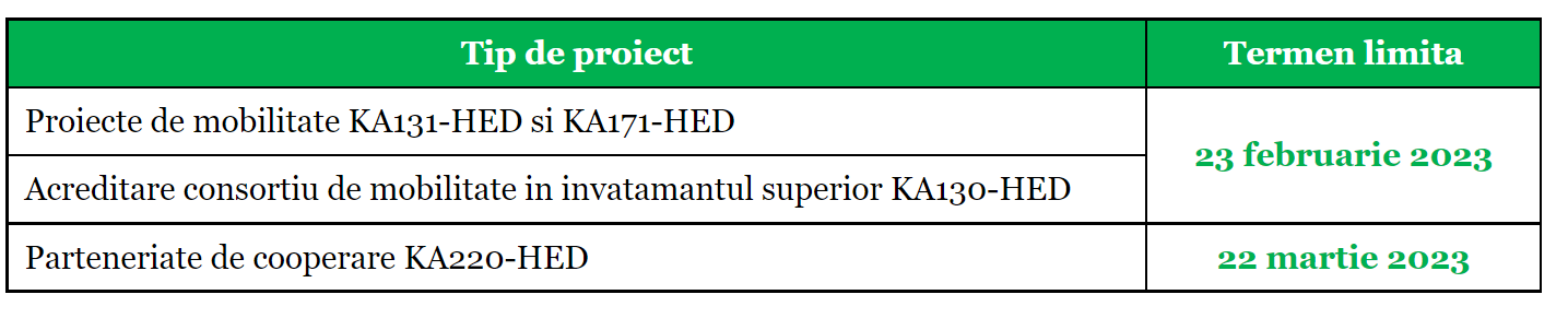 În vederea pregătirii candidaturilor din cadrul Apelului 2023 pentru acțiunile KA131-HED, KA130-HED, KA171-HED (termen limită 23 februarie) și KA220-HED (termen limită 23 martie), departamentul de Proiecte Învățământ Universitar va organiza în perioada 7-9 februarie sesiuni online de informare dedicate oportunităților Erasmus+ din domeniul universitar.