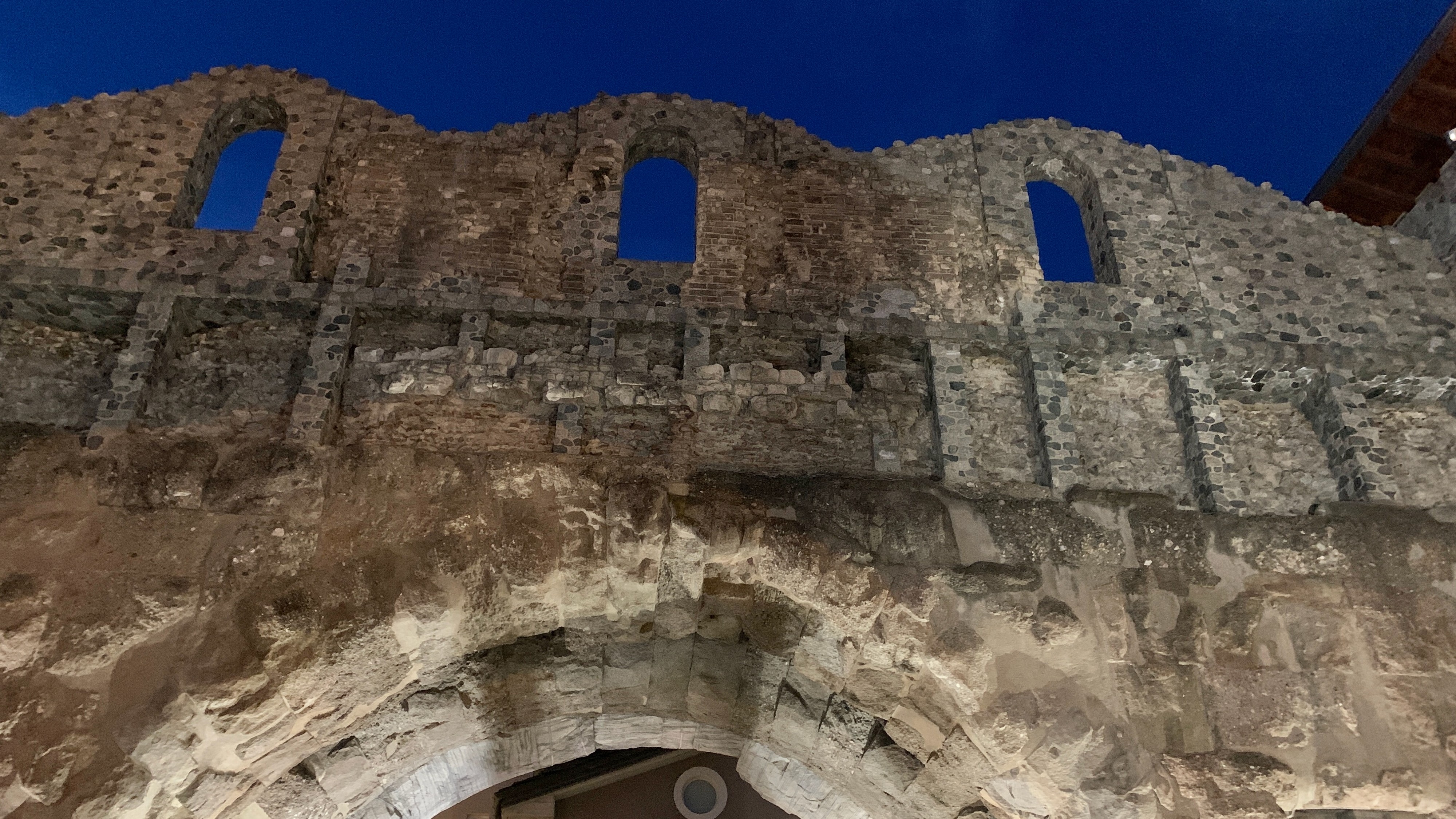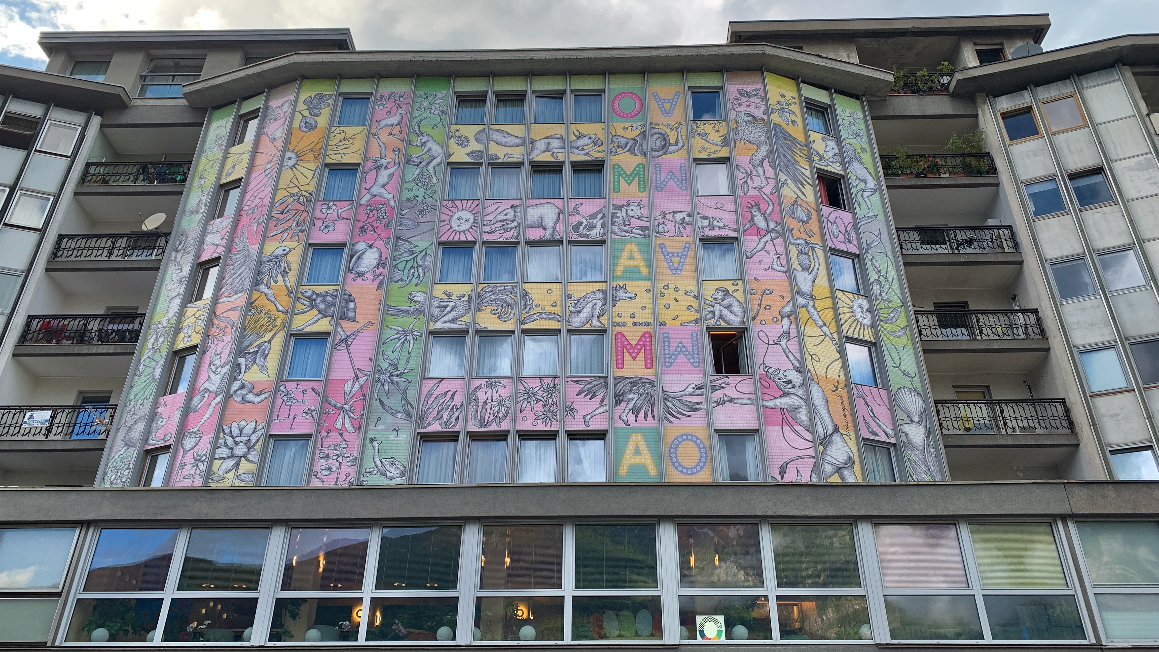Contraste à Aoste : hôtel à la façade très décorative et la Porta Praetoria, entrée orientale de la ville romaine Augusta Praetoria, depuis sa fondation en l’an 25 avant JC.