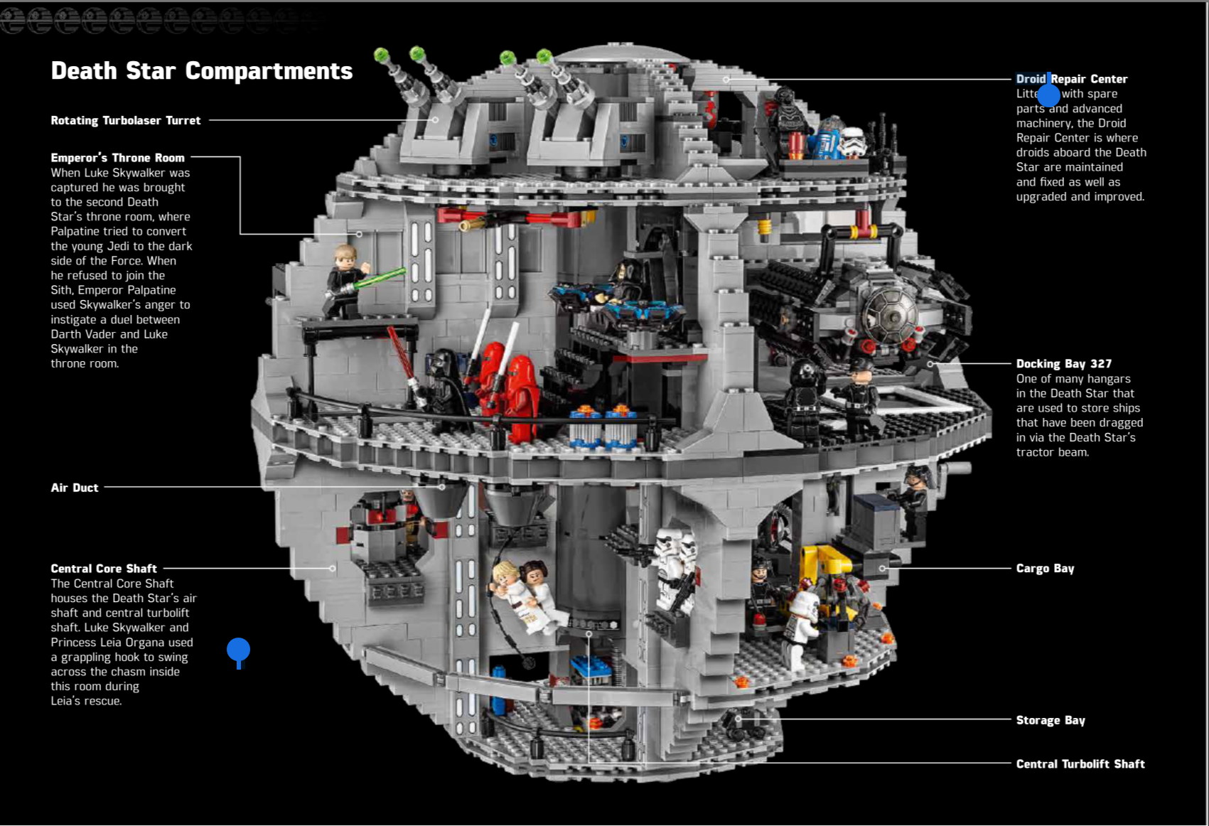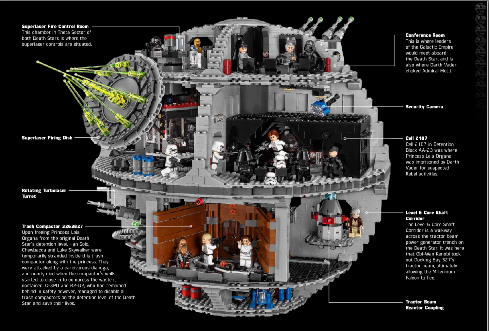 De Death Star bestaat uit vier niveaus. Op het bovenste niveau is er een groot laserkanon en de bediening ervan. Van hieruit kun je de droid onderhoudsruimte bereiken, waarnaast twee mobiele lasergeweren staan. Op het niveau eronder is de superlaser, die hele planeten kan vernietigen, en de hangar voor Darth Vader's TIE fighter. Een niveau lager staat een ronddraaiend kanon dat kleine rubberen kogeltjes kan afvuren. Het laagste niveau is een beetje klein en doet dienst als laadruim. De bijgeleverde bouwinstructies bestaan uit pictogrammen en foto's. Natuurlijk heeft zo'n krachtig wapen ook een bemanning nodig. Naast de vele Stormtroopers en droids zijn er ook minifiguren van helden zoals Luke Skywalker, Han Solo, Prinses Leia, Obi-Wan Kenobi, Darth Vader, de Keizer en vele anderen.