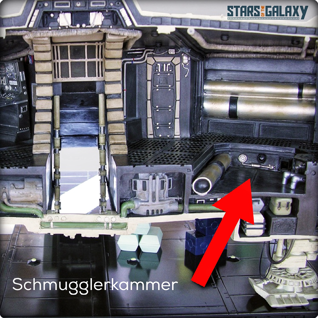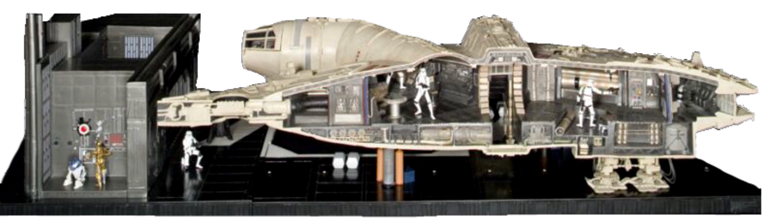Dit model is volledig gemaakt van metaal en weegt meer dan 150 kg. De dwarsdoorsnede toont indrukwekkend veel details van de Millennium Falcon. Hier kunt u voor het eerst ook de smokkelkamers zien waar Han Solo en zijn vrienden zich voor de Stormtroopers in de Death Star verstopten.
