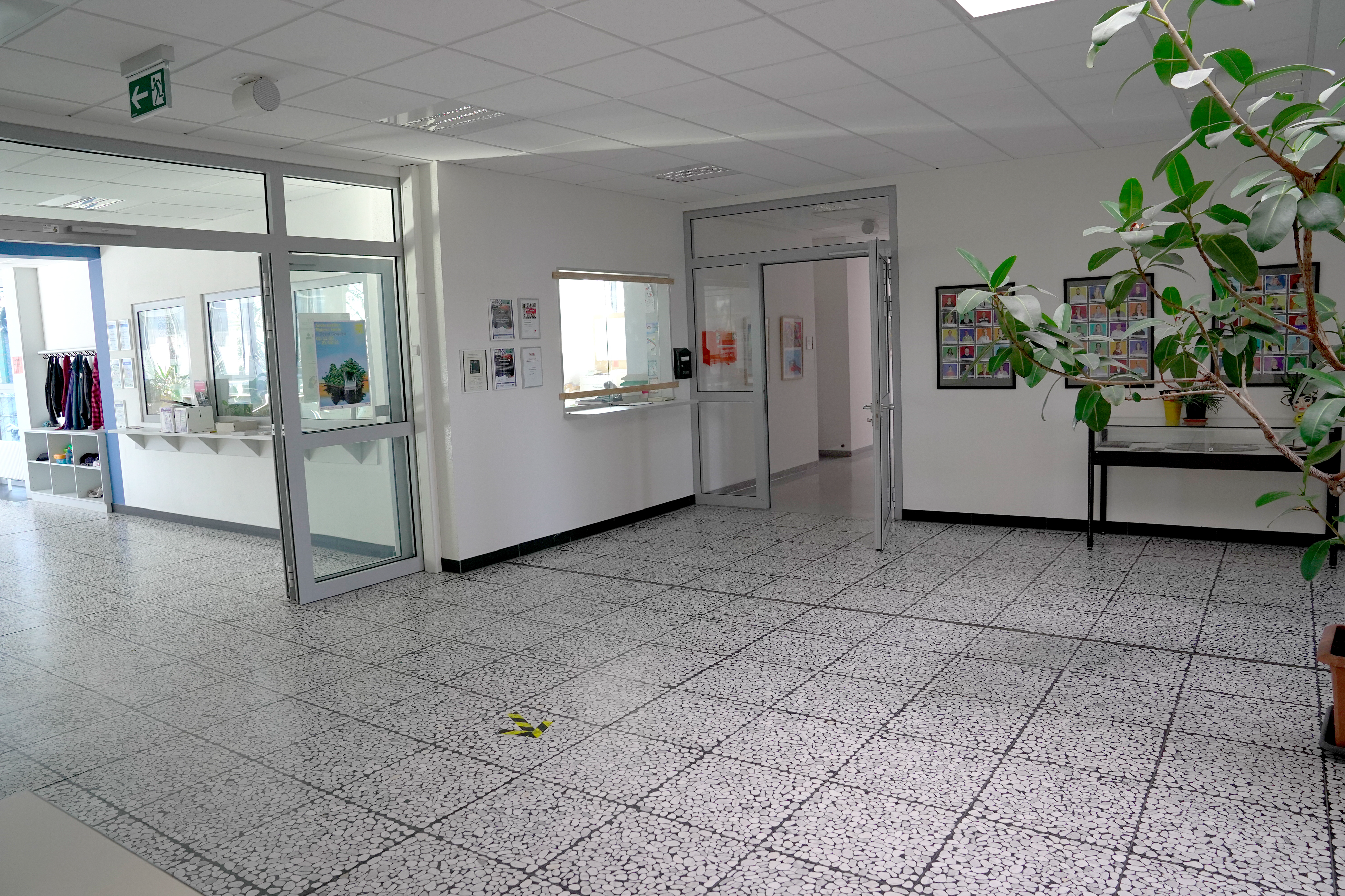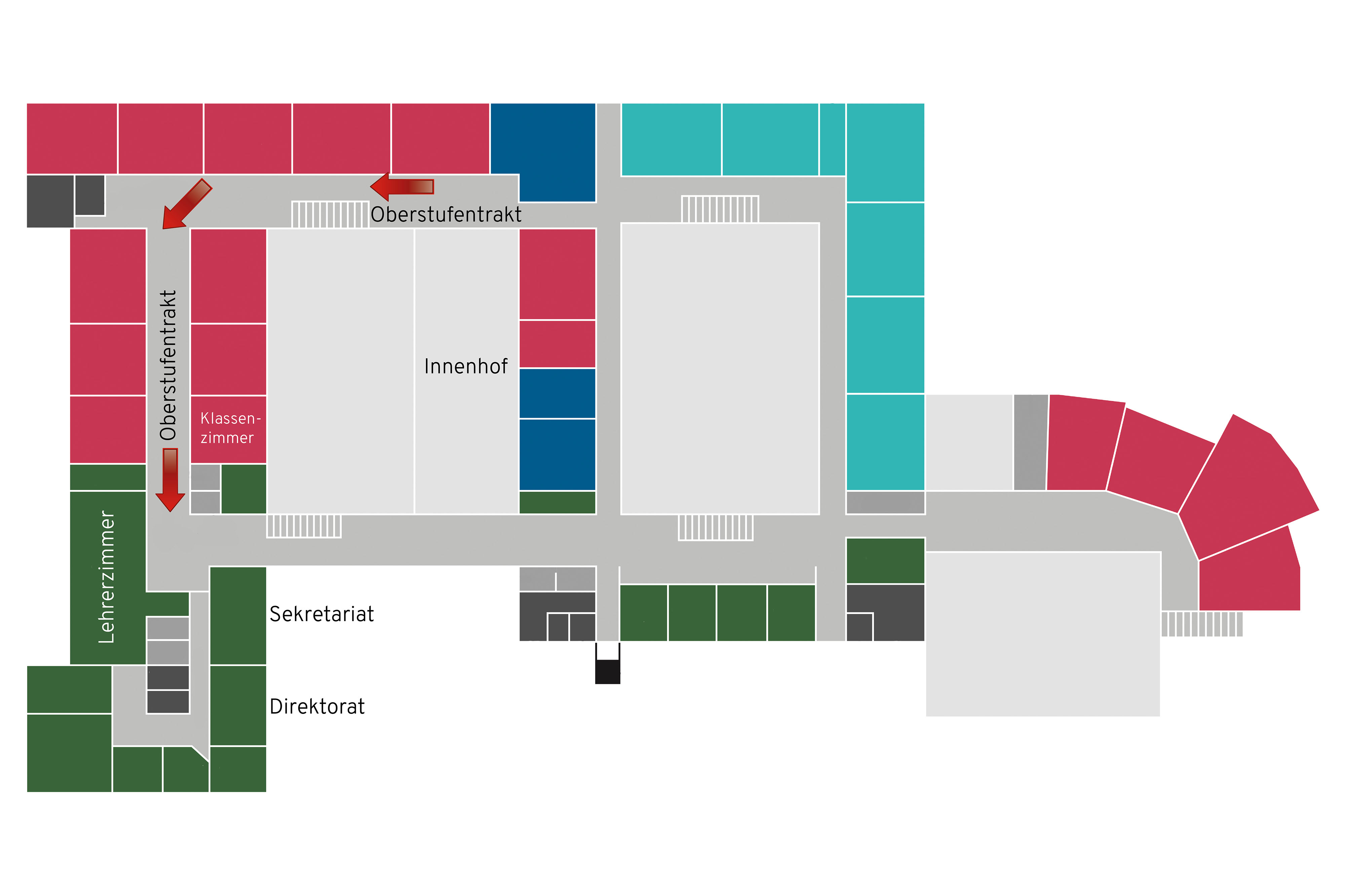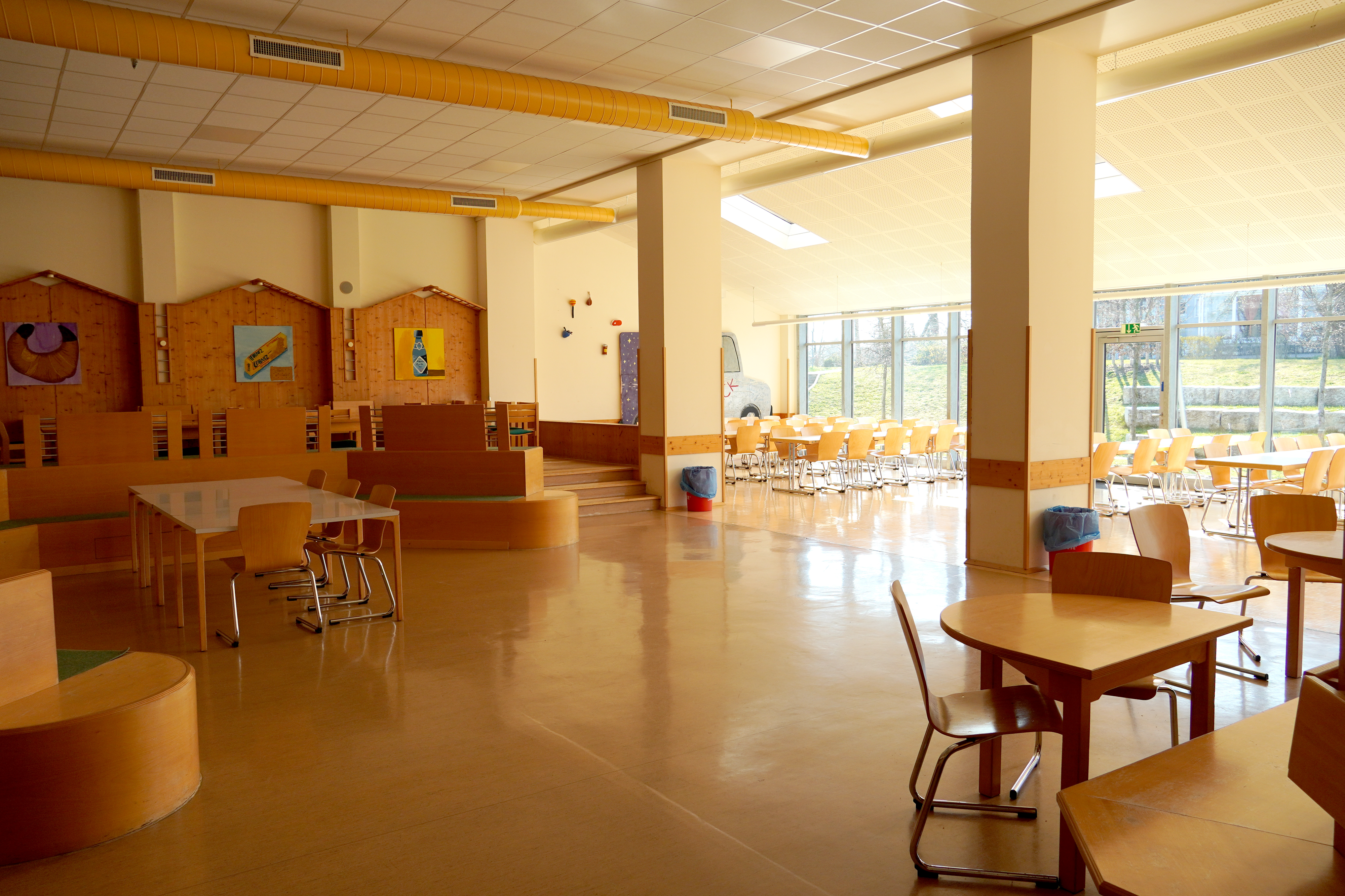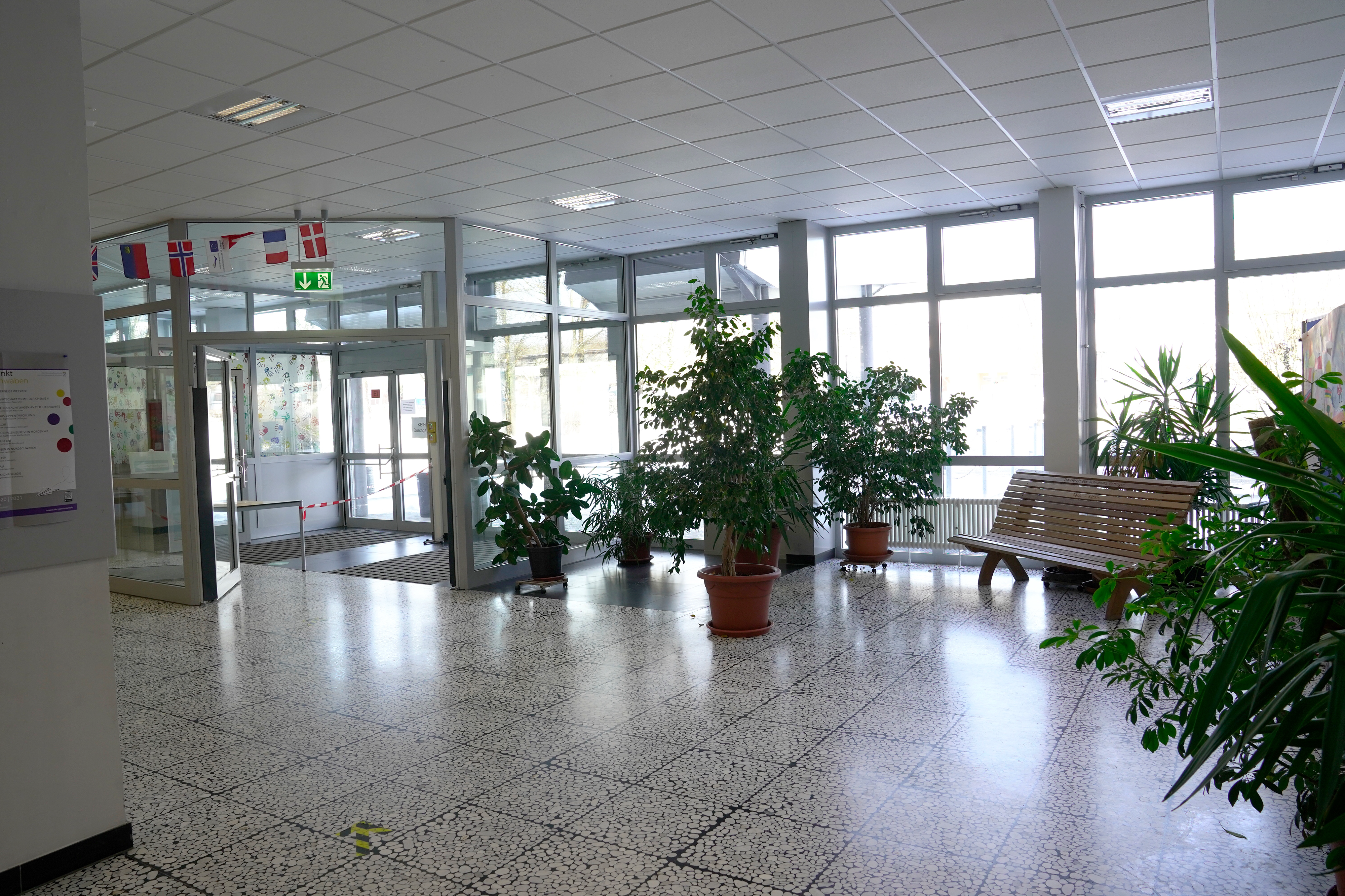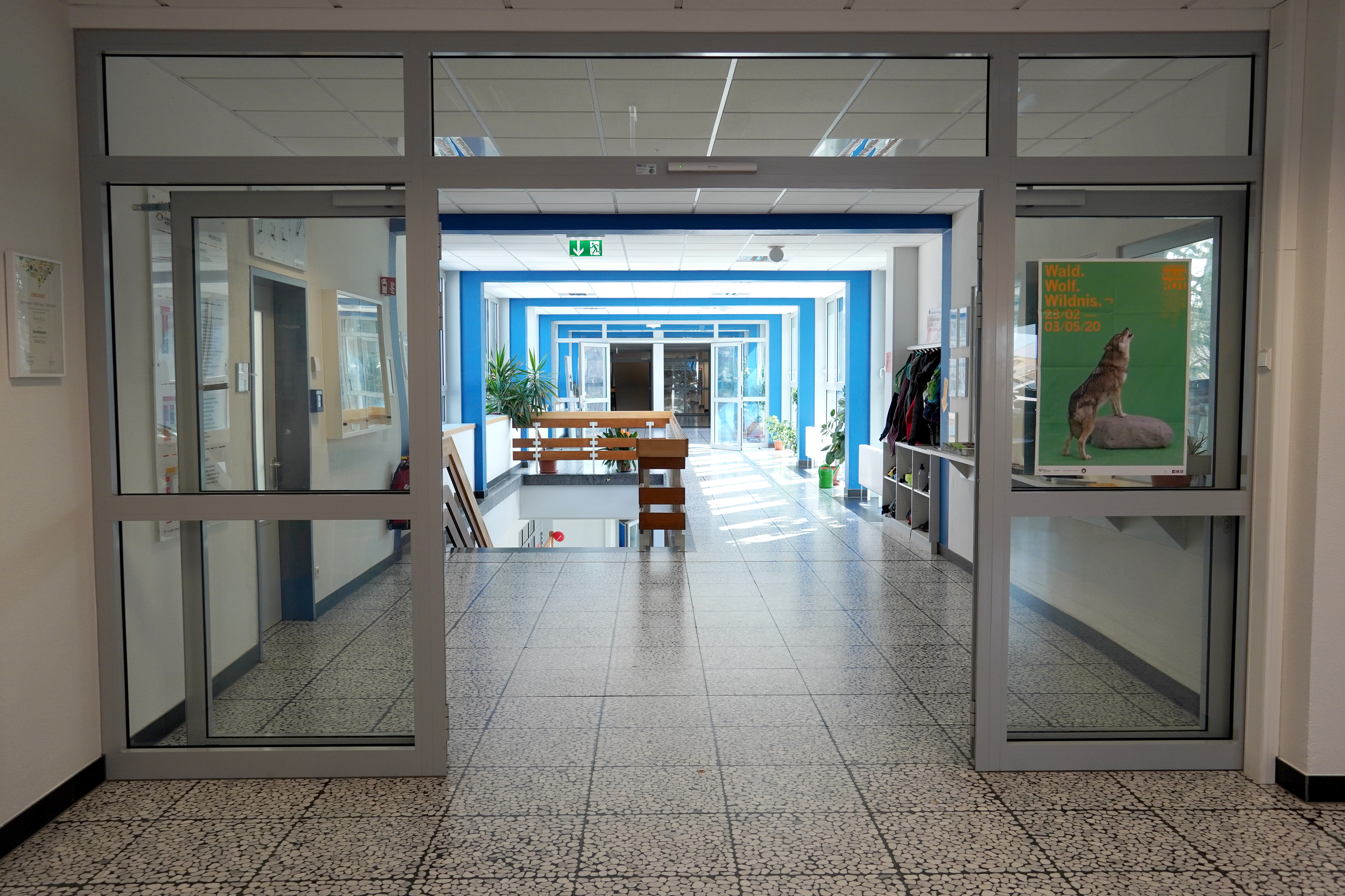 Wir beginnen unseren kleinen Rundgang auf unserer schönen Wiese direkt vor der lichtdurchfluteten Mensa. Durch den Haupteingang betreten wir das Schulhaus.