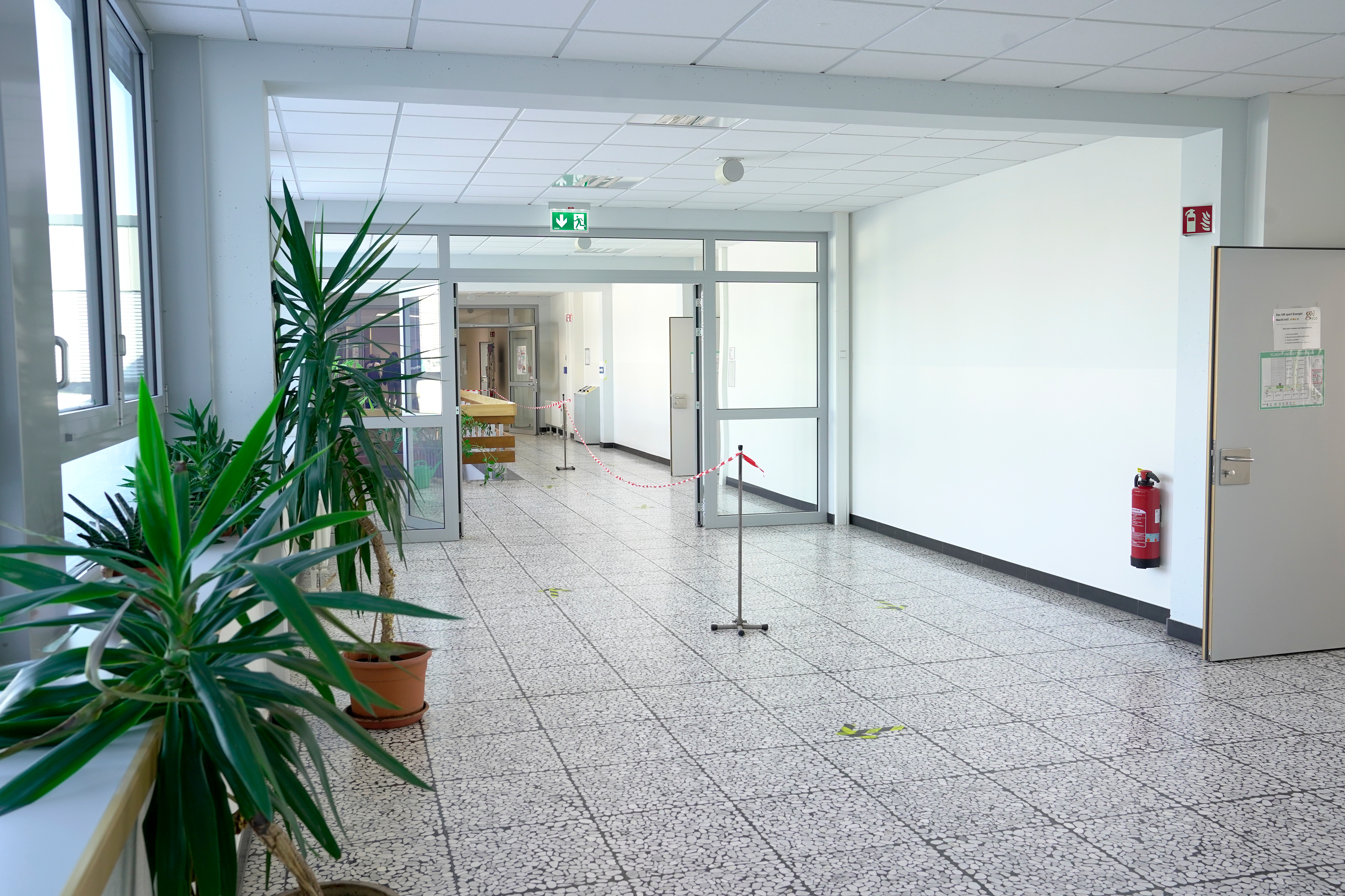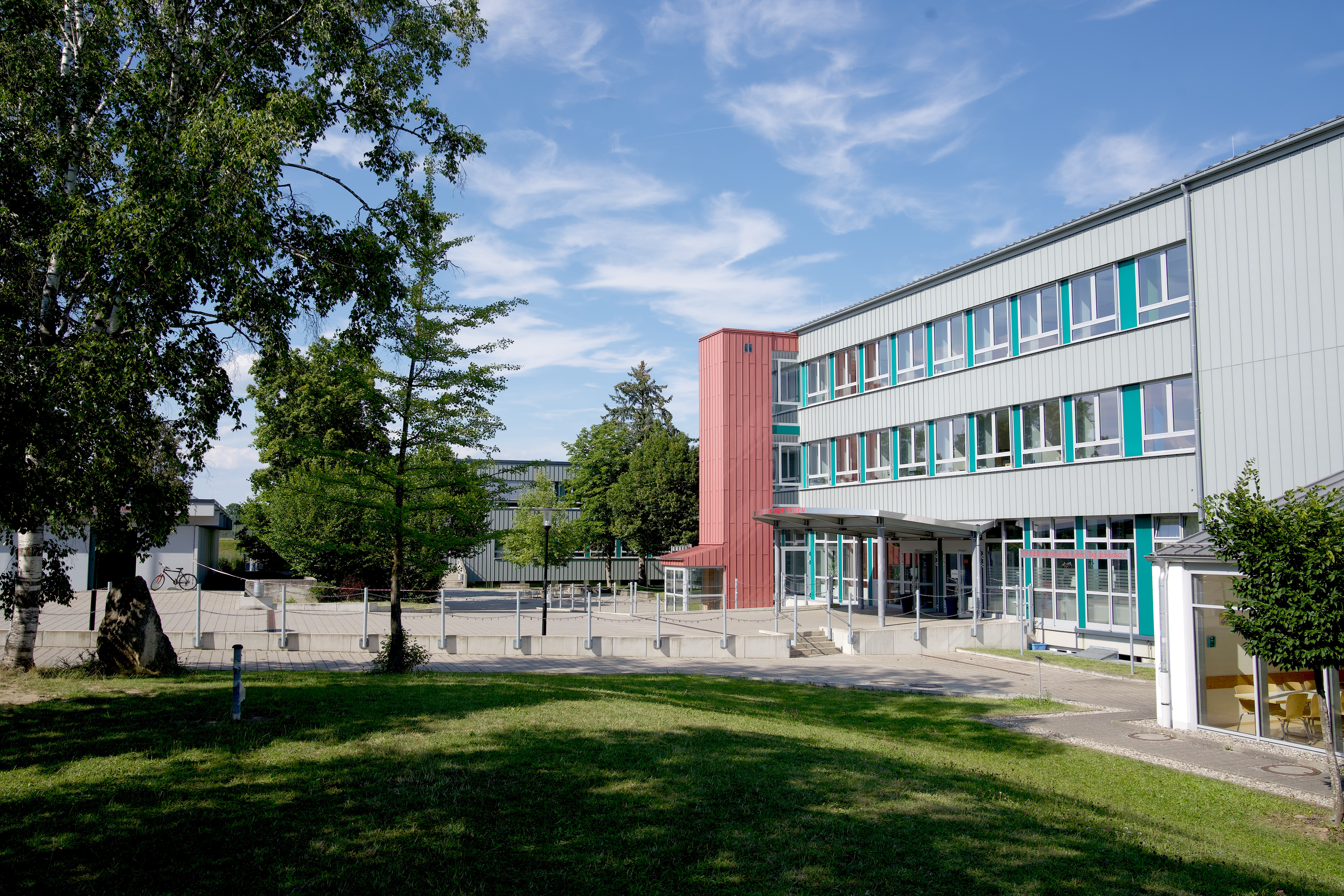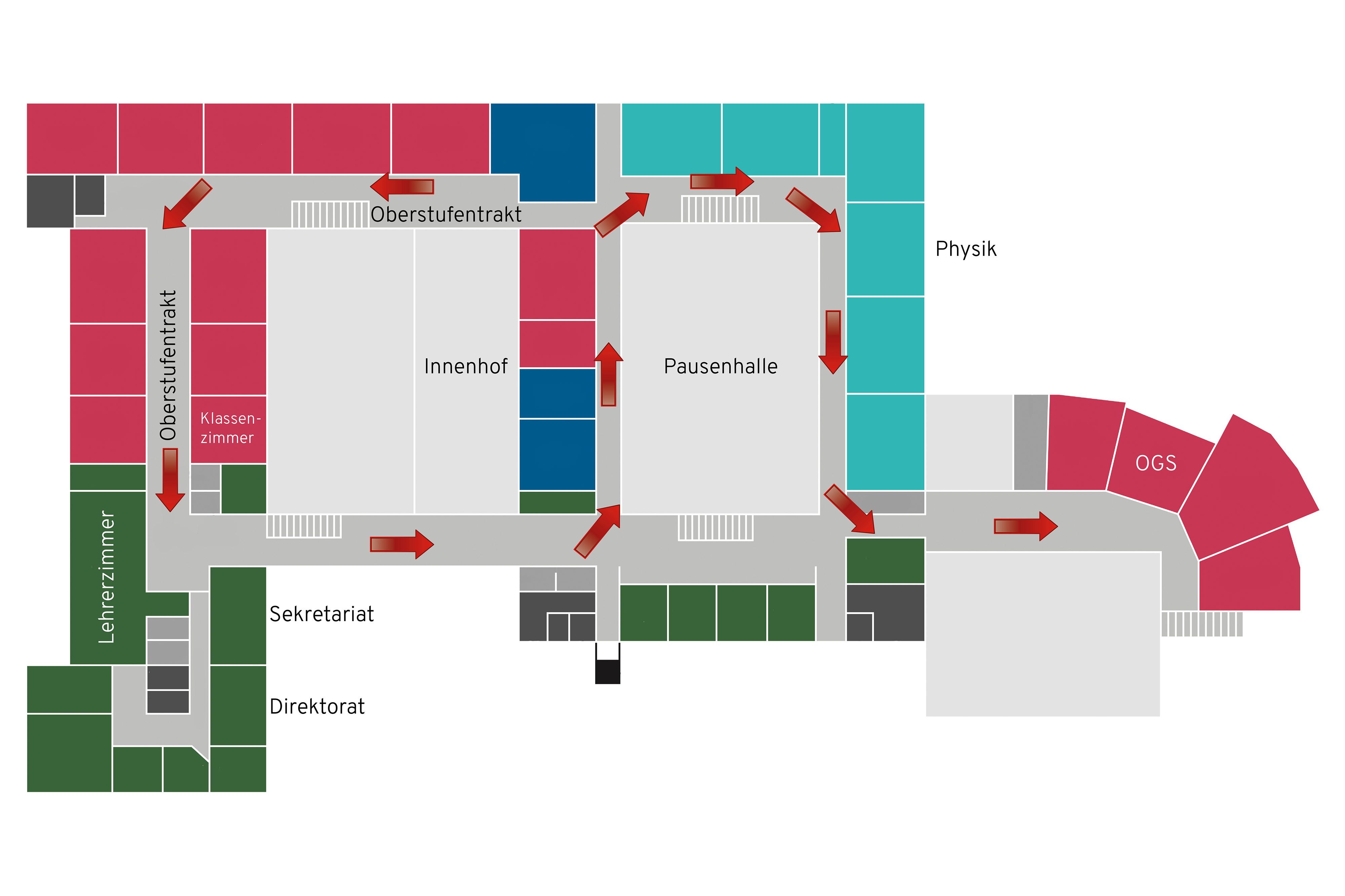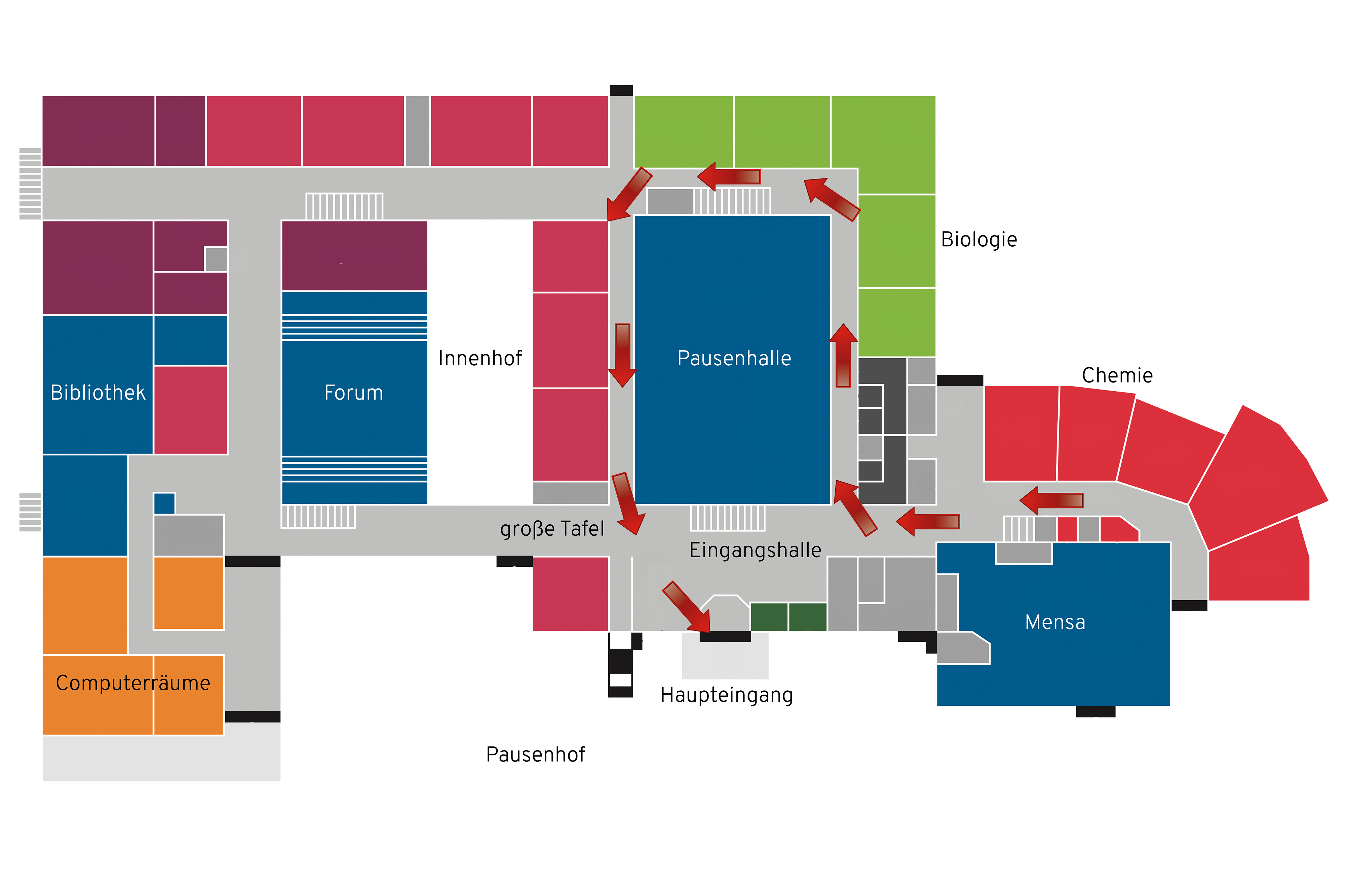 Wir beginnen unseren kleinen Rundgang auf unserer schönen Wiese direkt vor der lichtdurchfluteten Mensa. Durch den Haupteingang betreten wir das Schulhaus.