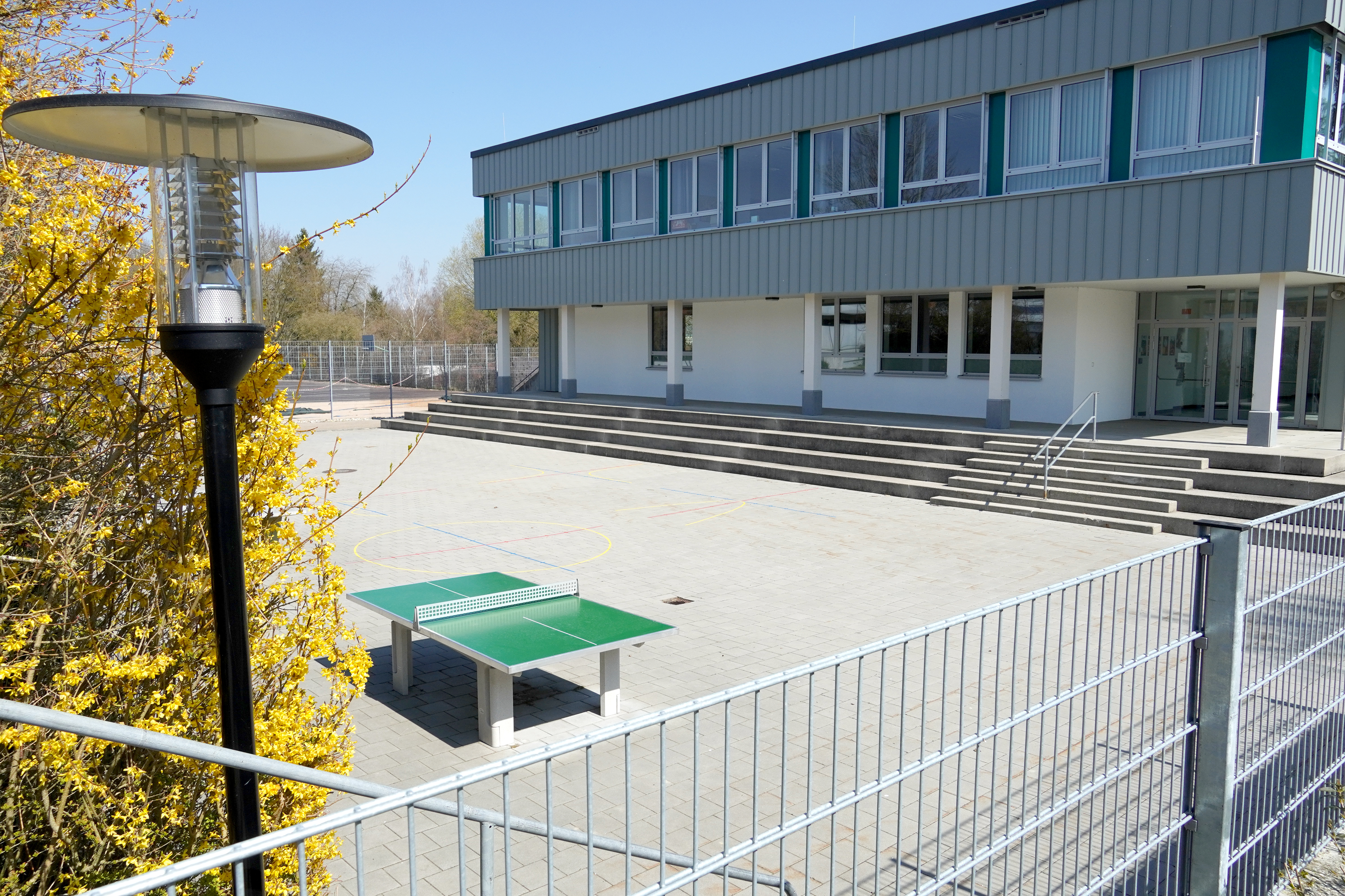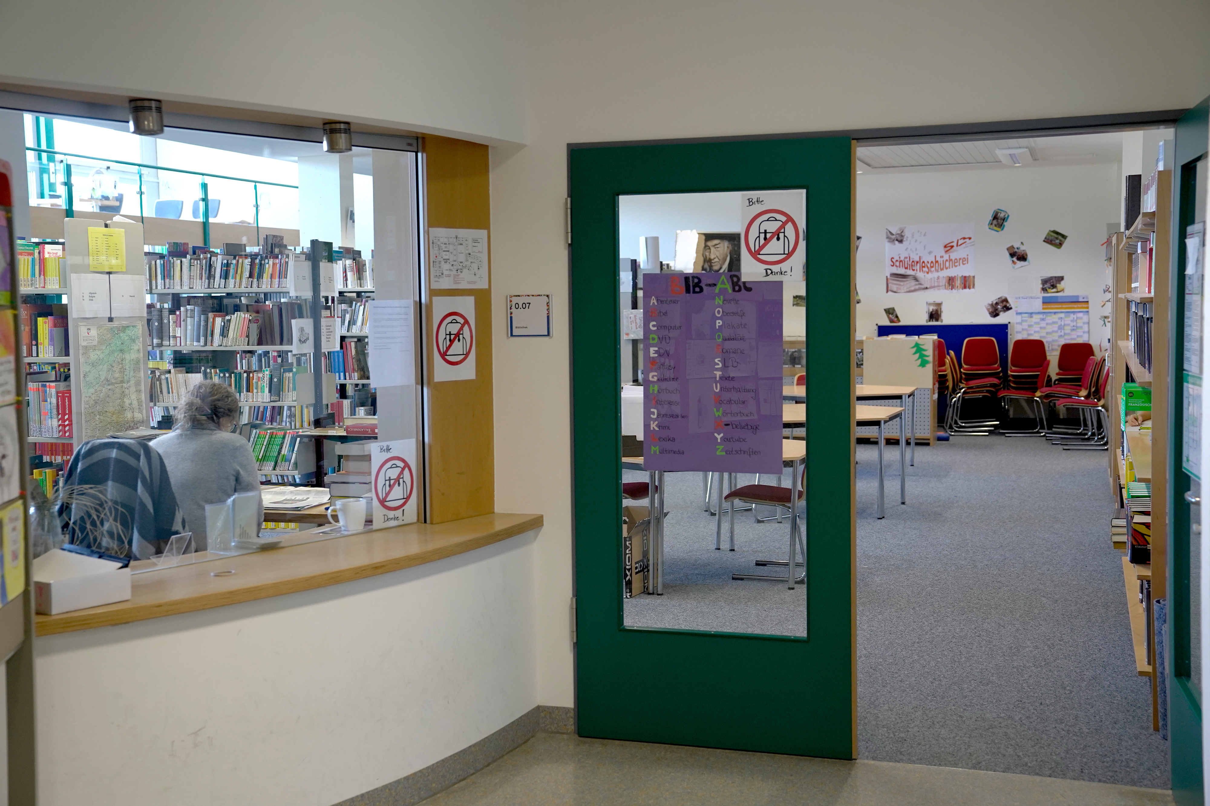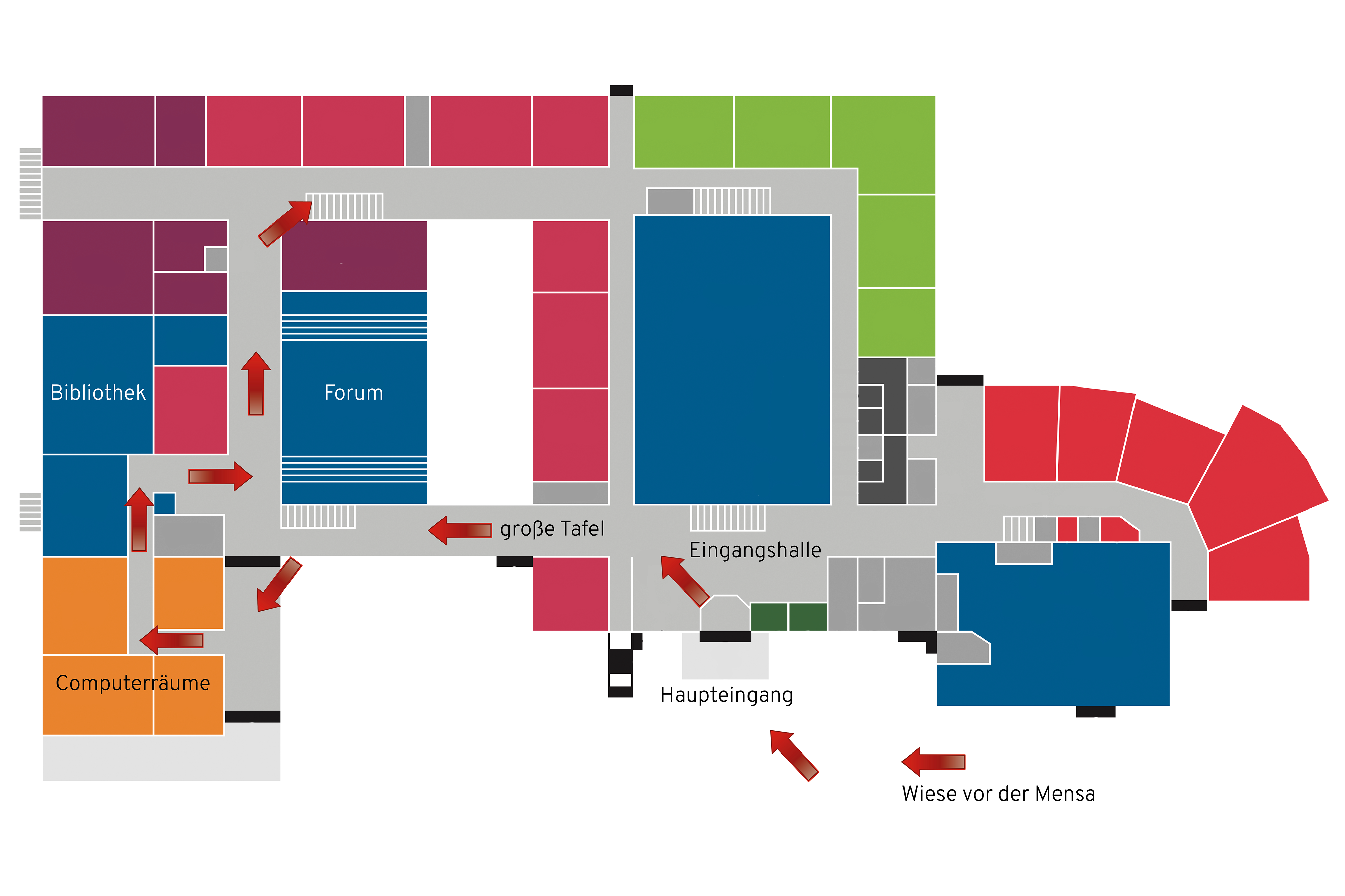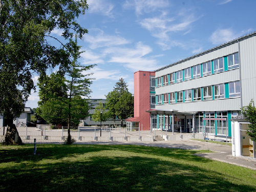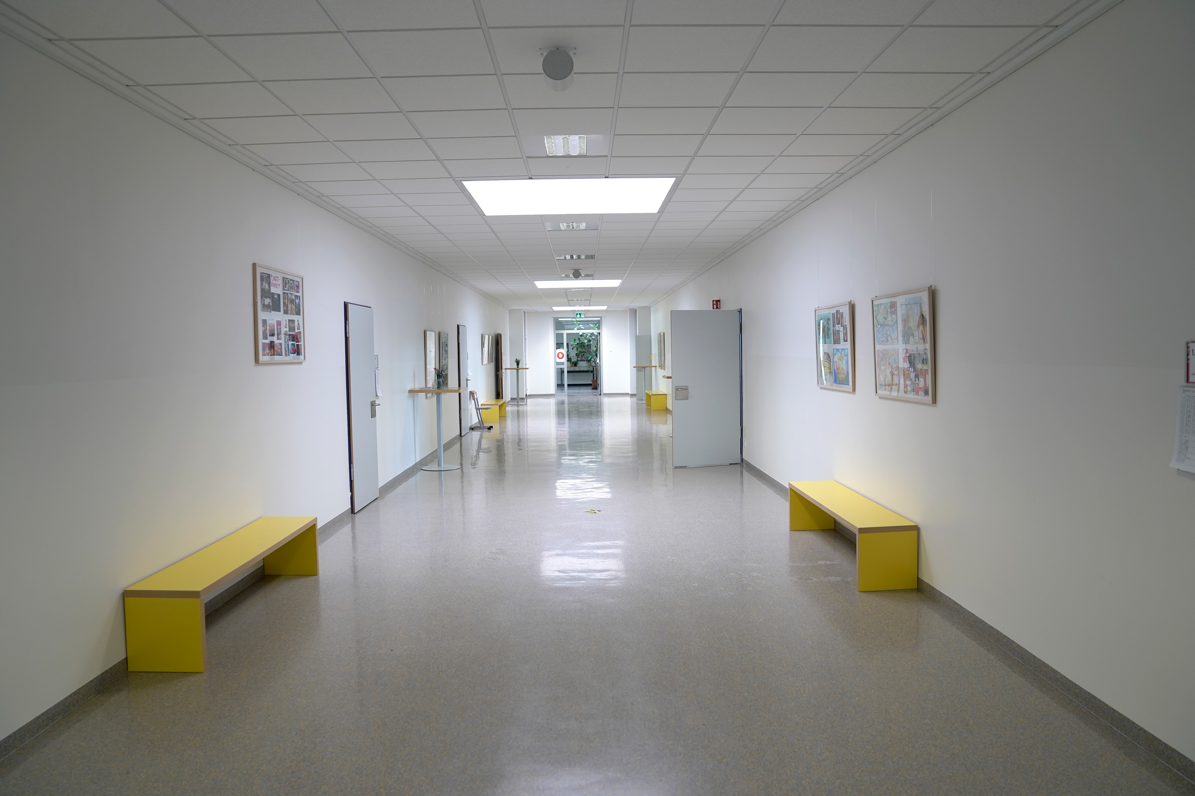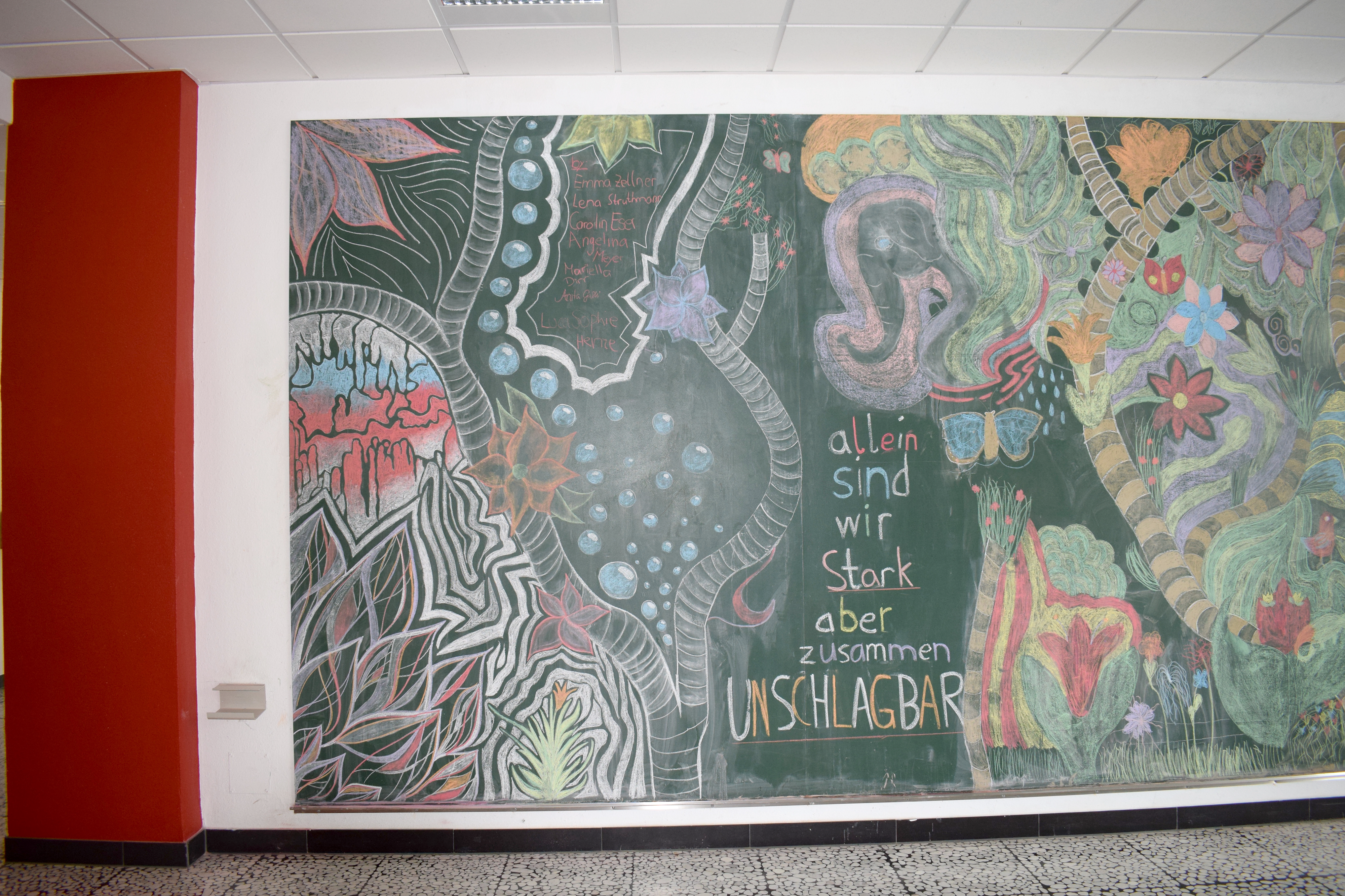 Wir beginnen unseren kleinen Rundgang auf unserer schönen Wiese direkt vor der lichtdurchfluteten Mensa. Durch den Haupteingang betreten wir das Schulhaus.