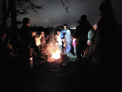 Andrej begrüsst die Ameisli-Kids, beginnt mit einem Gebet und das Ameisli-Lied wird gesungen. Bald ist Zvieri-Zeit, es gibt Schöggeli, Erdnüsse und Mandarinen, die uns die nötige Energie für die kleine Wanderung in den «Ameisliwald» geben. Danach wird das Rätsel gelöst, wer ich bin und warum ich heute hier bin. Auf dem Weg dorthin frage ich ein Ameisli, was es am Nachmittag am liebsten mag. Ziemlich direkt die Antwort: die «Show», welche die LeiterInnen jeweils machen. Ich überlege, was sie damit meint, frage nach, ob sie die biblische Geschichte meint. Was für ein Treffer! Im Wald angekommen, gibt es ein Spiel, bei dem sie Fackeln gewinnen können, die sie später brauchen. Alle Gruppen waren super! Kurze Zeit später gibt es Abendessen, «Älplermakkaroni» über dem Feuer zubereitet! Und warmen Punsch.