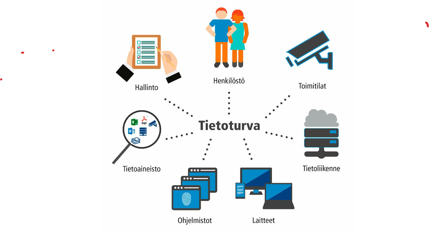 - Toimitilojen tietoturva: Toimitilojen ja laitteiden fyysinen suojaaminen.