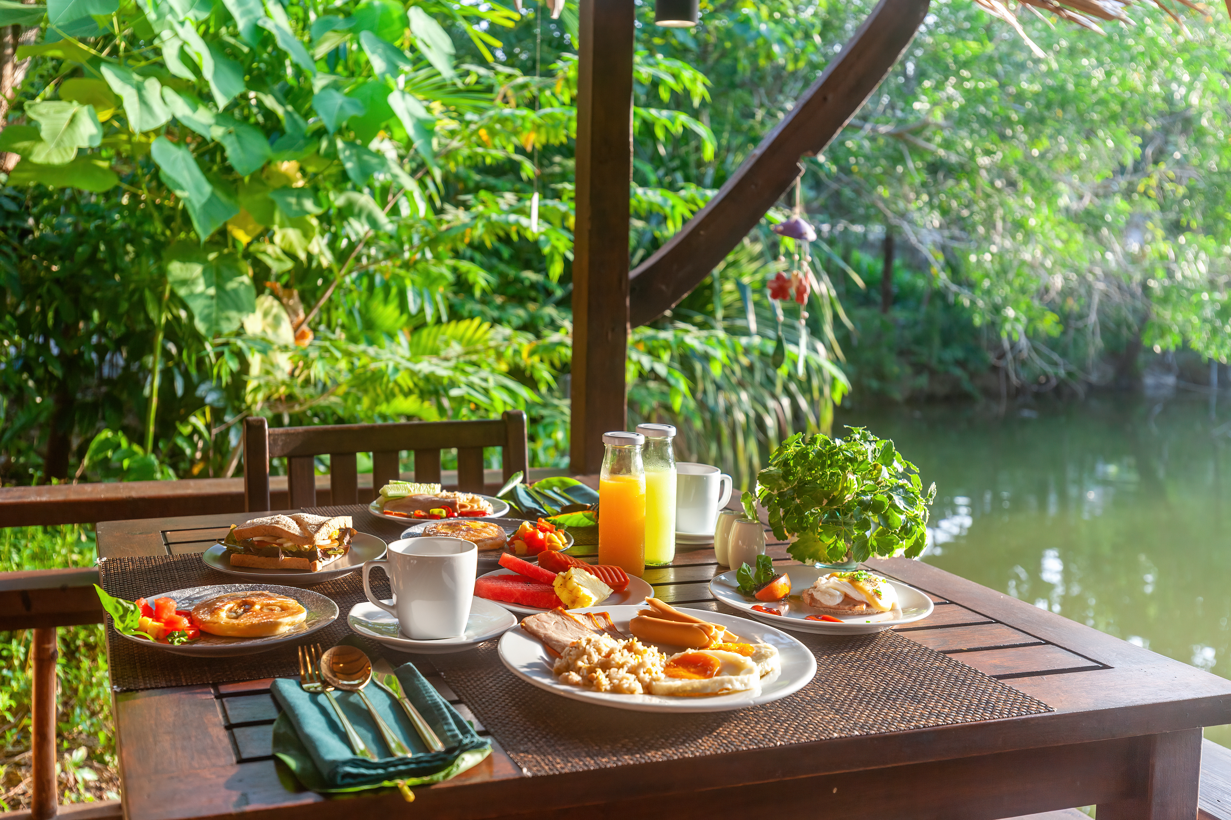 Created with images by TravelMedia - "Restaurant near a beautiful lake in Asia. Enjoy a tasty and nutritious breakfast spread with a variety of dishes like sandwiches, eggs, and fresh fruits." • phpetrunina14 - "woman transfuse smoothie to glass. healthy food concept" • Sebastian - "Indian students engaging in a yoga session on campus, promoting wellness and mindfulness in their daily lives. Generative Ai."