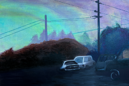 My work is a critique of our modern landscape. With paintings depicting utility poles, streetlights, and roads, they are juxtaposed with natural elements, forming landscapes that, while visually striking, challenge traditional notions of what makes a landscape desirable. Rather than celebrating untouched nature, I am interested in the ways human-made structures impose their own aesthetic and meaning. Looking ahead, I aim to further develop this theme by continuing to create vast, empty spaces where these structures serve as the only focal points—highlighting their role in reshaping the natural world. When people see my work in a gallery, I want them to try to look past the wires, poles, and lights in an attempt to admire a landscape that no longer wholly exists. If they try to do this, I hope in that essence I can get my point across and reshape their constructs of the traditional landscape.