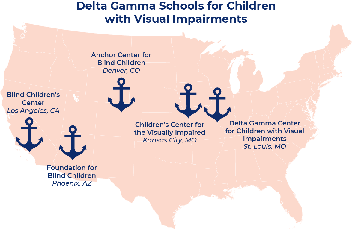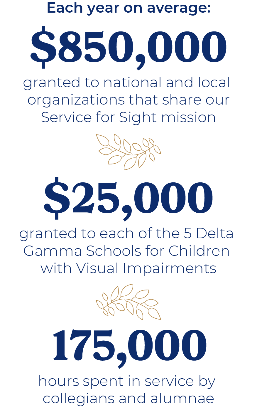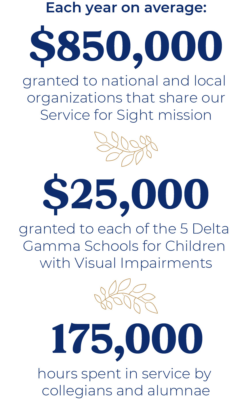 For generations, Delta Gammas have promoted sight conservation and eye health and have been advocates for people in the blind and visually impaired community. Your gifts provide the tools and support people need to achieve their full potential. We are all touched by the issue of sight impairment or loss. From eye diseases as we age, to eye injuries, the Foundation supports education and research to maintain and preserve sight.