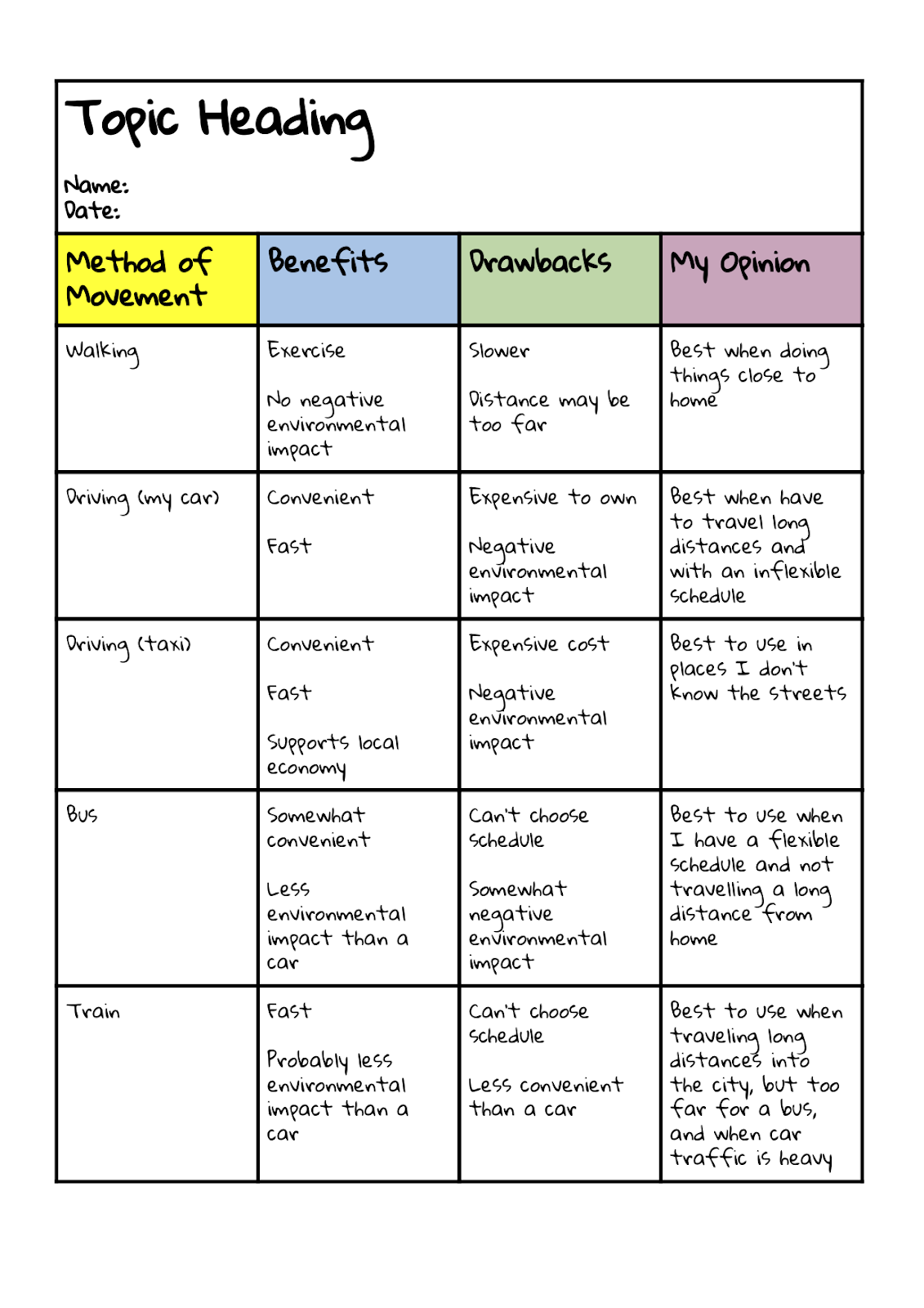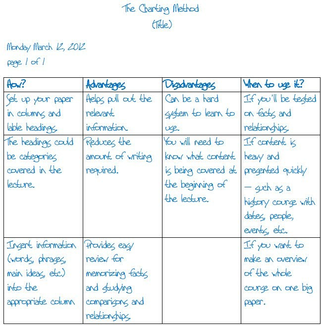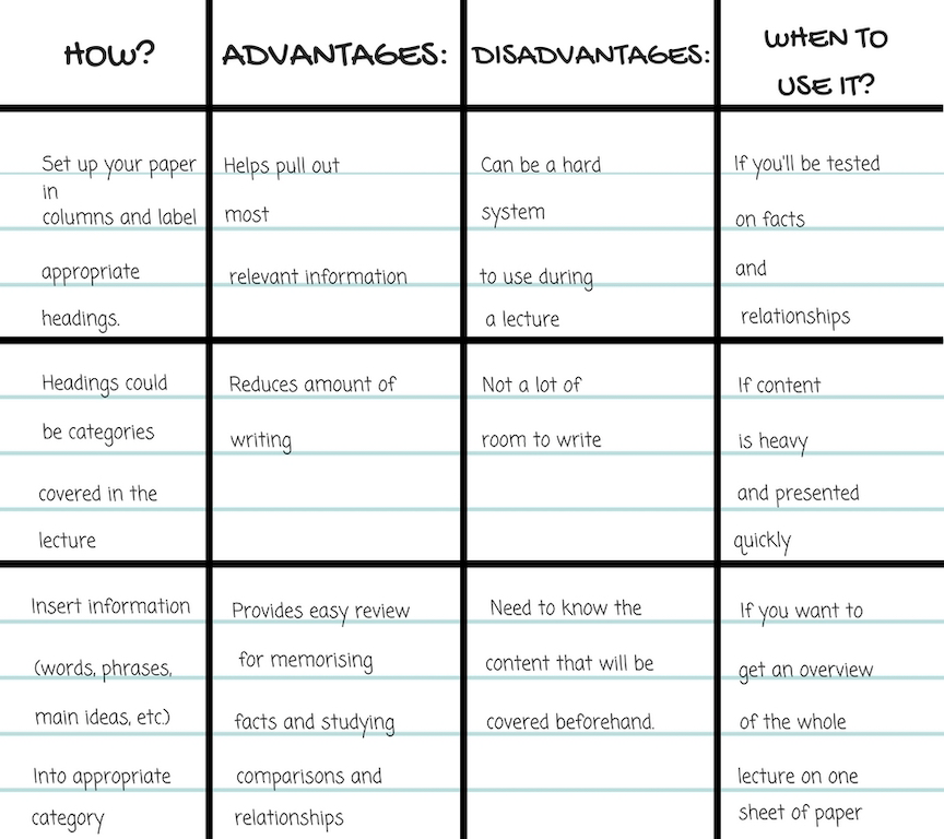 WHAT: This method involves using a table to organize certain notes by category for efficient comparison and memorization. HOW: Make a table, with each row and column assigned a single category or topic. Fill in squares with relevant information from reading or lecture notes. WHEN: When multiple items or concepts are compared simultaneously, or when one topic is dissected into multiple parts.
