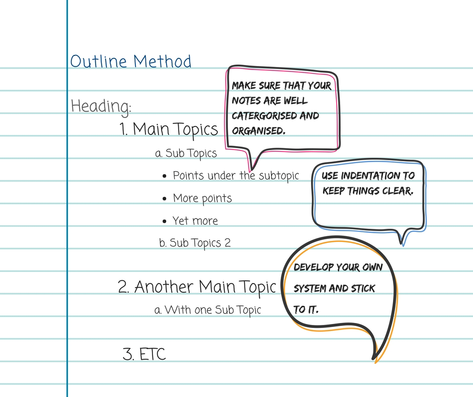 WHAT: This big-picture method involves organizing your notes by chapter, section, and topic. Think Table of Contents, but filled in with notes. HOW: Create a skeleton of the course lesson structure found in your textbook’s table of contents, course syllabus, or course schedules. Copy over headings, bullet points, and indentations to ensure a perfectly organized home for future notes. WHEN: Outlining works for classes that follows a clear lesson structure, except those involving lots of graphs or formulas, like math or chemistry.