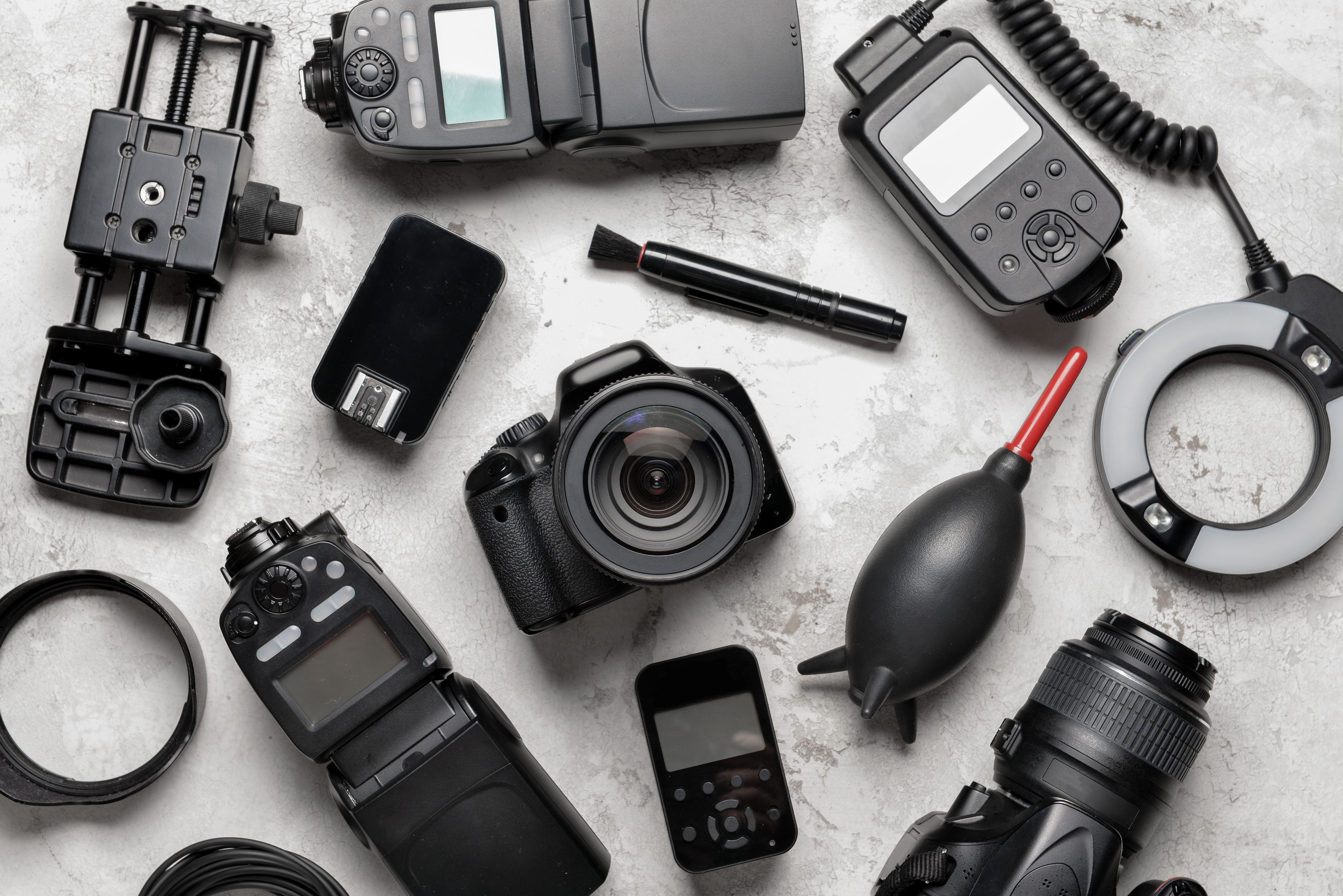 Created with images by Adam Rhodes - "Photography wallpaper, retro digital camera taking photos by photographer" • MG - "Photography Lens" • Pixel-Shot - "Modern photographer's equipment on grey background" • One Pixel Studio - "Retro camera with empty photo frames"
