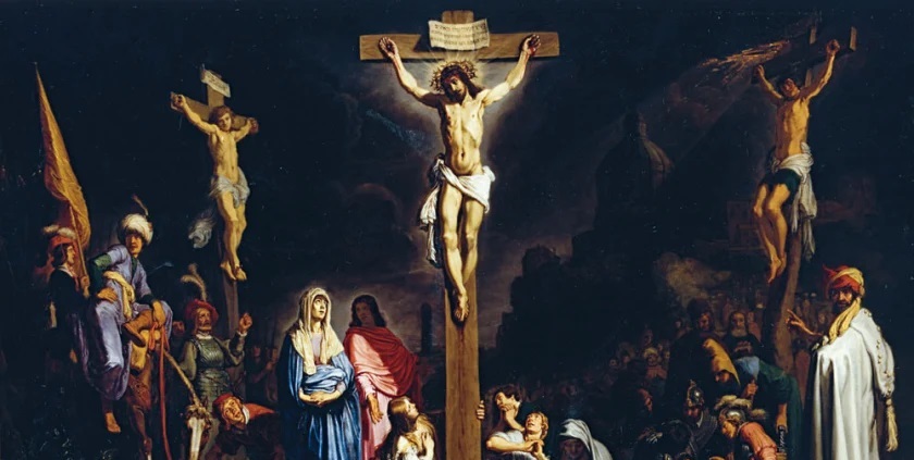 Uno dei malfattori appesi alla croce lo insultava: «Non sei tu il Cristo? Salva te stesso e noi!». L’altro invece lo rimproverava dicendo: «Non hai alcun timore di Dio, tu che sei condannato alla stessa pena? Noi, giustamente, perché riceviamo quello che abbiamo meritato per le nostre azioni; egli invece non ha fatto nulla di male». E disse: «Gesù, ricordati di me quando entrerai nel tuo regno». Gli rispose: «In verità io ti dico: oggi con me sarai nel paradiso».