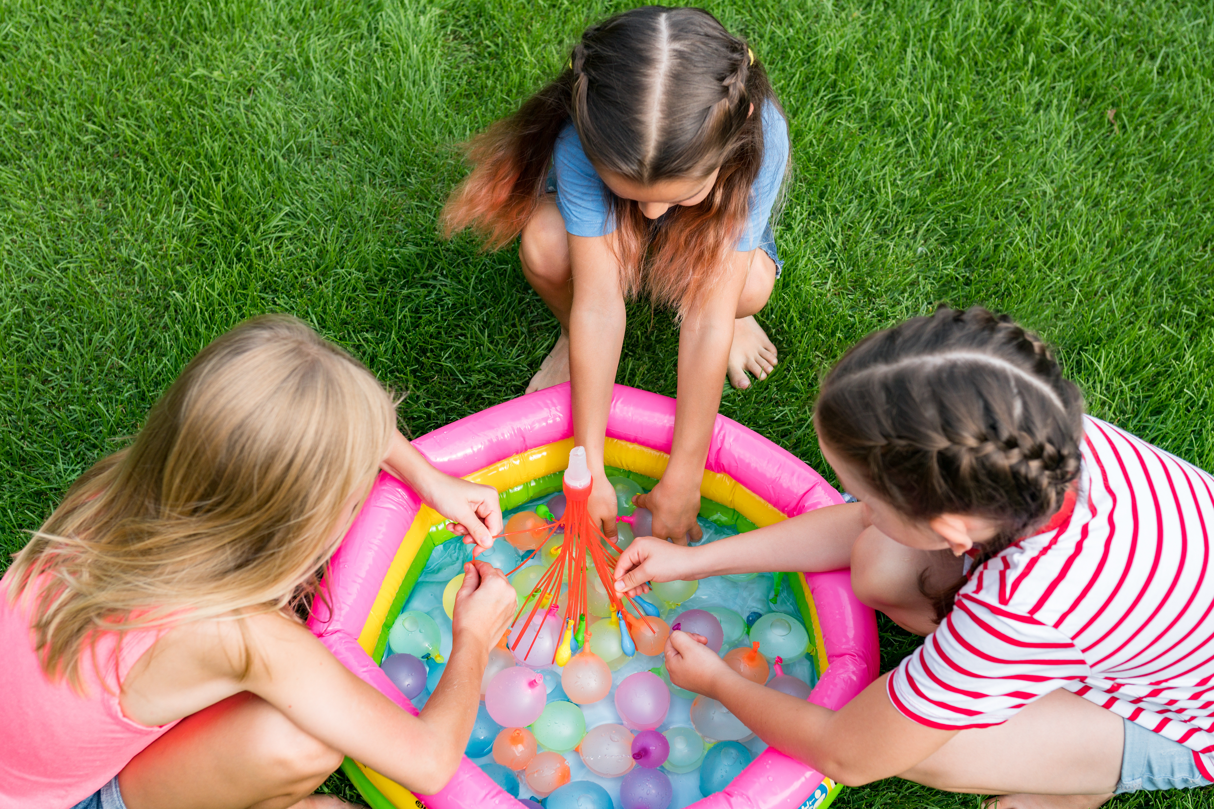 - Water balloon painting- Fill water balloons with watered down washable paint. Lay a large piece of white paper in the bottom of a kiddie pool. Let the kids throw the balloons and create their own splatter art!