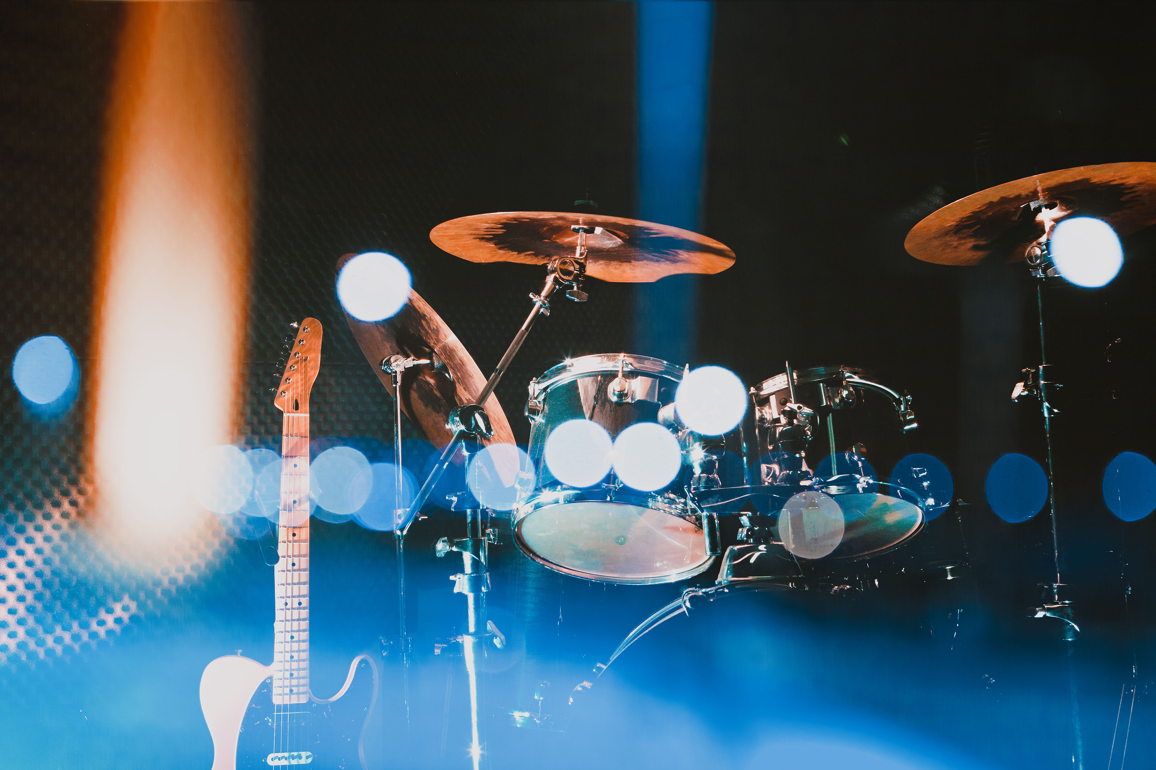Created with images by shintartanya - "piano keys, the pores close up in a creative style" • Intach - "Practice room with drums, guitars, and recording tools, paired with a cozy atmosphere for focused and creative sessions." • Andrew Bayda - "Retro microphone on stage" • C.Castilla - "Drum on stage and festive event. Live music background. Drumset on stage.Concert and show entertainment" • Kozlik_mozlik - "An empty stage of the theater, lit by spotlights and smoke before the performance" • Voloshyn Roman - "Stage, concert light."