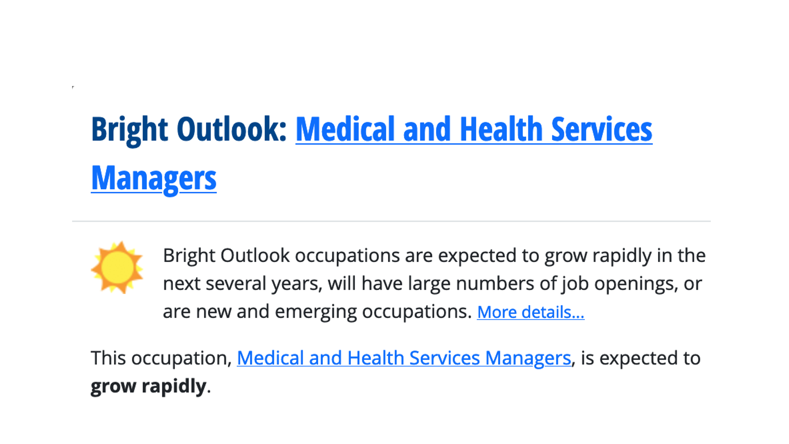 - Bureau of Labor Statistics, U.S. Department of Labor, Occupational Outlook Handbook, Medical and Health Services Managers, at https://www.bls.gov/ooh/management/medical-and-health-services-managers.htm
