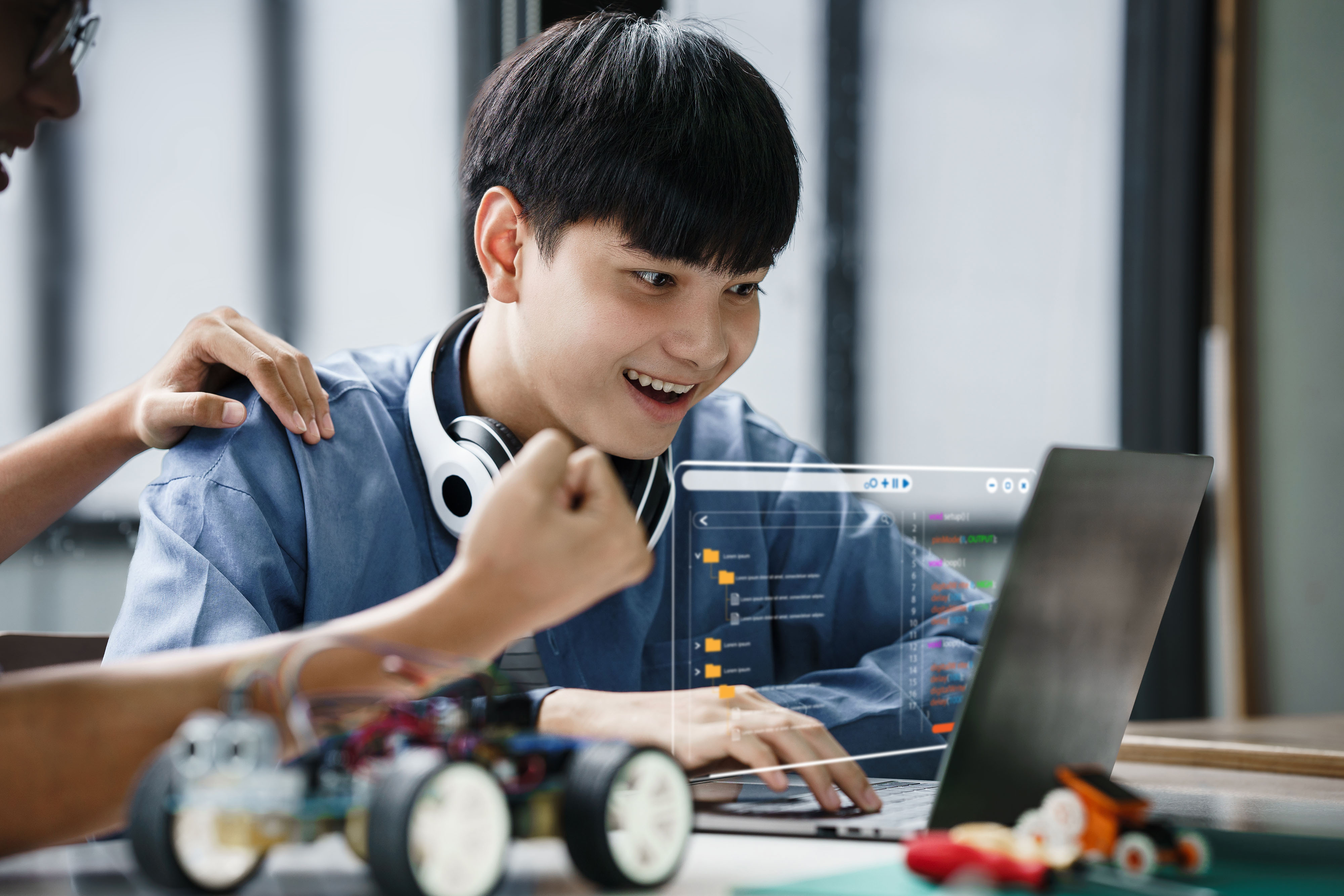 Created with images by Krakenimages.com - "Young hispanic woman covering mouth with cards angry and mad screaming frustrated and furious, shouting with anger. rage and aggressive concept." • Deemerwha studio - "Asian teenager students doing robot arm and robotic cars homework project in house using computers and coding. technology of robotics programing and STEM education concept."