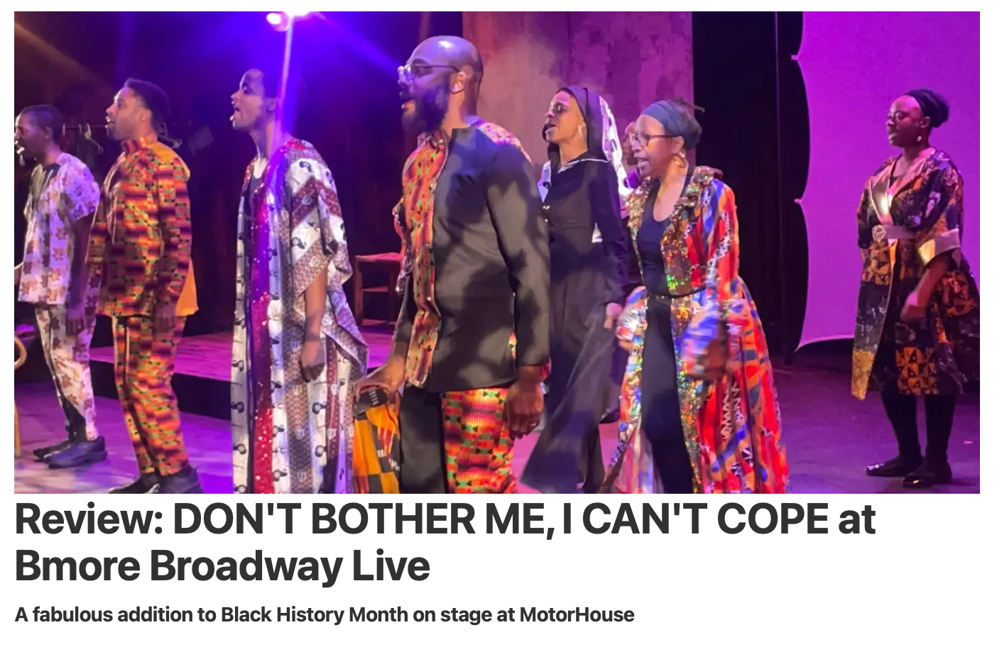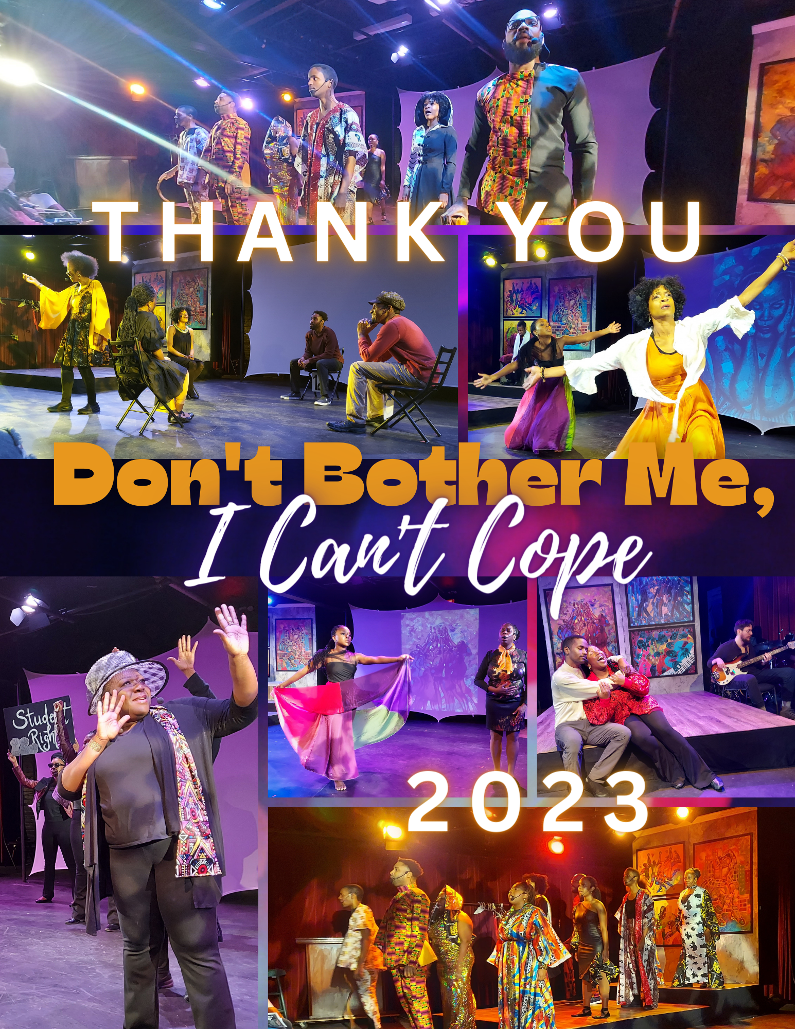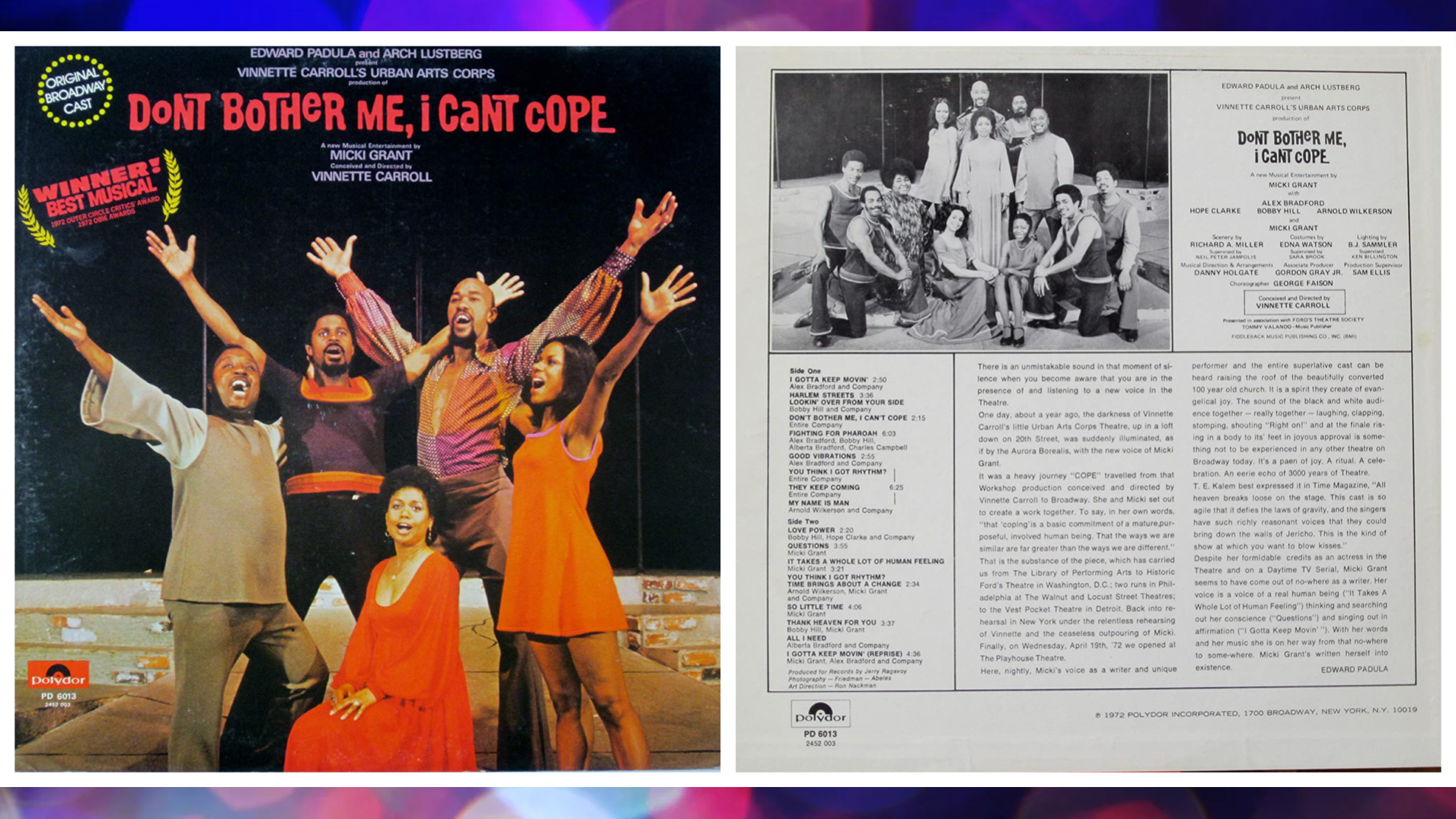 Don't Bother Me, I Can't Cope is a musical revue with music, lyrics, and book by Micki Grant. The music is a mixture of gospel, jazz, funk, soul, and calypso. The show focuses on the African-American experience through vibrant song and dance. The show had Broadway's first Black female director Vinnette Carroll and Micki Grant was the first Black woman to have a show on Broadway in 1972, and win a Grammy for Best Cast Album.
