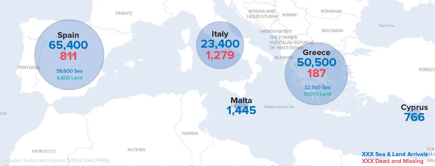 Nel 2018 il numero totale di persone giunte nei Paesi bagnati dal Mediterraneo era di 141.500, ma gli scomparsi o morti in mare sono stati almeno 2.277.