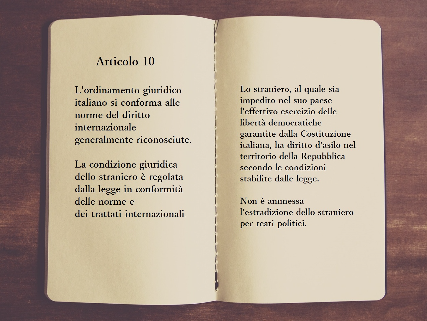 Questo è il testo preparatorio del discorso, relativo all'Articolo 10 della Costituzione Italiana, tenuto al X Convegno della Rete di Scuole Fri.Sa.Li. World, presso la Scuola italiana di Atene il 17 maggio 2019 e presso la Biblioteca del Senato della Repubblica il giorno 4 ottobre del medesimo anno. Il testo finale presentato, a sviluppo prettamente argomentativo, è stato necessariamente adattato e modificato.
