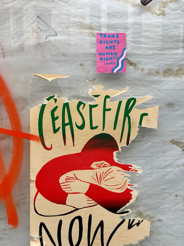 She scrolls to the sticker from earlier: „Ceasefire now“, „Trans Rights are Human Rights“. The words seem to hit her differently now; they seem to have a purpose.