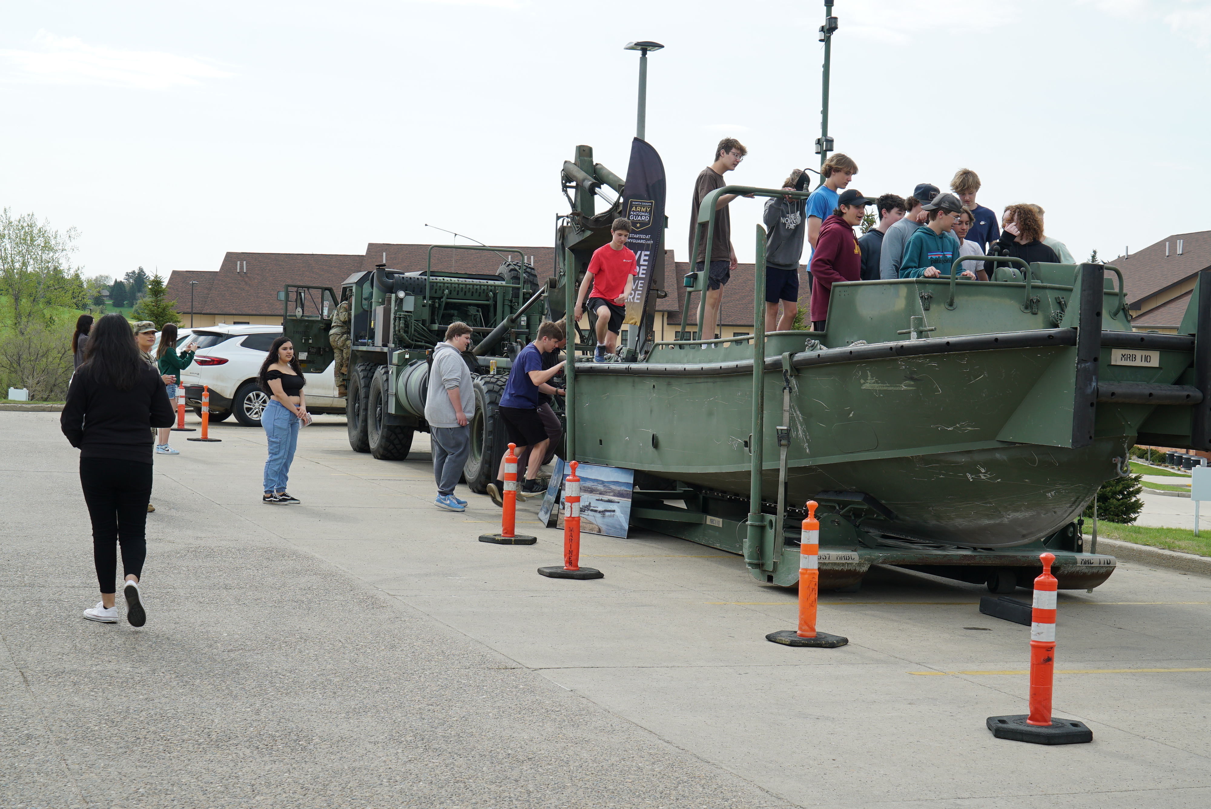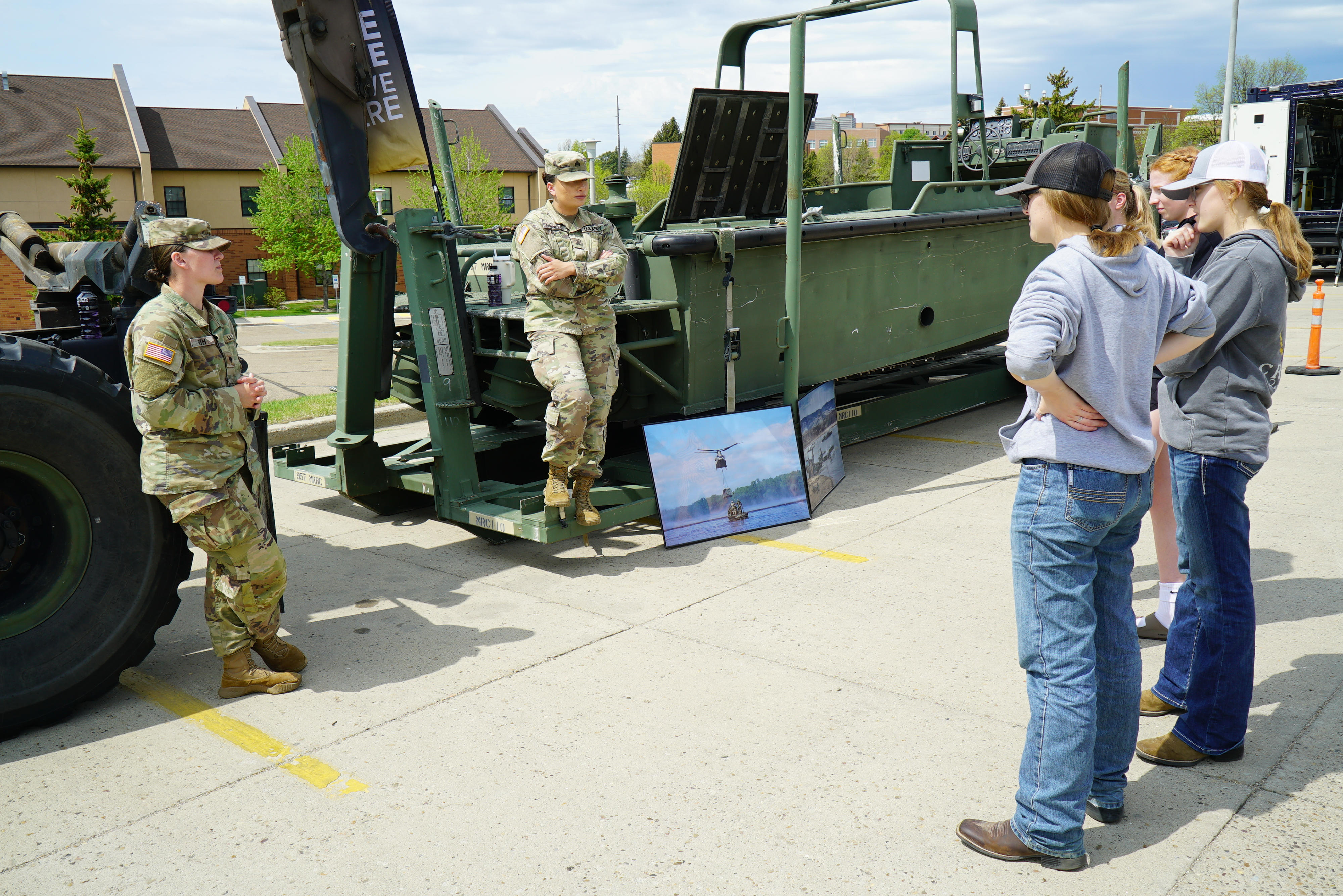 Sgt. Mia Brunelle, 957th Engineer Company (Multi-role Bridge), allows students to explore the Bridge Erection Boat during the Discovery Career Fair at the Bismarck Career Academy, Bismarck State College, May 16, 2023.