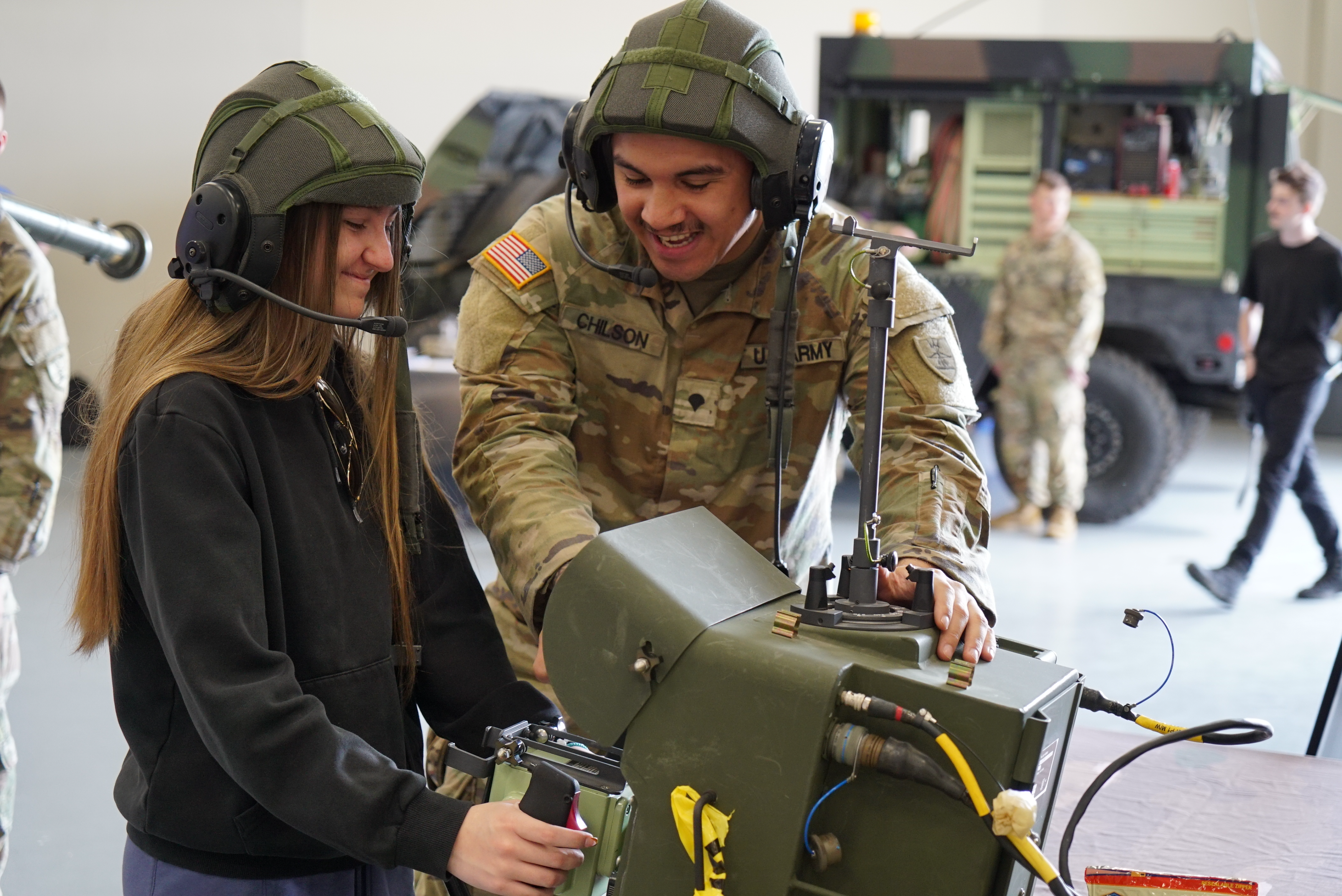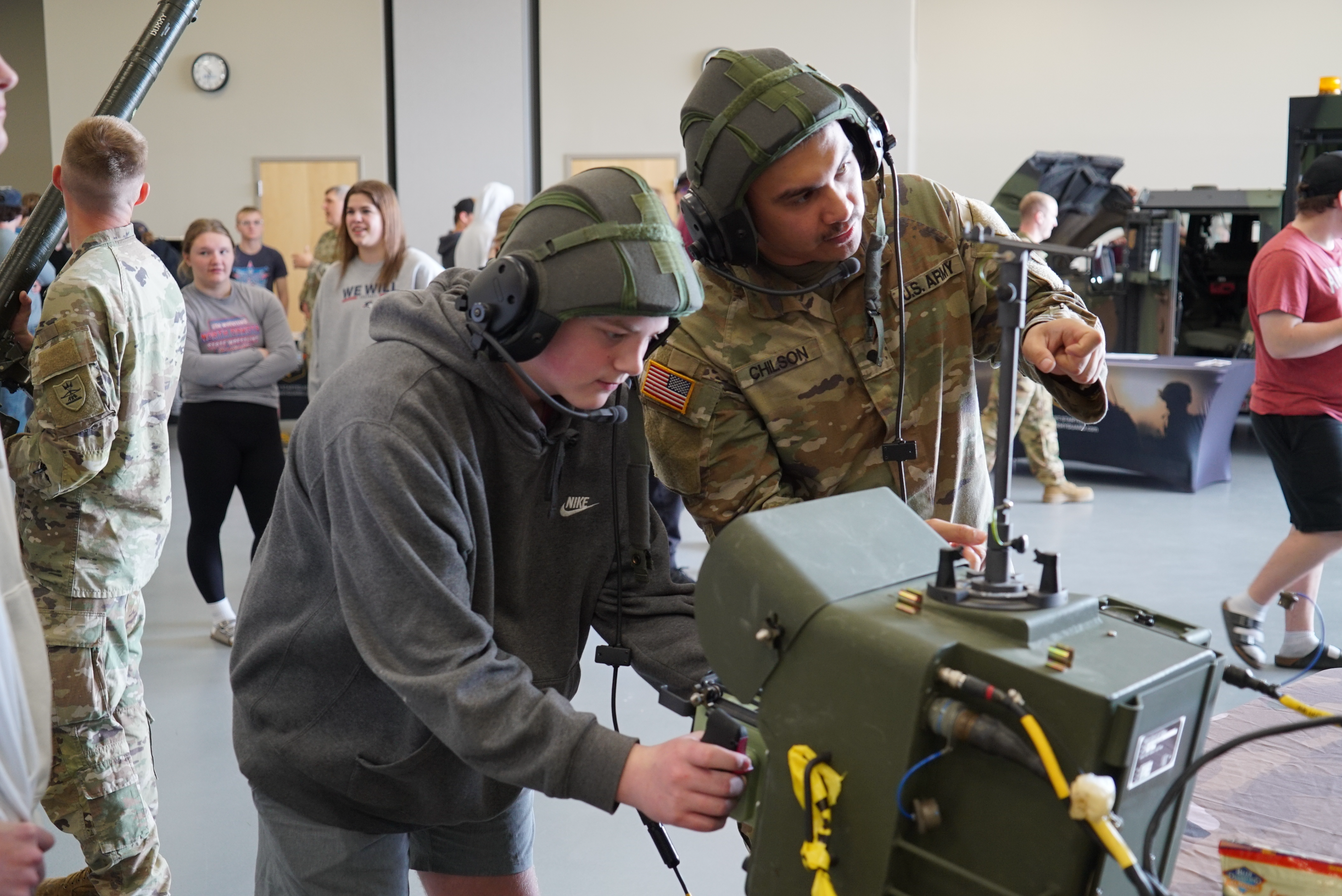 Spc. Mark Chilson, 1st Battalion, 188th Air Defense Artillery Regiment, helps a student operate the controller of an AN/TWQ-1 Avenger Air Defense System during the N.D. Army National Guard sponsored Discovery Career Fair at Bismarck State College, Bismarck, N.D., May 17, 2023. (National Guard photo by Sgt. 1st Class Charles Highland, N.D. National Guard Public Affairs Office)