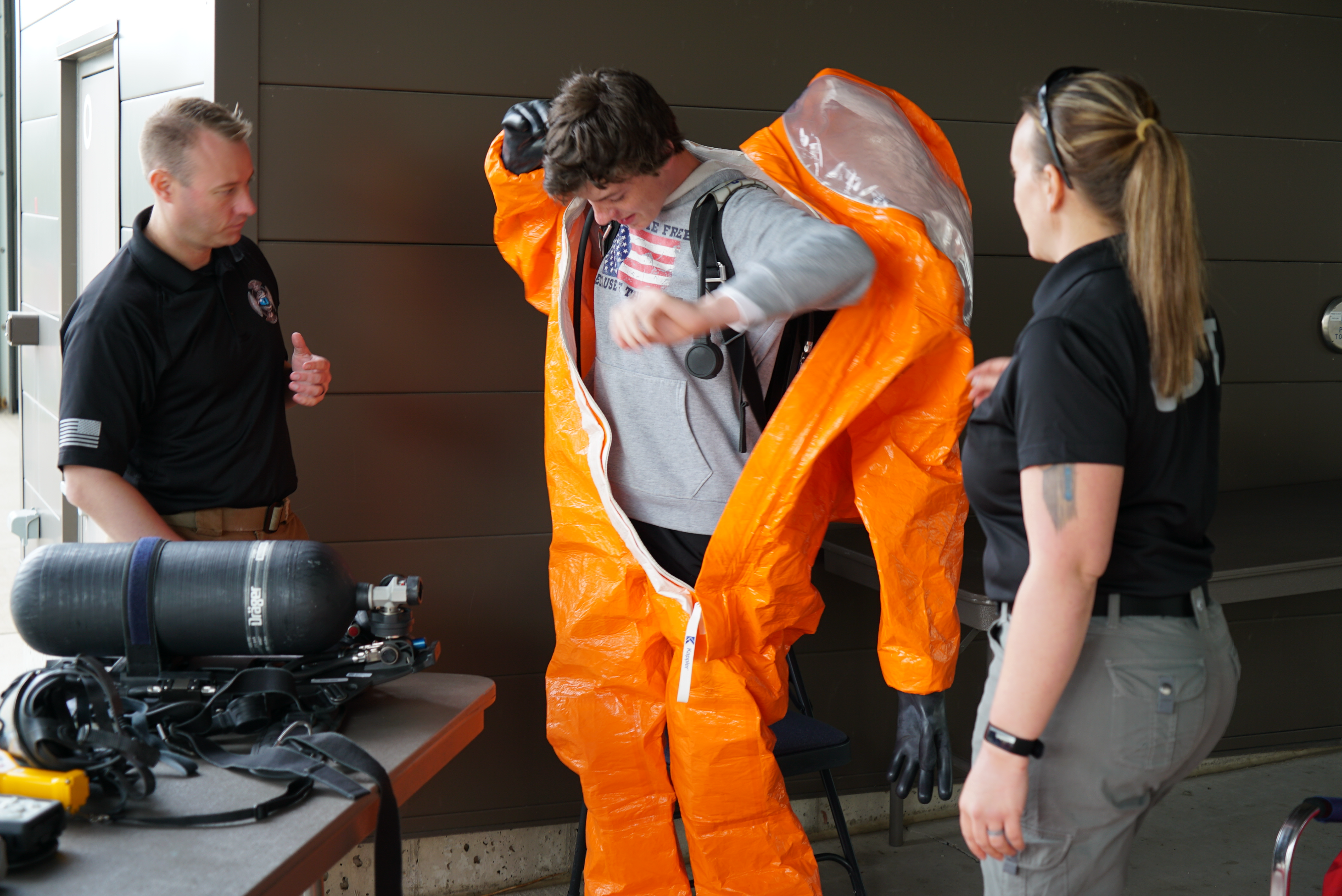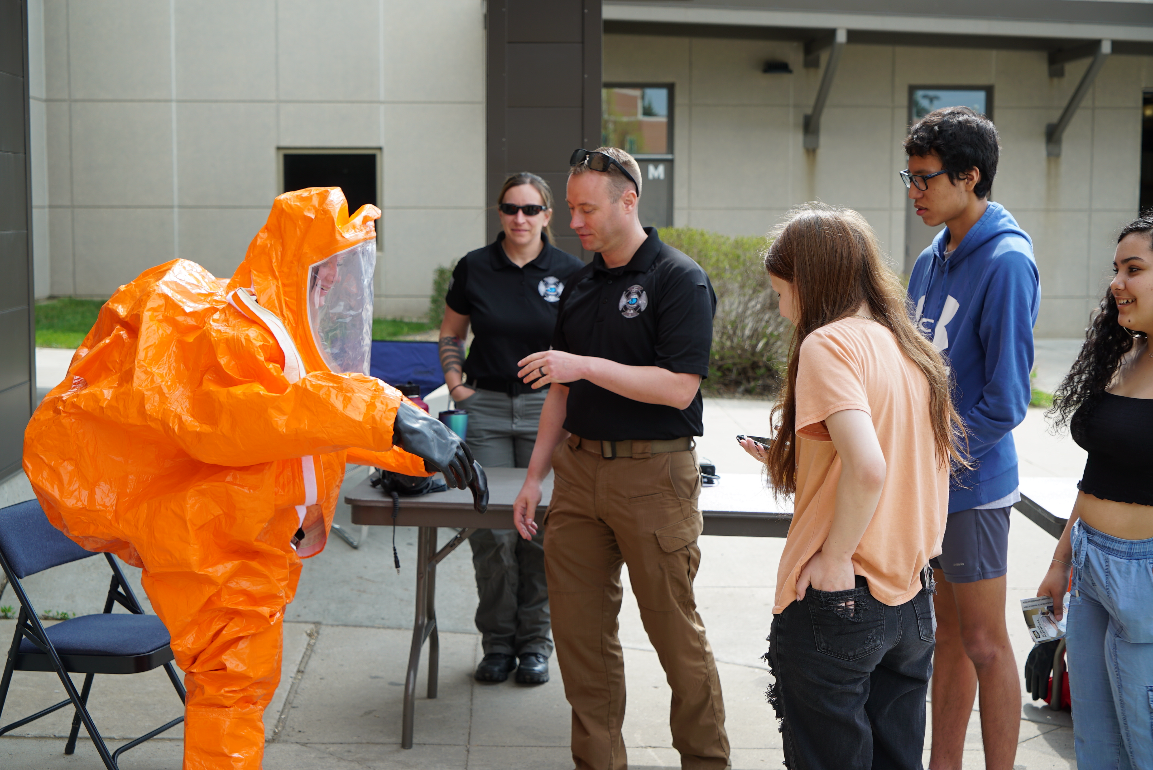 Members of the 81st Civil Support Team allow students to try on protective gear during the Discovery Career Fair at the Bismarck Career Academy, Bismarck State College, May 16, 2023.