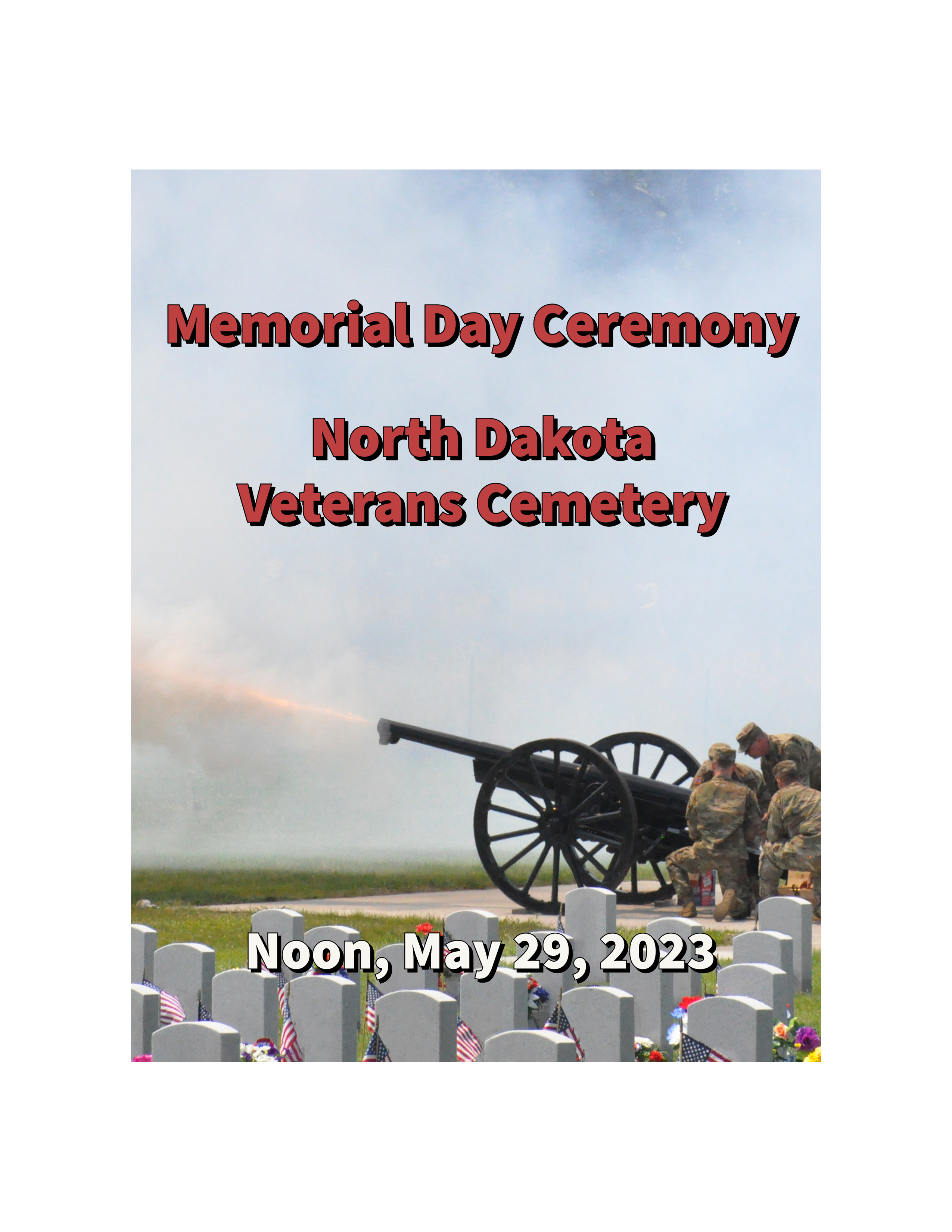 The 2023 Memorial Day ceremony at the N.D. Veterans Cemetery will be conducted on May 29 beginning at noon. Approximately 30 minutes after the ceremony concludes, there will a ground breaking for the cemetery's columbarium. The columbarium is scheduled to be completed October 2023. The main ceremony will be livestreamed at www.NDGuard.ND.Gov.