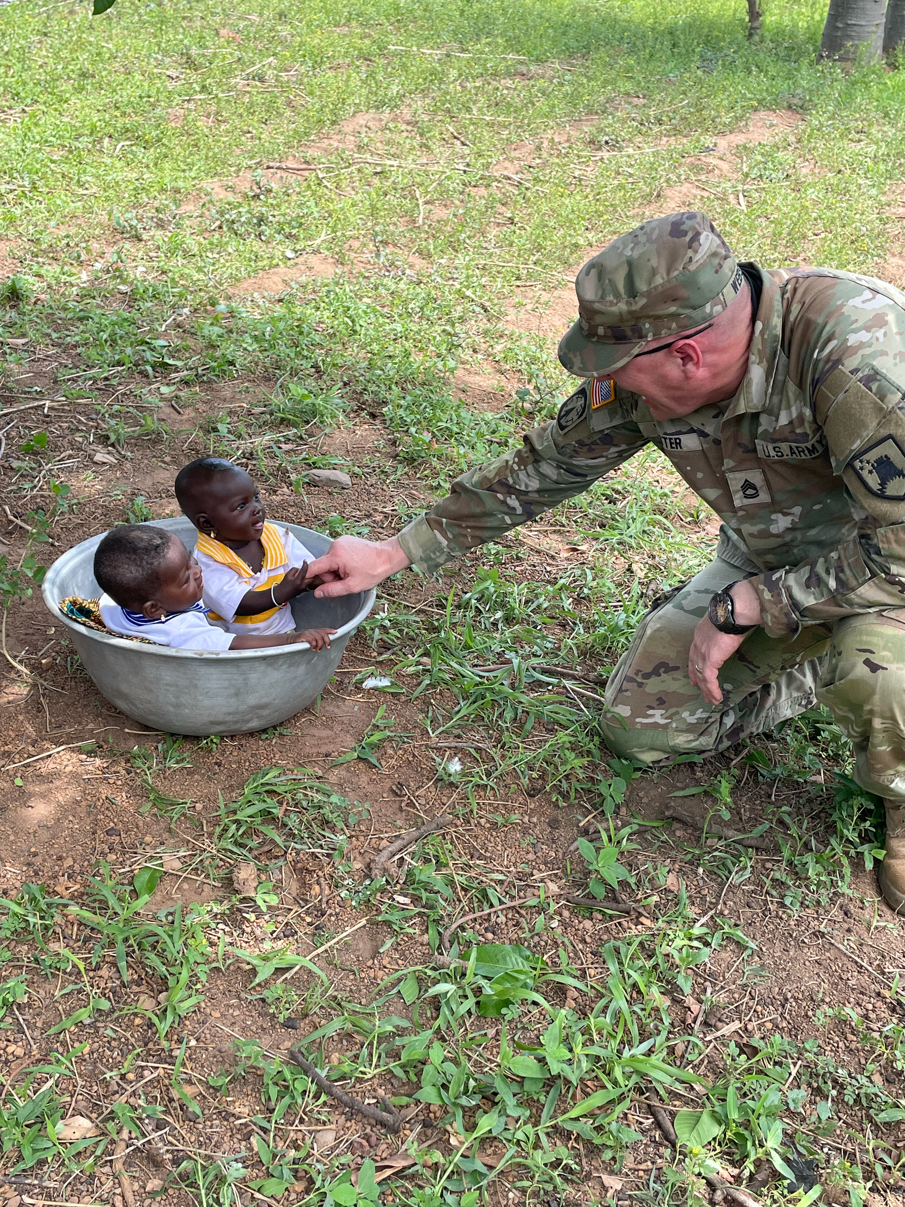Sgt. 1st Class Tom Webster interacts with Togolese twins during a medical outreach engagement which occurred in the Dankpen Prefecture, near Kara, Togo, May 7, 2023.