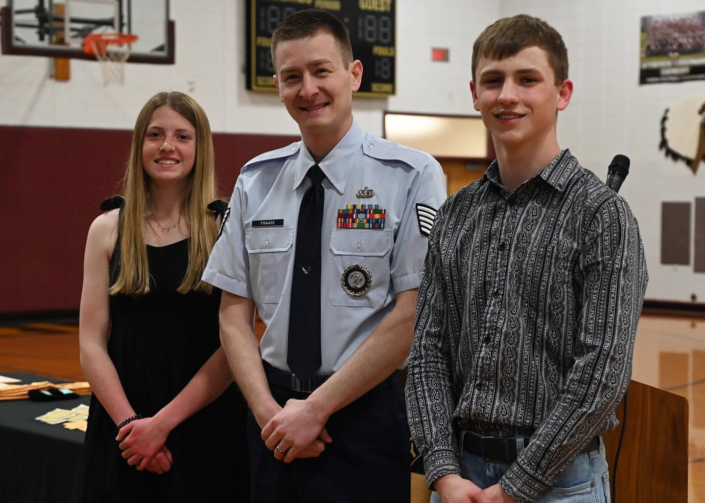 Left to right, Tarah Heley, Tech Sgt. Matthew Fraase, N.D. Air National Guard production recruiter, and Jack Manstrom, after an awards ceremony at Wyndmere High School, Wyndmere, N.D., May 11, 2023.