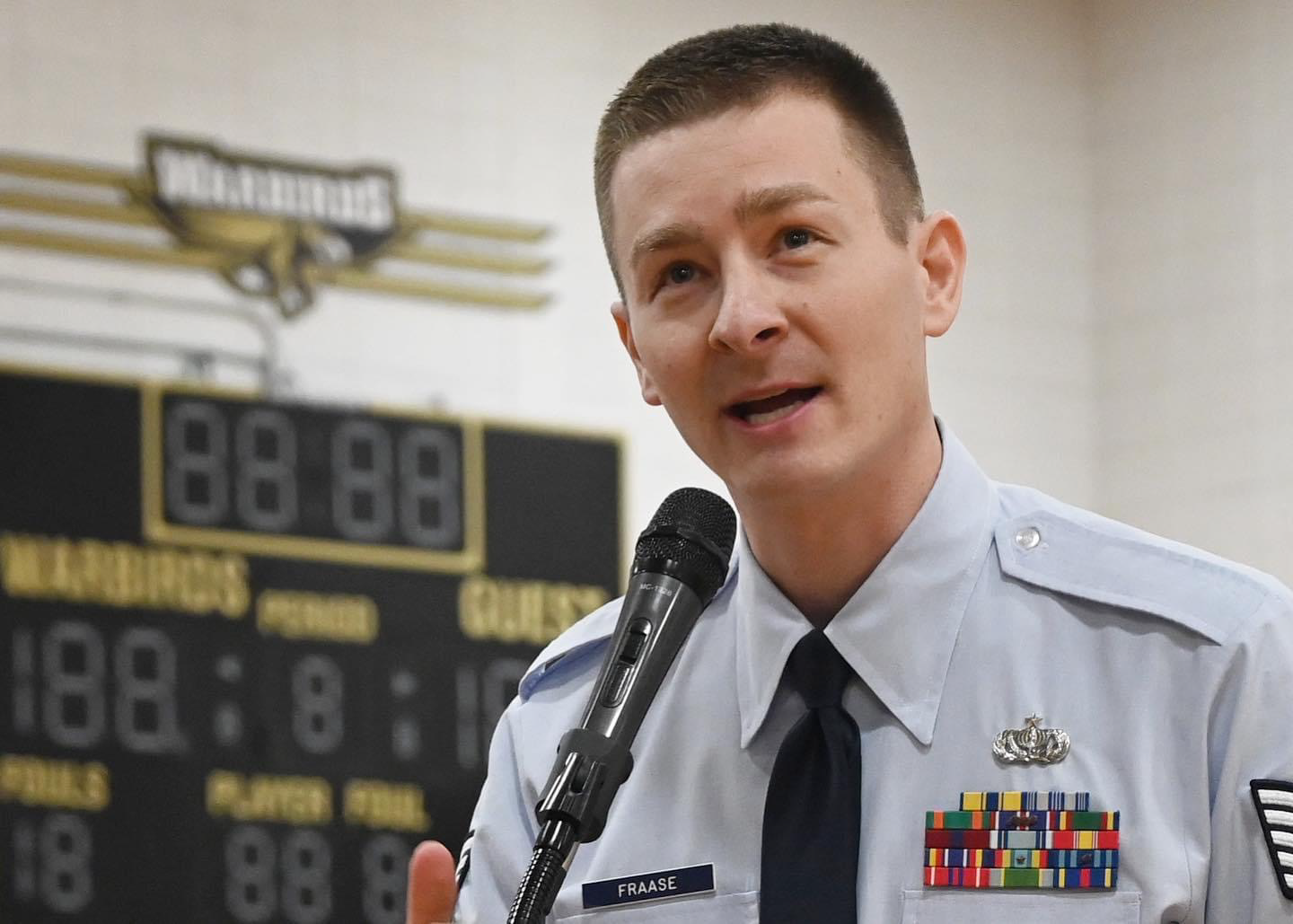 Tech Sgt. Matthew Fraase, N.D. Air National Guard production recruiter, was invited to speak at Wyndmere High School's award banquet specifically to honor new Hooligans Jack Manstrom and Tarah Heley at Wyndmere High School, Wyndmere, N.D., May 11, 2023. (U.S. National Guard story by Tech Sgt. Matthew Fraase, N.D. Air Guard Production Recruiter)