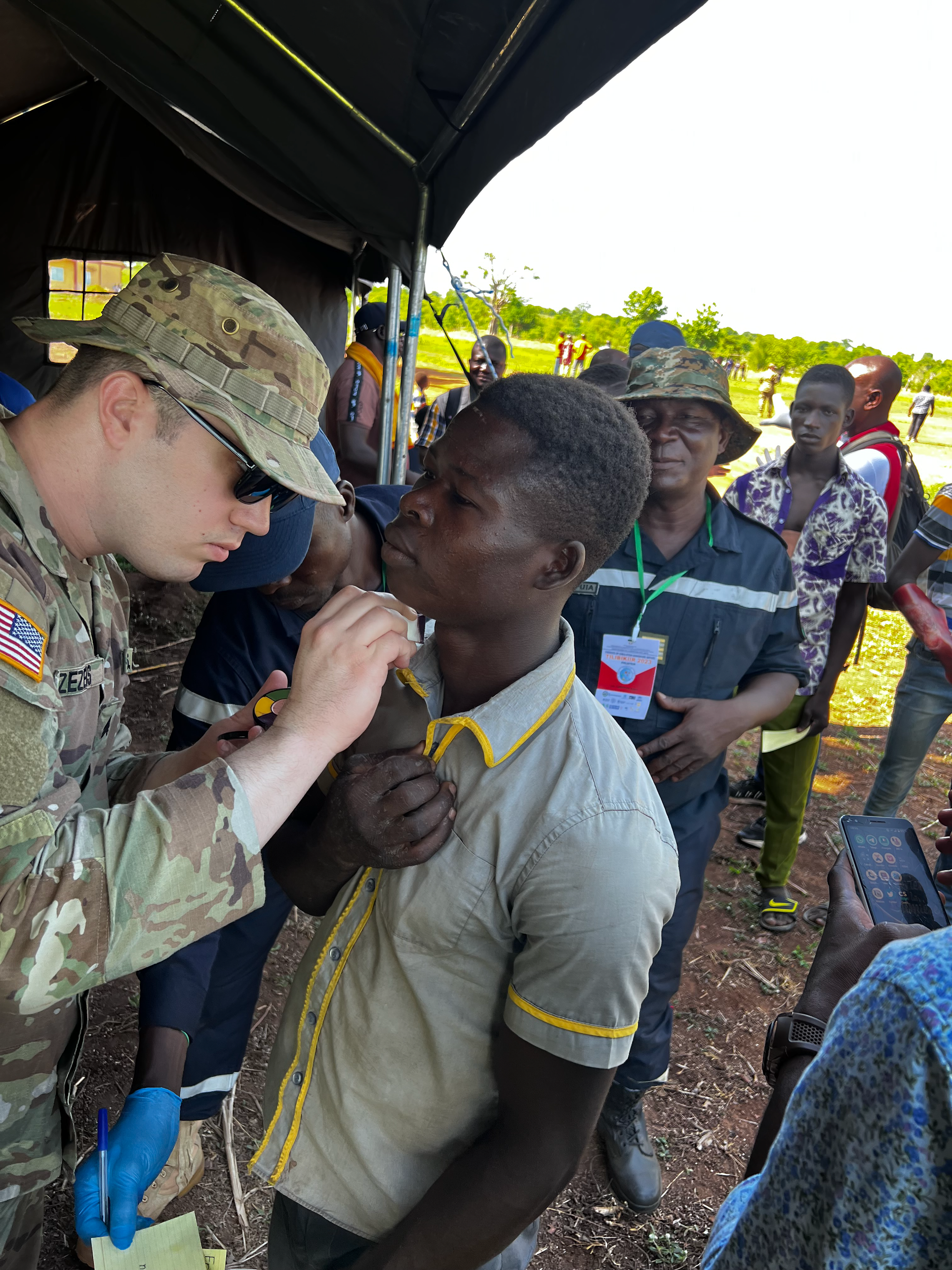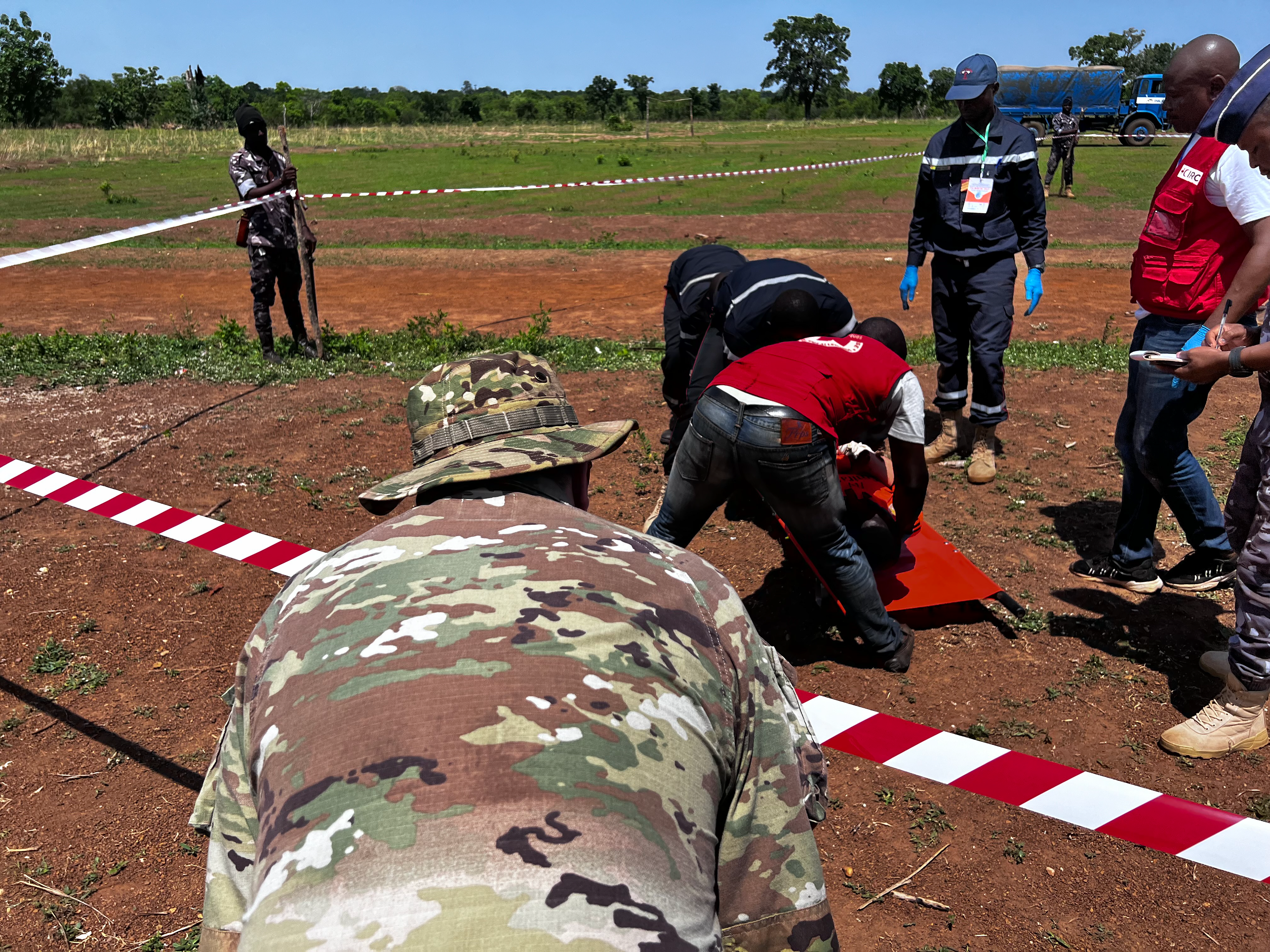 Sgt. Sam Zezeus, N.D. Amy National Guard Medical Detachment, observes as the first responders consisting of the international Red Cross/Red Crescent along with Togo's National Fire Service conduct first aid after inter-community conflict in the Dankpen Prefecture, May 7, 2023, in the Kara, Togo region.