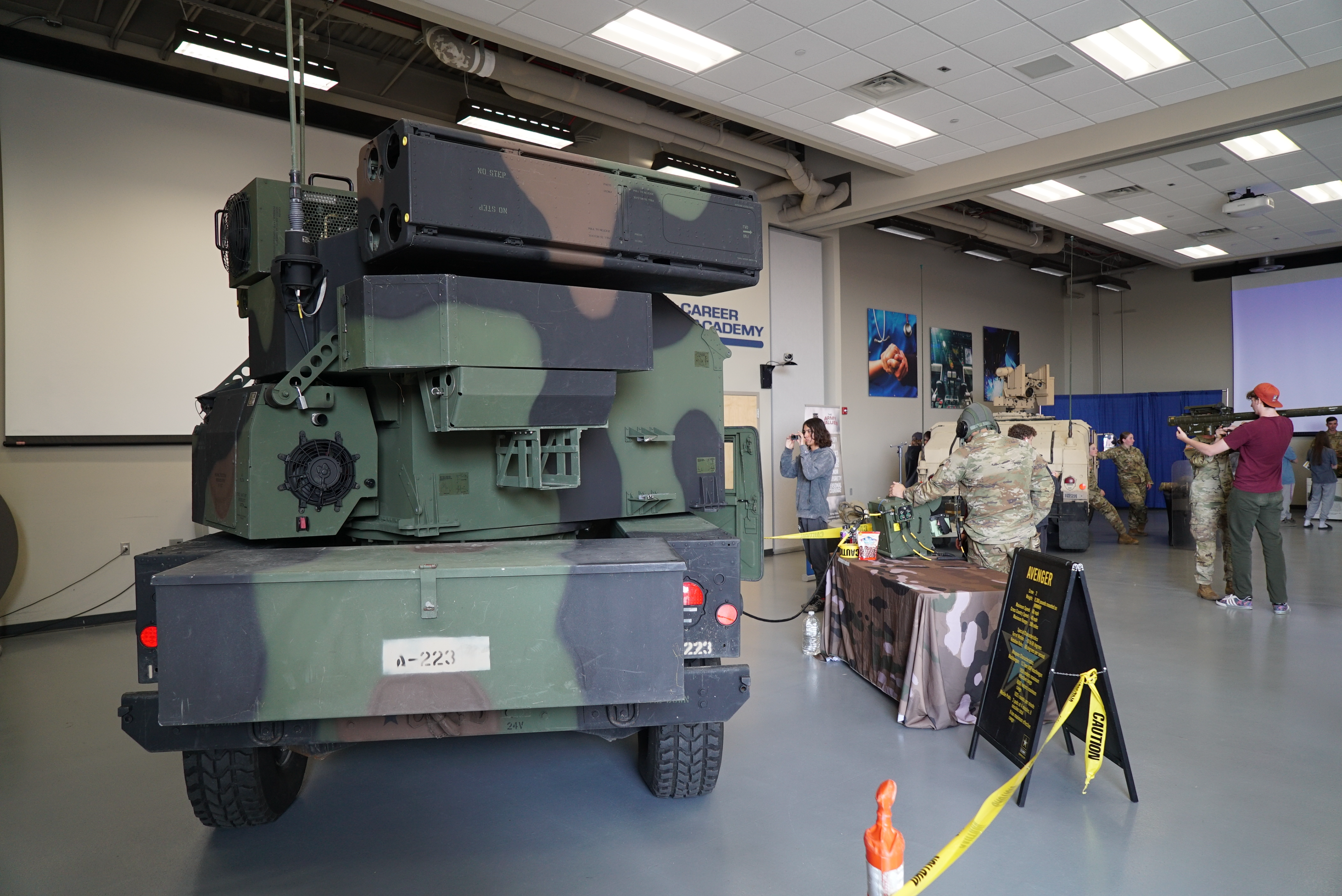 Soldiers from the 188th Air Defense Artillery Regiment (1-188th ADA) show their equipment to students during the Discovery Career Fair at the Bismarck Career Academy, Bismarck State College, May 16, 2023. College, May 16, 2023.