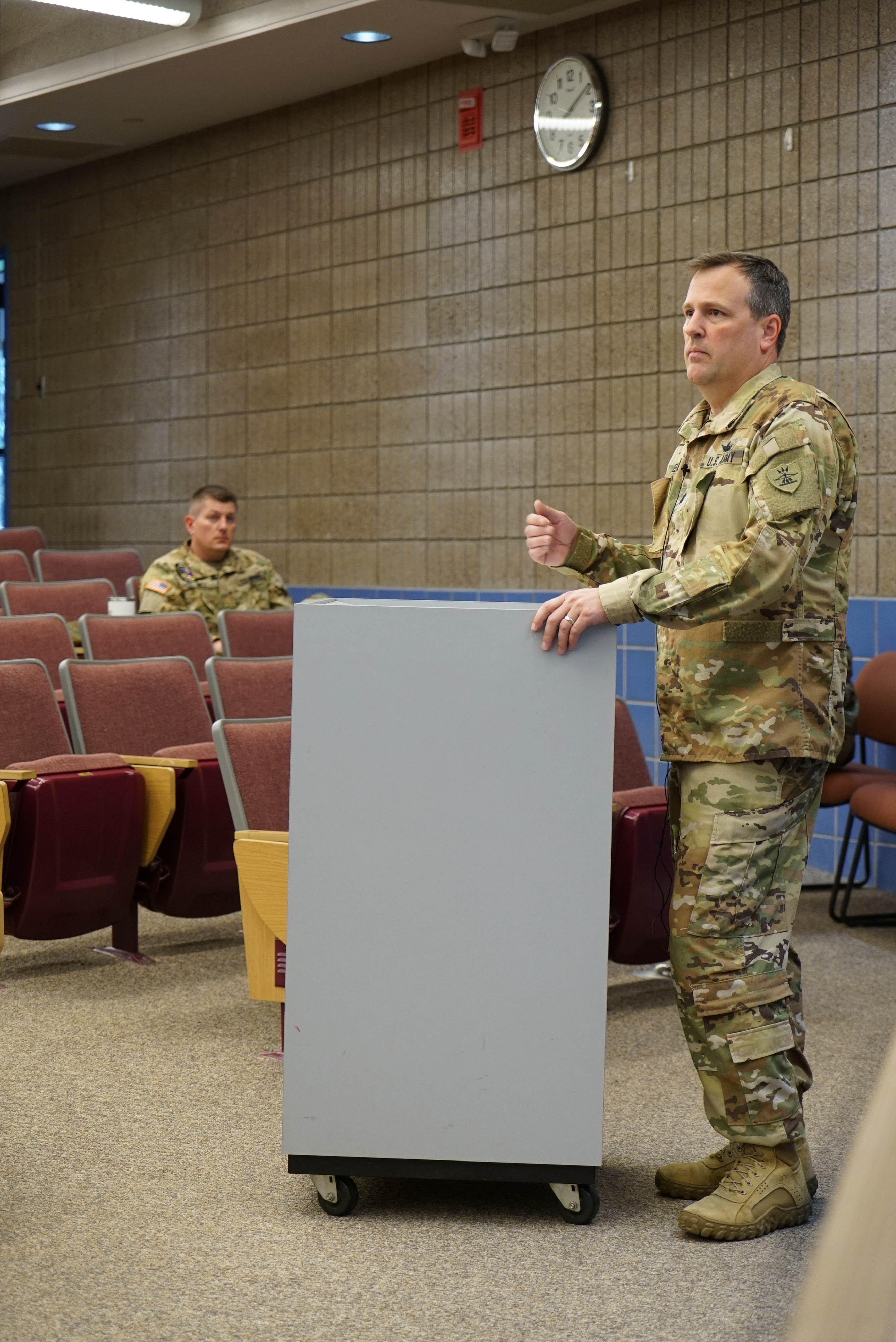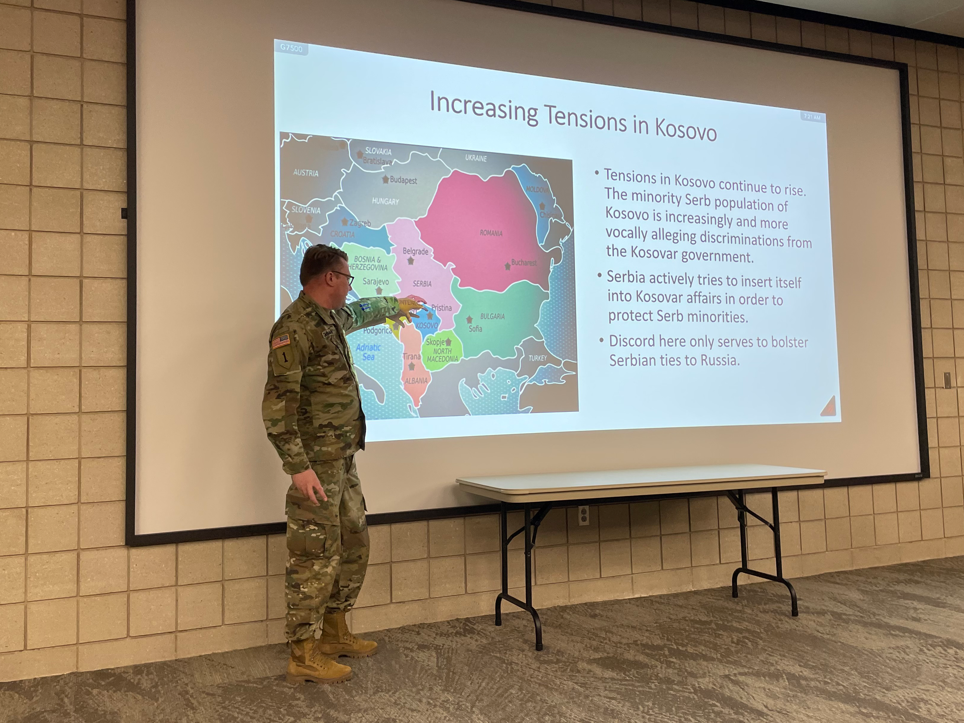 Sgt. 1st Class Laton Lohmann, religious affairs NCO, Joint Force Headquarters, discusses the current situation in Kosovo during a presentation on the political situations around the world, April 24, 2023, National Guard Readiness Center, Fargo, N.D.