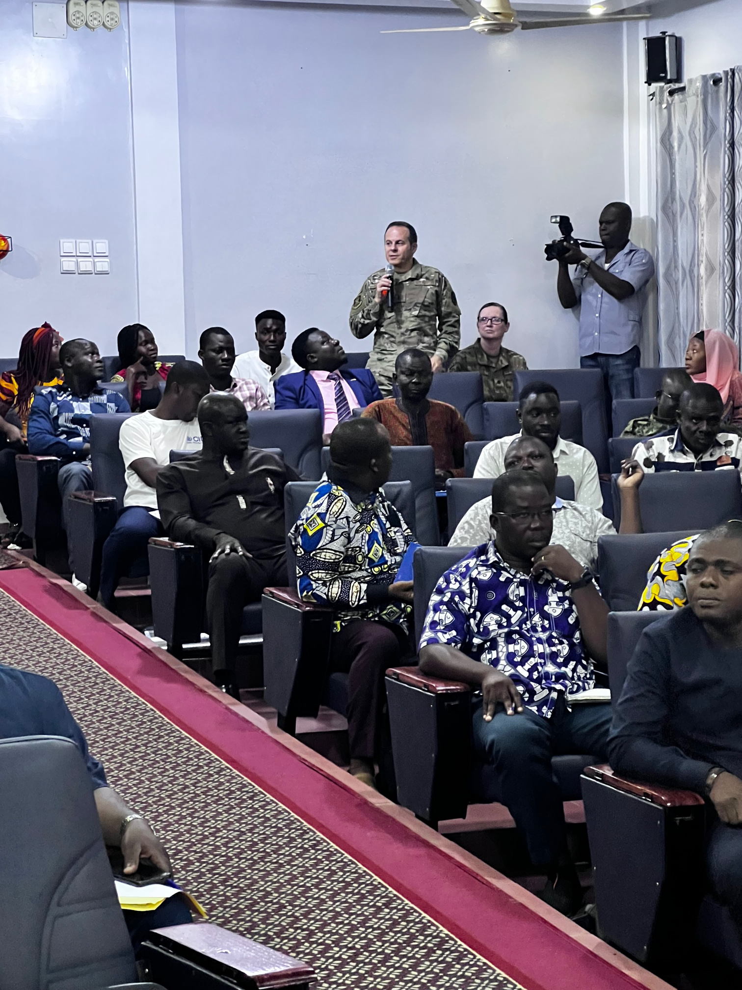 Lt. Col Mark McEvers, director, N.D. National Guard State Partnership Program for Ghana, Togo, and Benin conducts a press conference with the Togo media to provide information on the exercise and how the N.D. National Guard works with Togolese first responders, May 7, 2023, Tome, Togo.