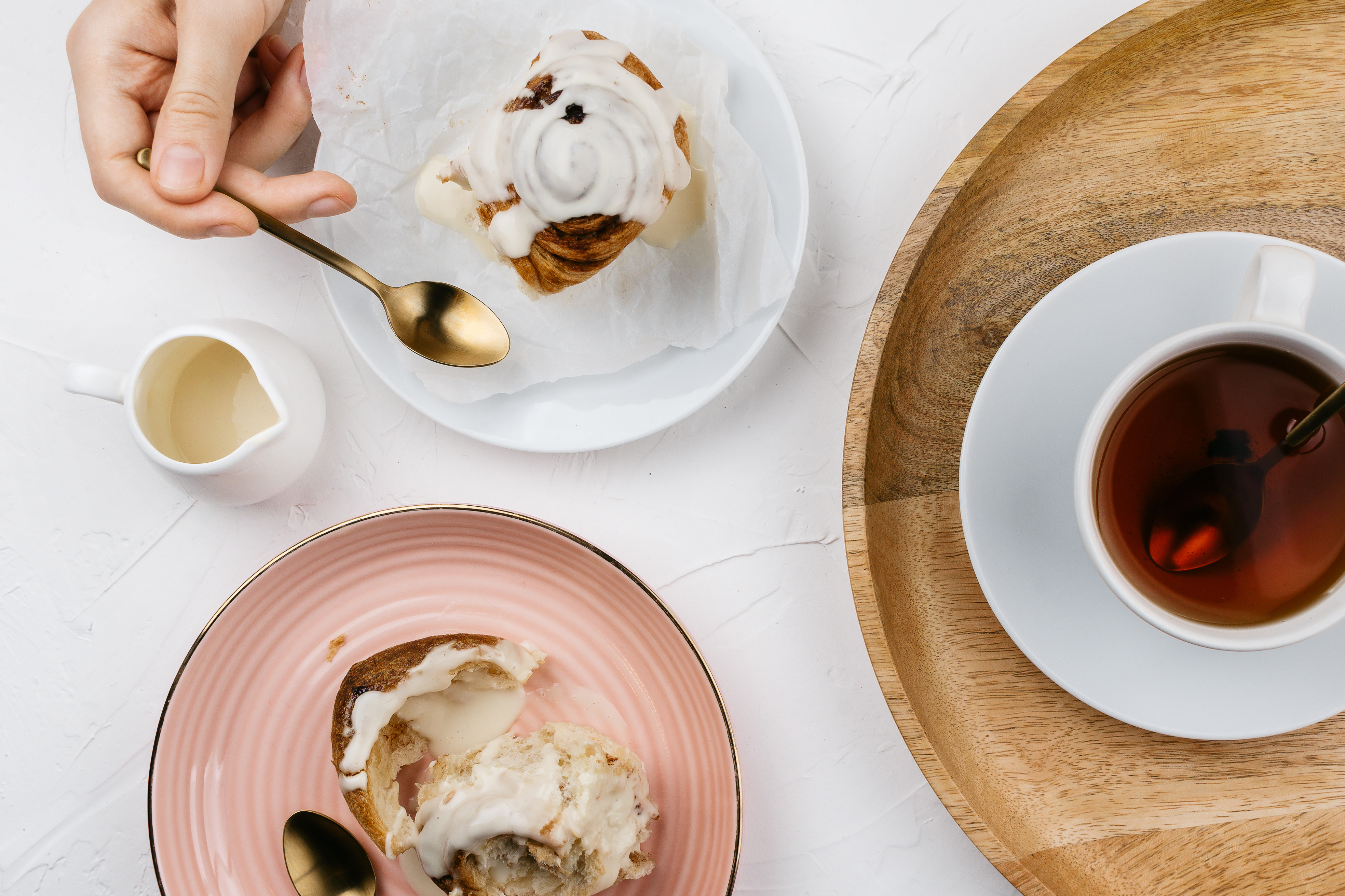 Created with an image by lavrenkova - "Flatlay of homemade cinnamon rolls with cream and tea on white cement background"