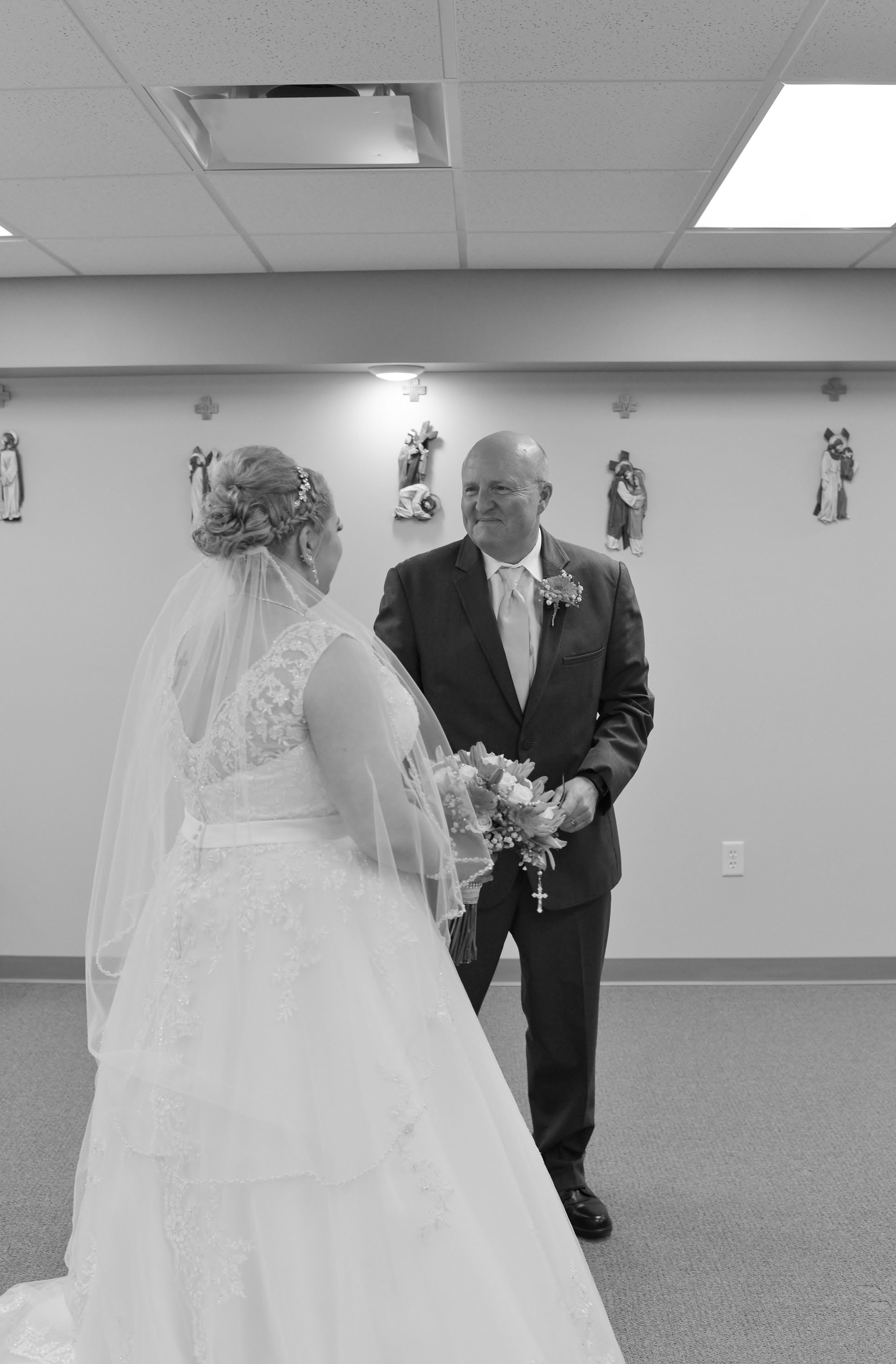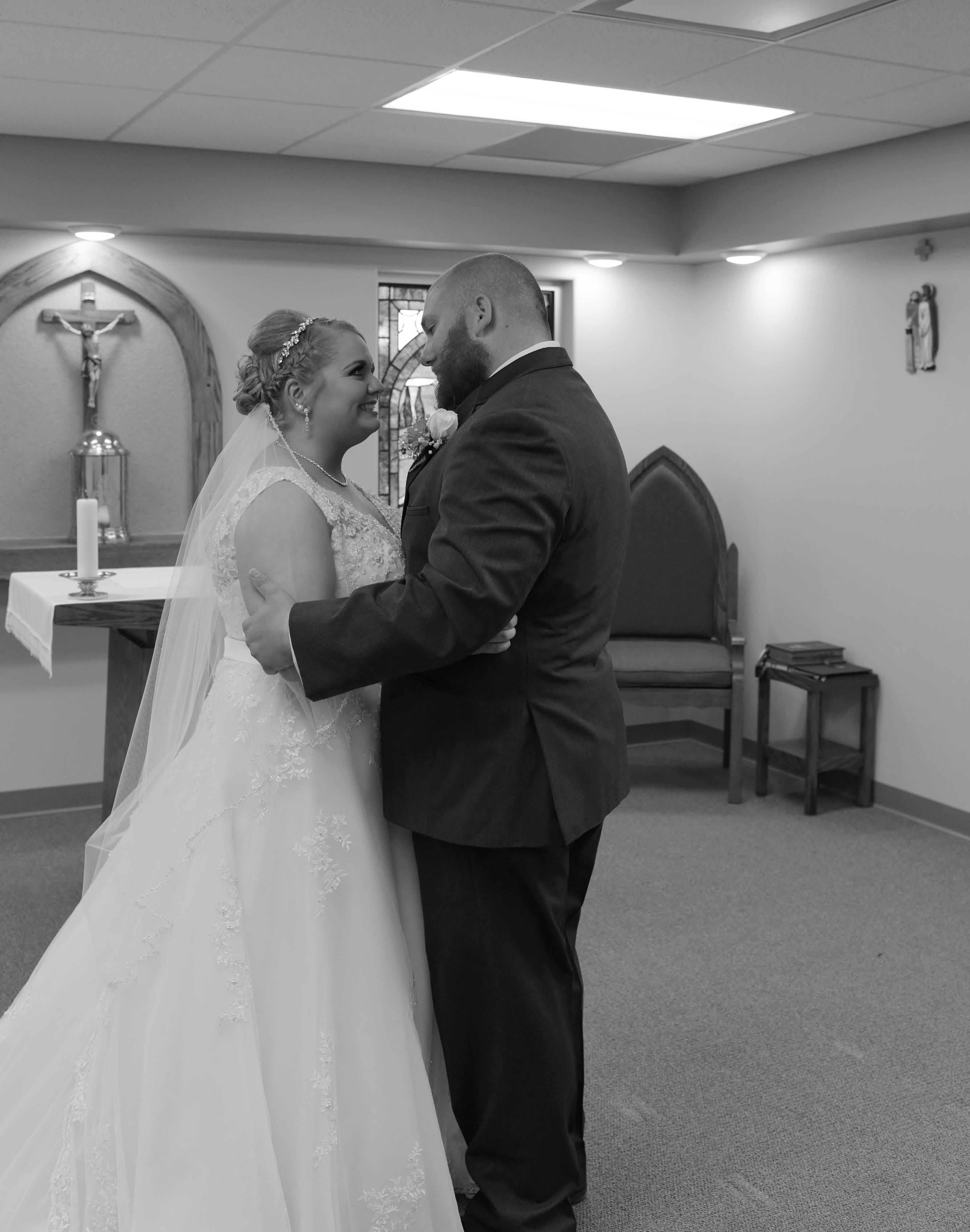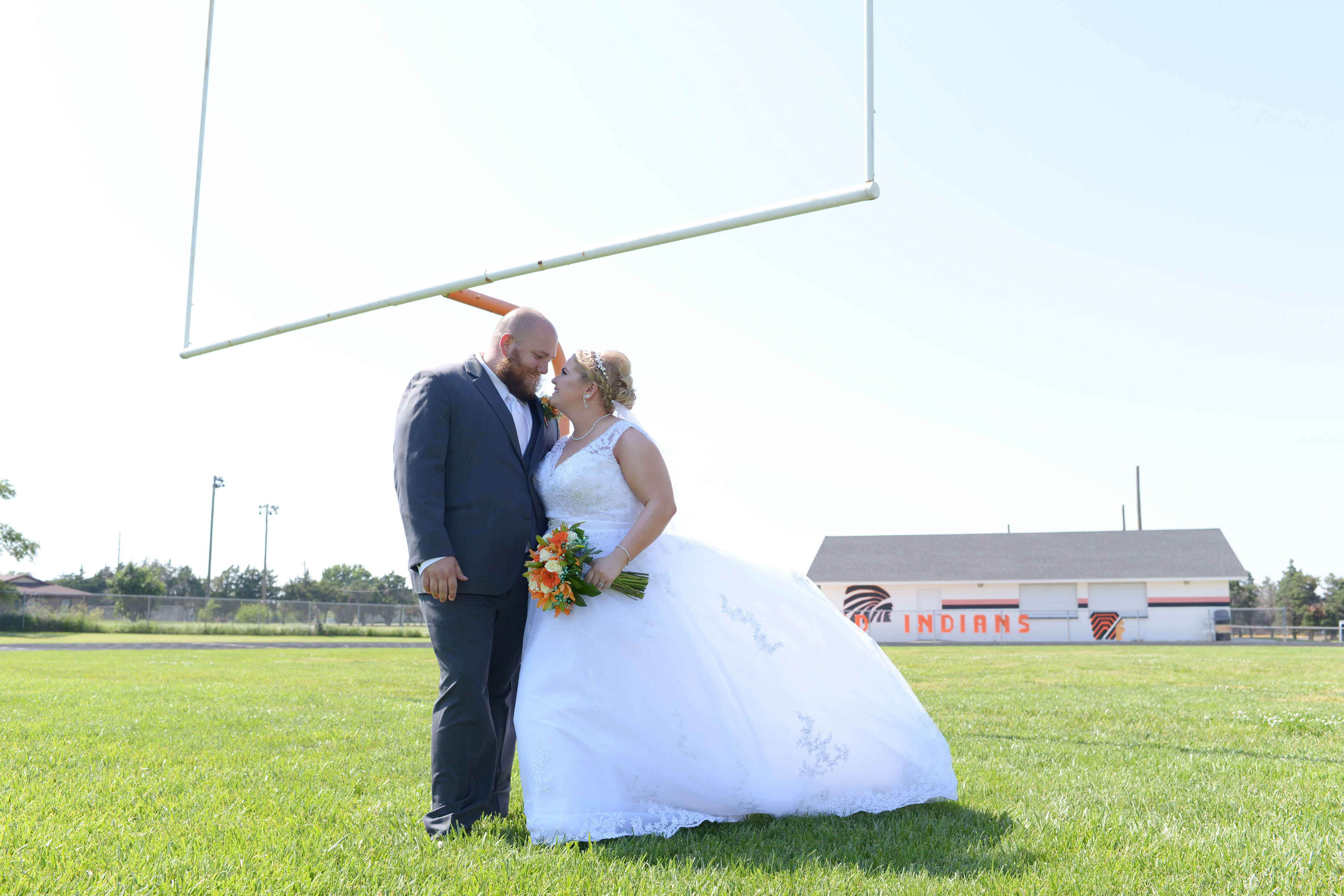 Our wedding was a magical day. Our families put in lots of work and love into making this day the most perfect day. We started our day by the girls doing their hair and my cousin Amber doing our makeup and the guys hanging out in the church rectory getting ready. The girls then went to the church hall to get dressed. Our parents made sure we were fed by providing us Subway for lunch. After we were all dressed and ready to go we exchanged letters and small gifts to each other. We did not see each other yet so one of our groomsmen and bridesmaids brought these gifts and letters to us. Kayla and her dad did a first look together in the church chapel. It was finally time for the bride and groom to see each other. We did a first look in the church chapel where Kayla walked up and tapped Mike on the shoulder. It was the most magical moment. We were both full of emotion and tears but when we saw each other for the first time it was like nothing else mattered. The one mishap of the day that we will always remember is that one of Kayla's orange Gerber daises opened up between the flower shop and the ceremony. With 10 minutes left until we walked down the aisle, Kayla looked down at the front of her dress and noticed she had big Orange spots on her dress from them. She was crying and stressed but Kayla's mom came to save the day by cutting a piece of lace from the very bottom of her dress and stitching it over the orange spots. This is something we both can laugh about till this day. Before heading to the reception we of course stopped to take picture at the football field. Then, we went to the reception where we danced, laughed and made more memories with all of our family and close friends.
