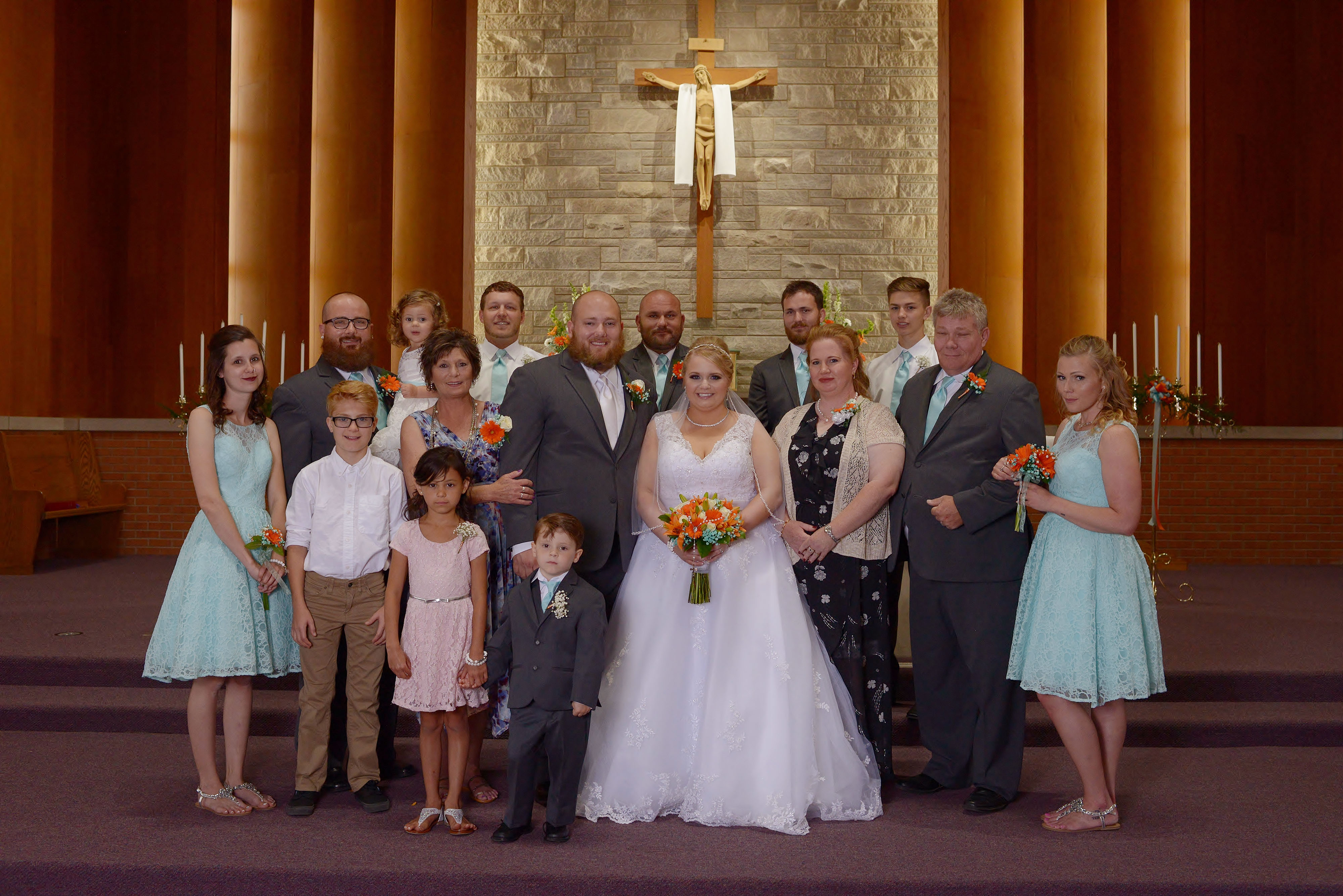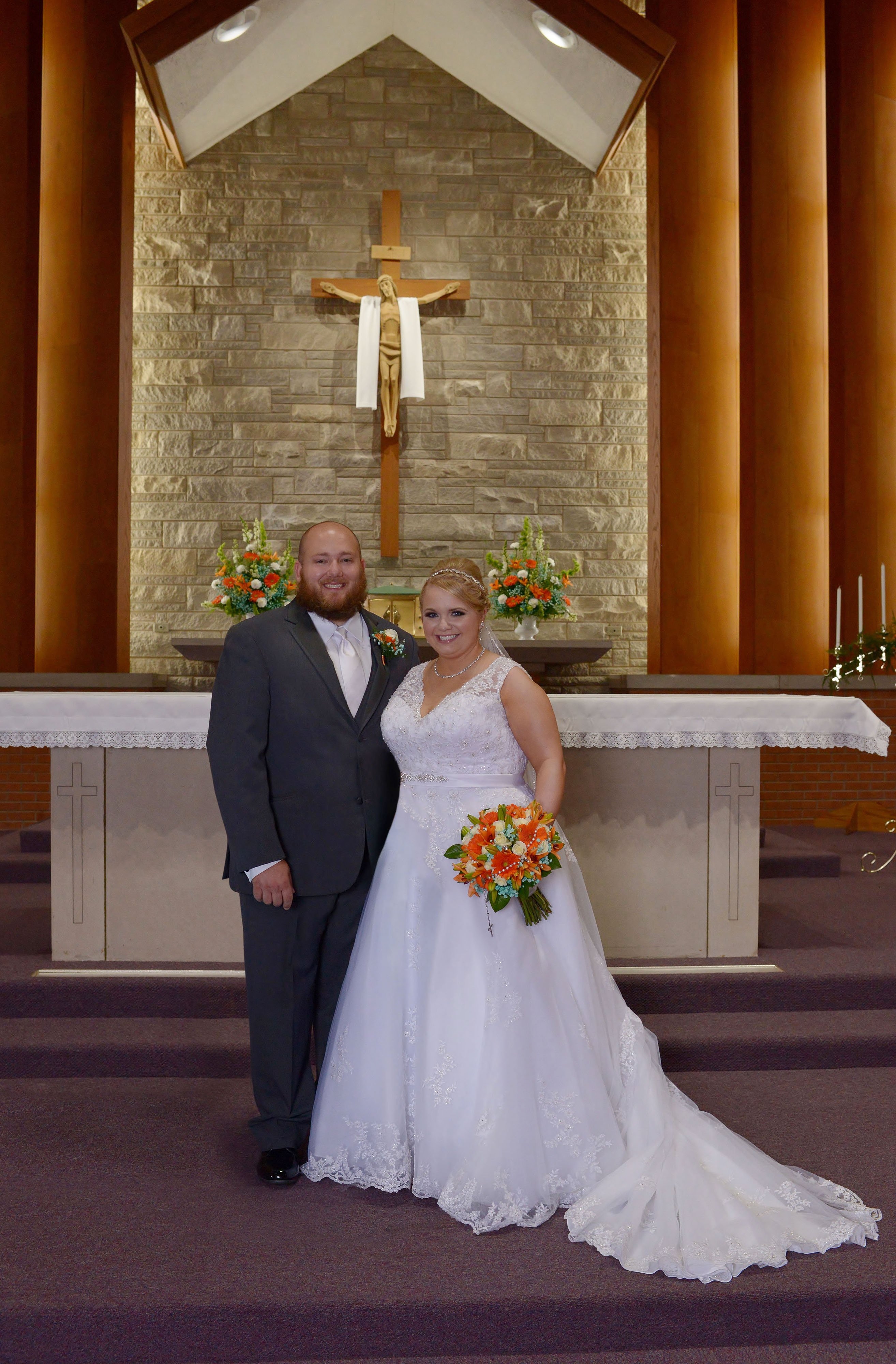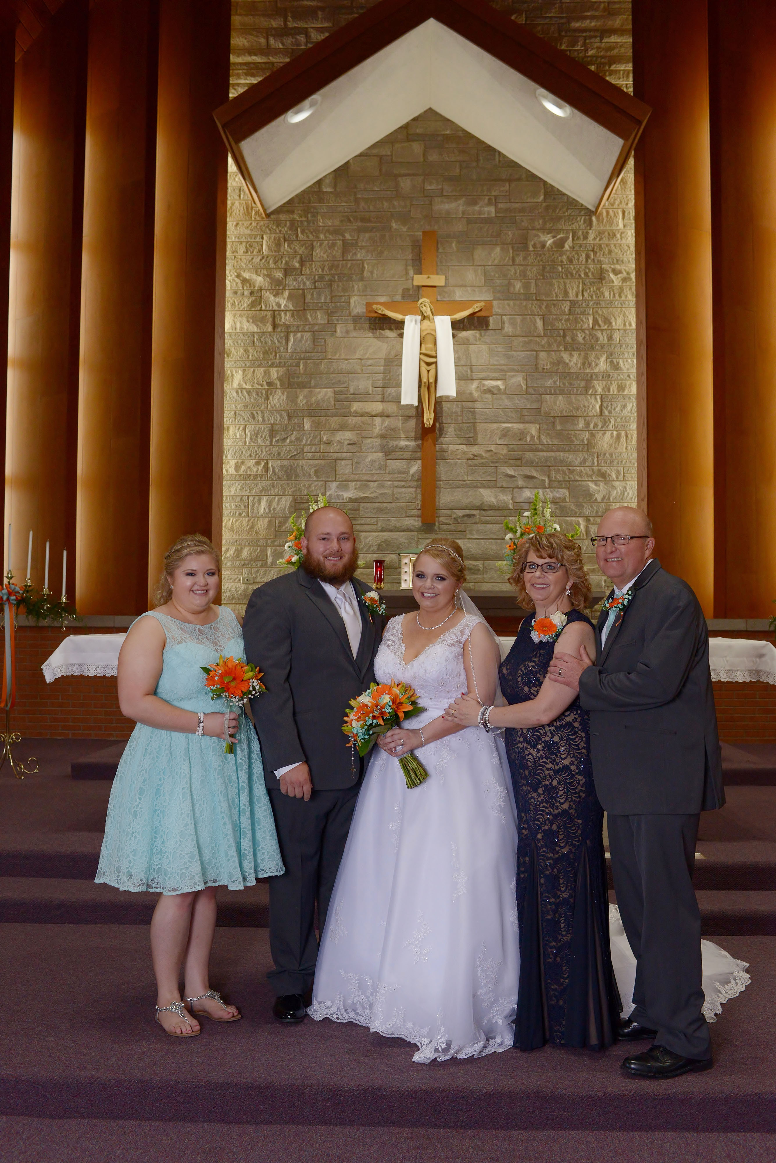 Our wedding was a magical day. Our families put in lots of work and love into making this day the most perfect day. We started our day by the girls doing their hair and my cousin Amber doing our makeup and the guys hanging out in the church rectory getting ready. The girls then went to the church hall to get dressed. Our parents made sure we were fed by providing us Subway for lunch. After we were all dressed and ready to go we exchanged letters and small gifts to each other. We did not see each other yet so one of our groomsmen and bridesmaids brought these gifts and letters to us. Kayla and her dad did a first look together in the church chapel. It was finally time for the bride and groom to see each other. We did a first look in the church chapel where Kayla walked up and tapped Mike on the shoulder. It was the most magical moment. We were both full of emotion and tears but when we saw each other for the first time it was like nothing else mattered. The one mishap of the day that we will always remember is that one of Kayla's orange Gerber daises opened up between the flower shop and the ceremony. With 10 minutes left until we walked down the aisle, Kayla looked down at the front of her dress and noticed she had big Orange spots on her dress from them. She was crying and stressed but Kayla's mom came to save the day by cutting a piece of lace from the very bottom of her dress and stitching it over the orange spots. This is something we both can laugh about till this day. Before heading to the reception we of course stopped to take picture at the football field. Then, we went to the reception where we danced, laughed and made more memories with all of our family and close friends.