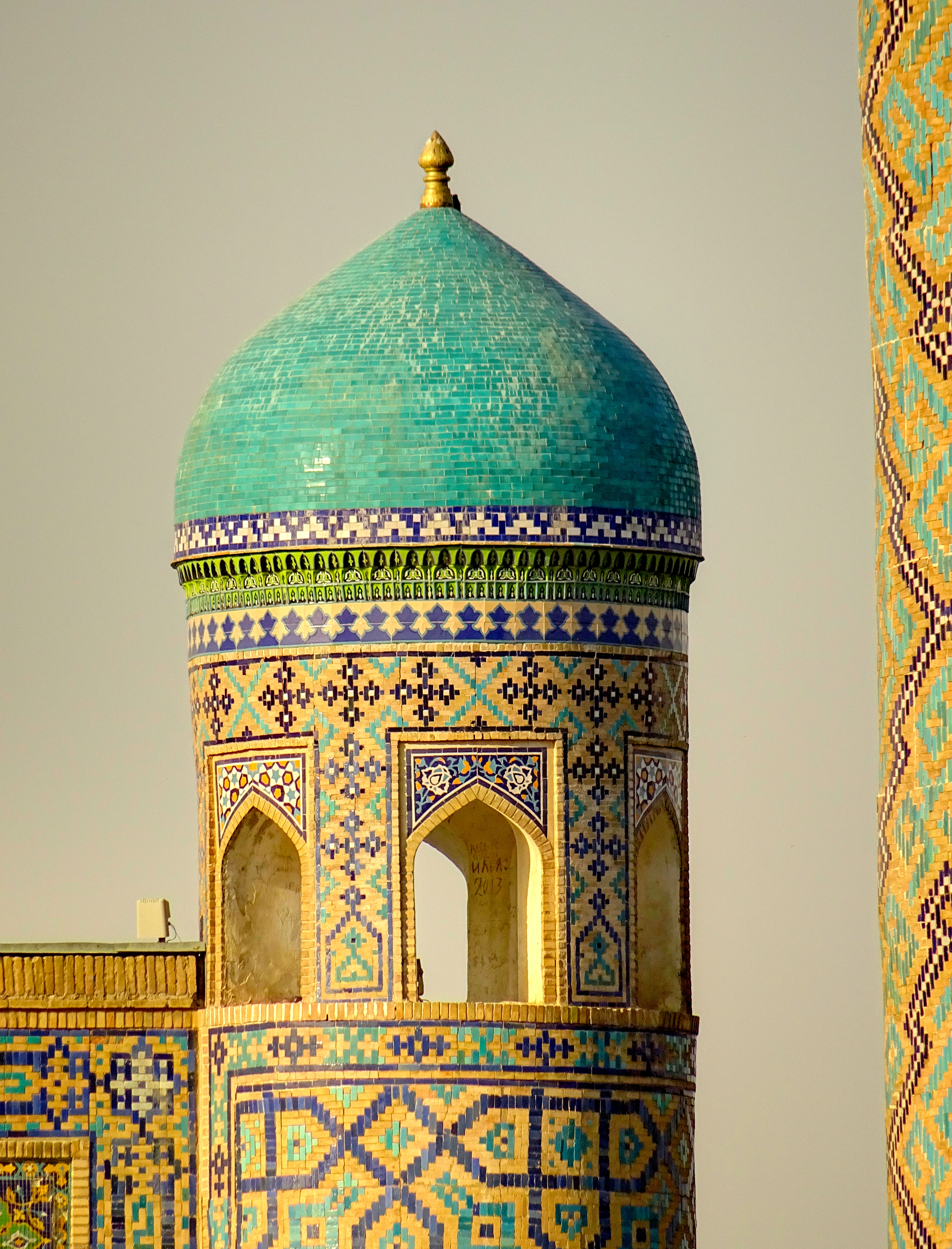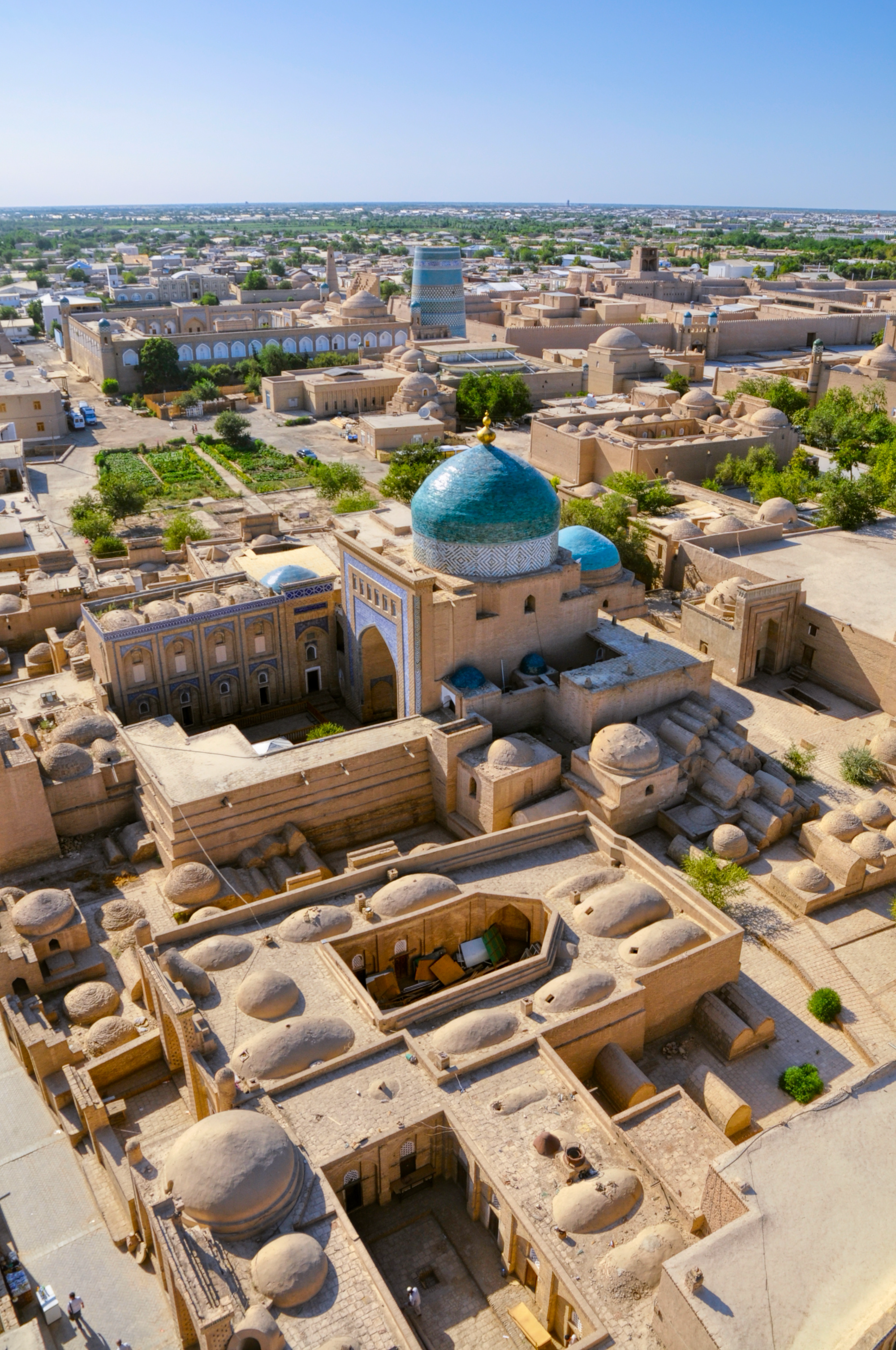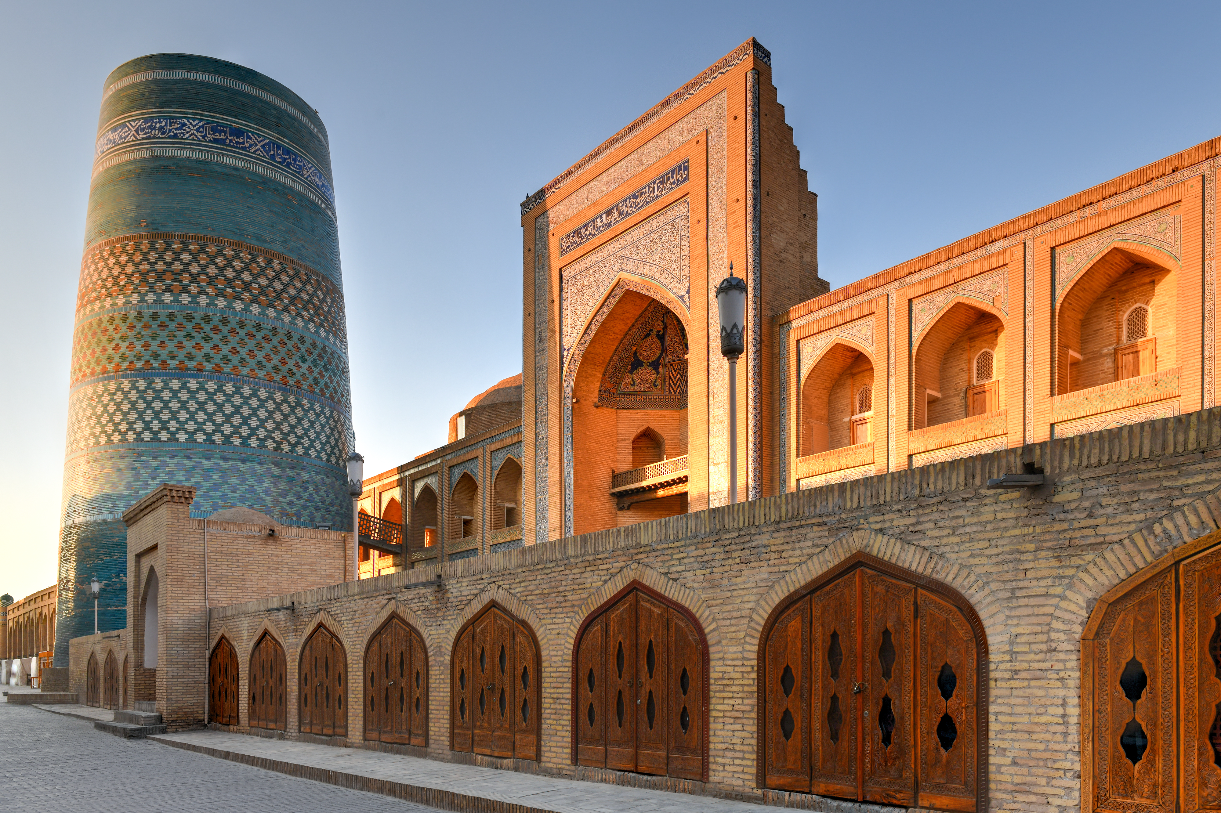 Découverte de la médersa Mouhammad Amin Khan et le minaret Kalta, la forteresse Koukhna Ark, du beau mausolée de Pakhlavan-Mahmoud, du Tach Khaouli, ou le « Palais de Pierre » et son Harem, de la mosquée du Vendredi avec ses 219 colonnes en bois sculpté.