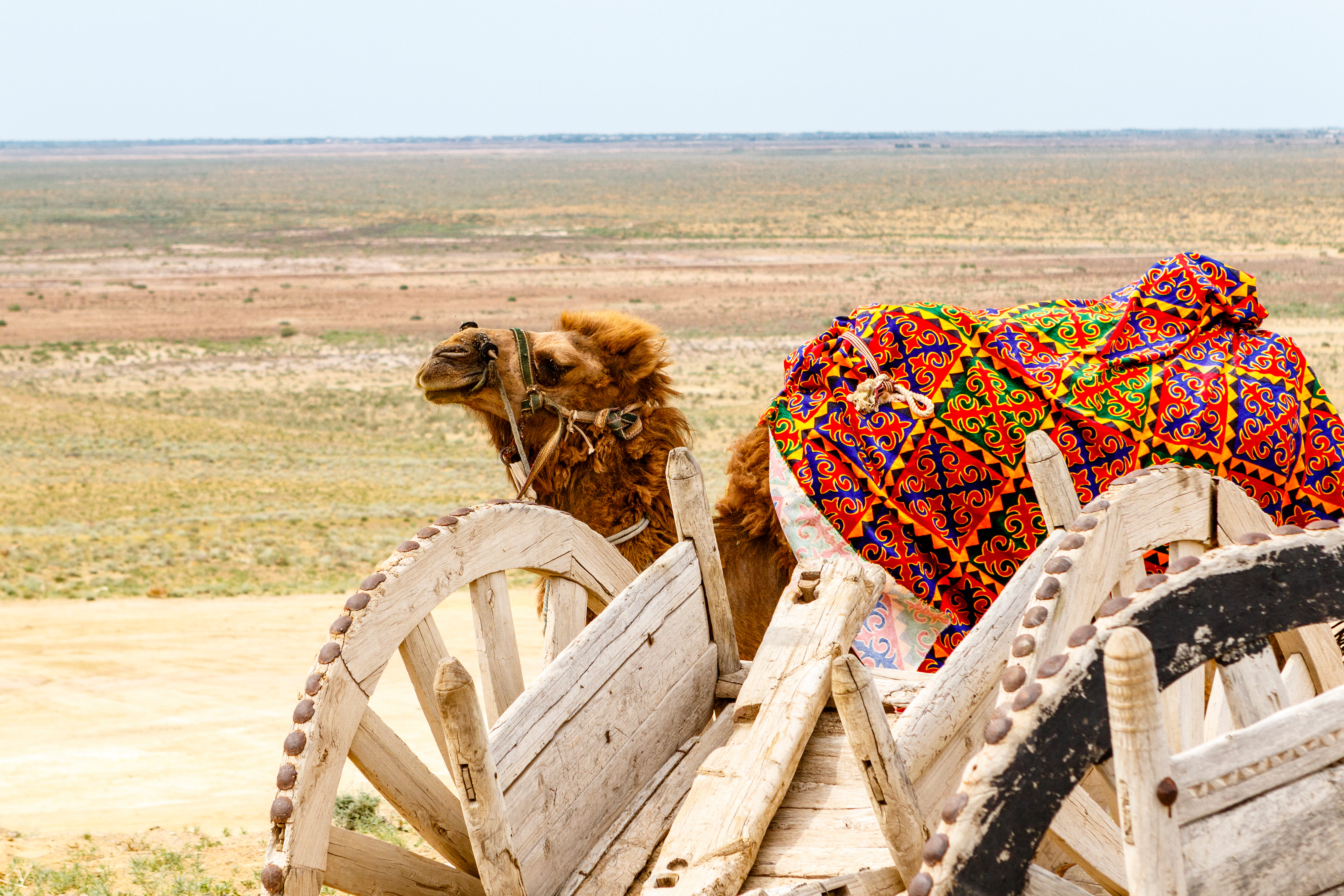 Départ en bus pour les grands espaces du Kyzil-Koum, le désert Rouge en longeant la vallée de l'Amou Daria, pour rejoindre Khiva (450 kms).
