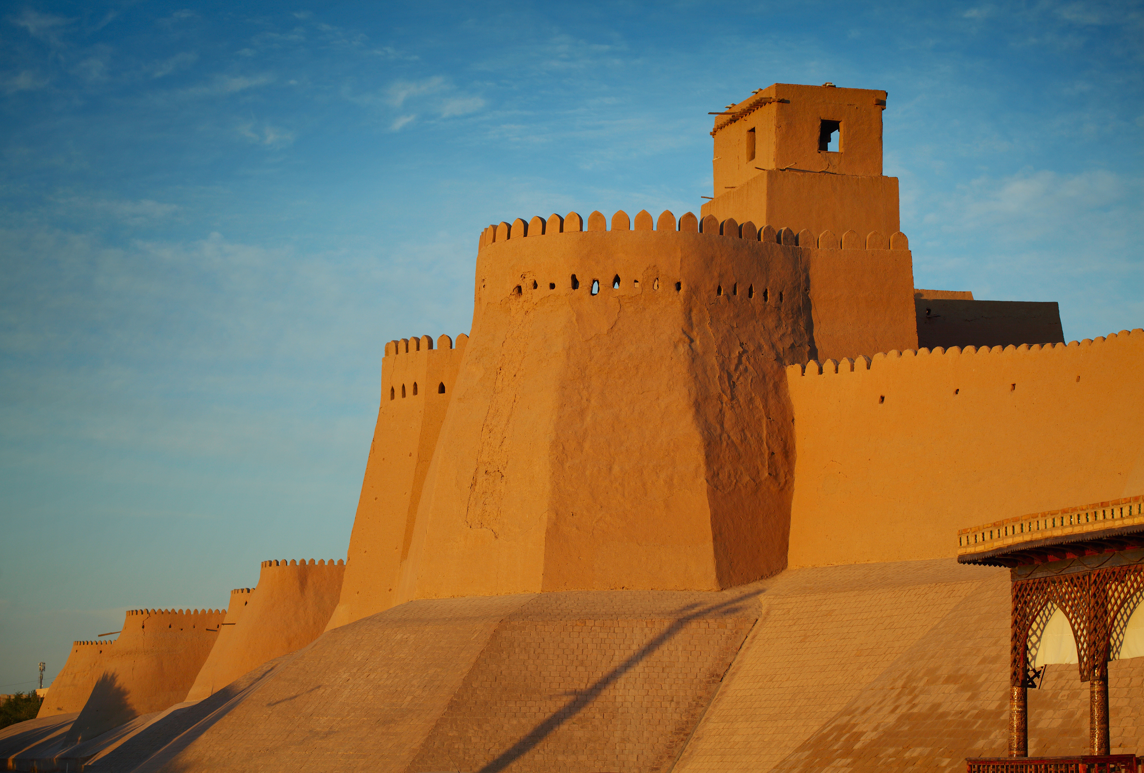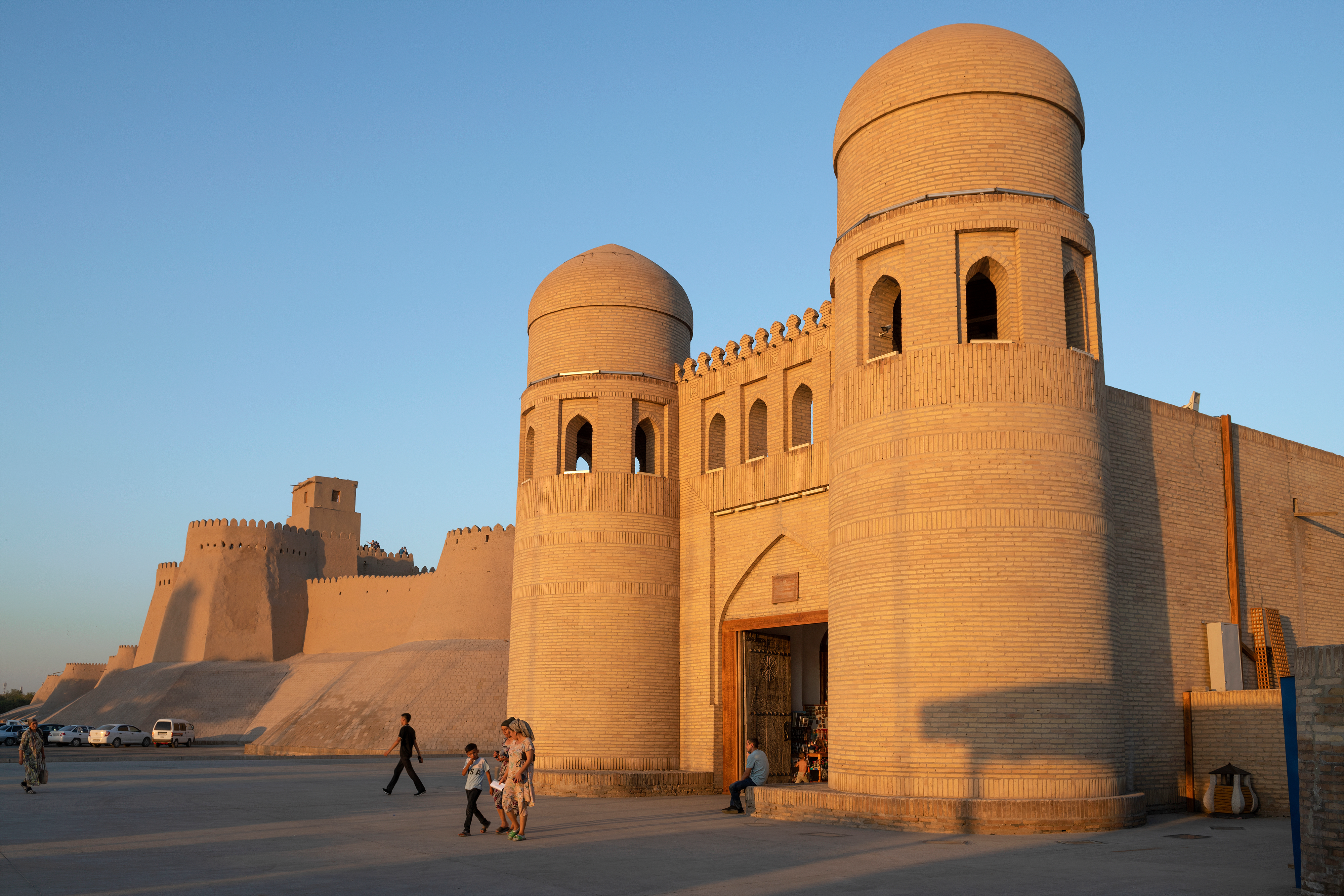 Visite d’Itchan Kala – un véritable trésor de l’architecture orientale qui semble sortie des contes des ��Mille et une nuits». La ville intérieure, retranchée derrière des murailles de brique hautes d'une dizaine de mètres était l'ultime étape des caravaniers avant de traverser le désert en direction de l'Iran.