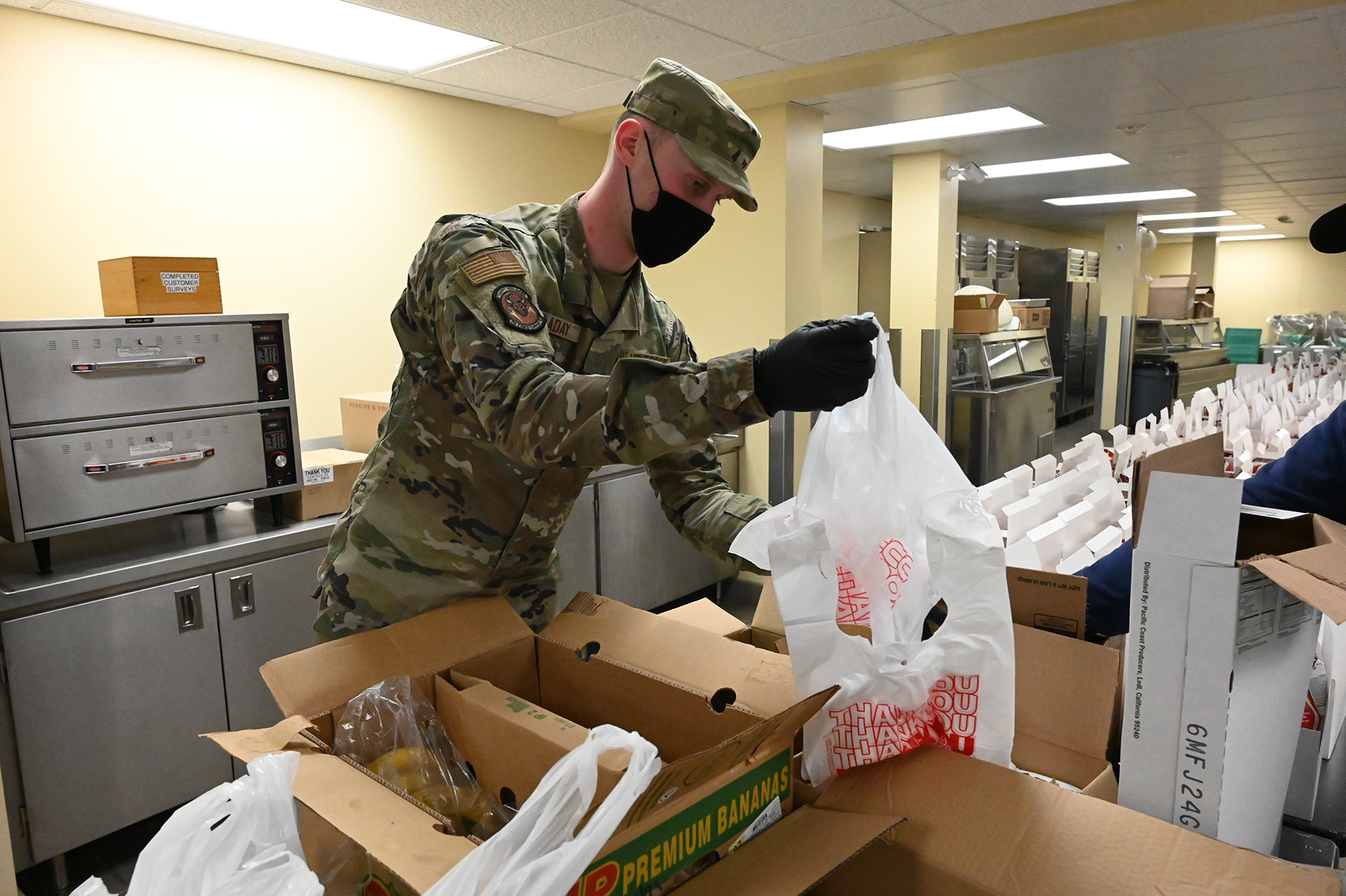 Airman Paul Holaday, 119th Services Flight, packages lunches for unit member distribution at the N.D. Air National Guard Base, Fargo, N.D., during monthly unit training assembly on Jan. 10, 2021.