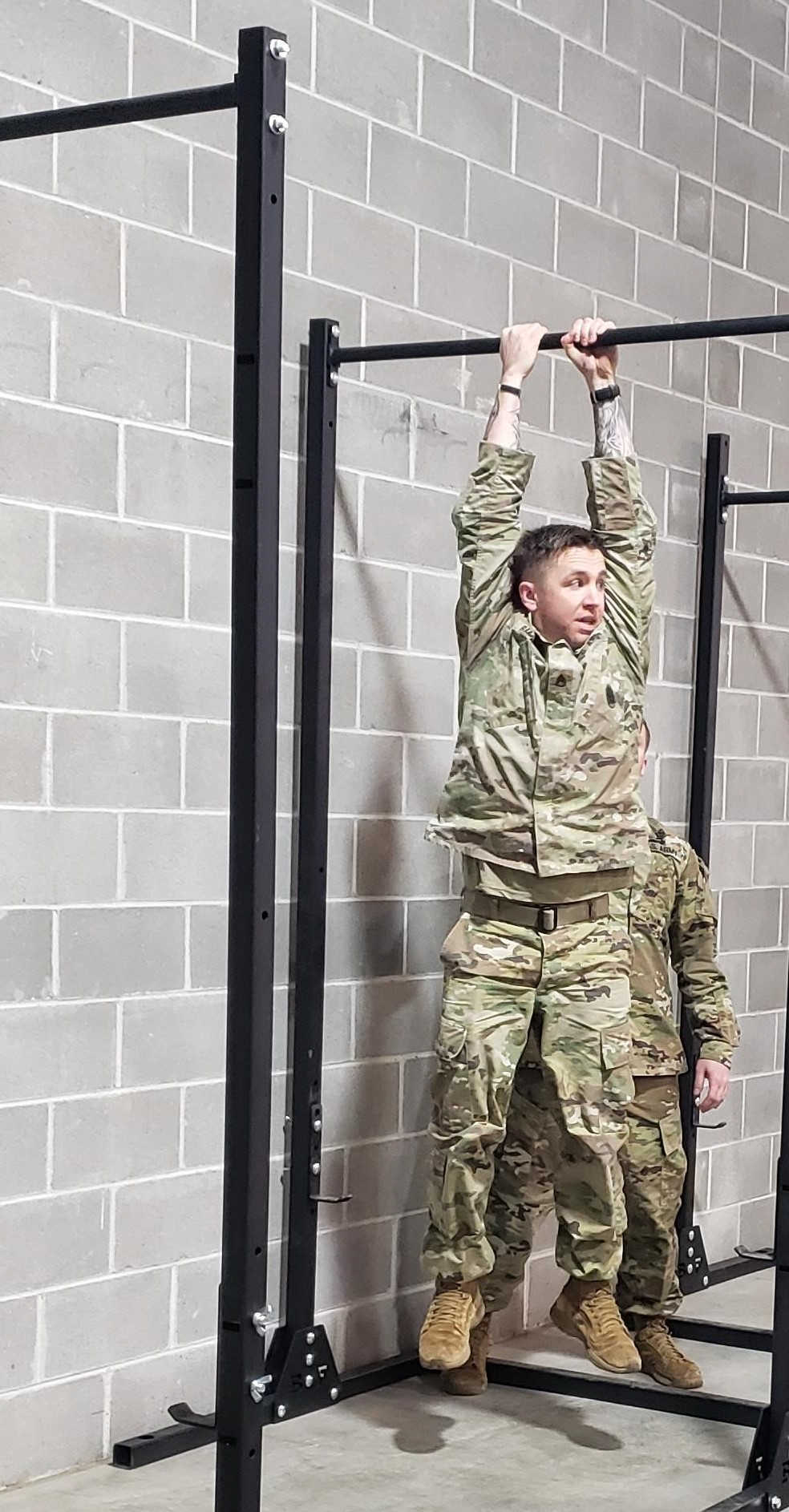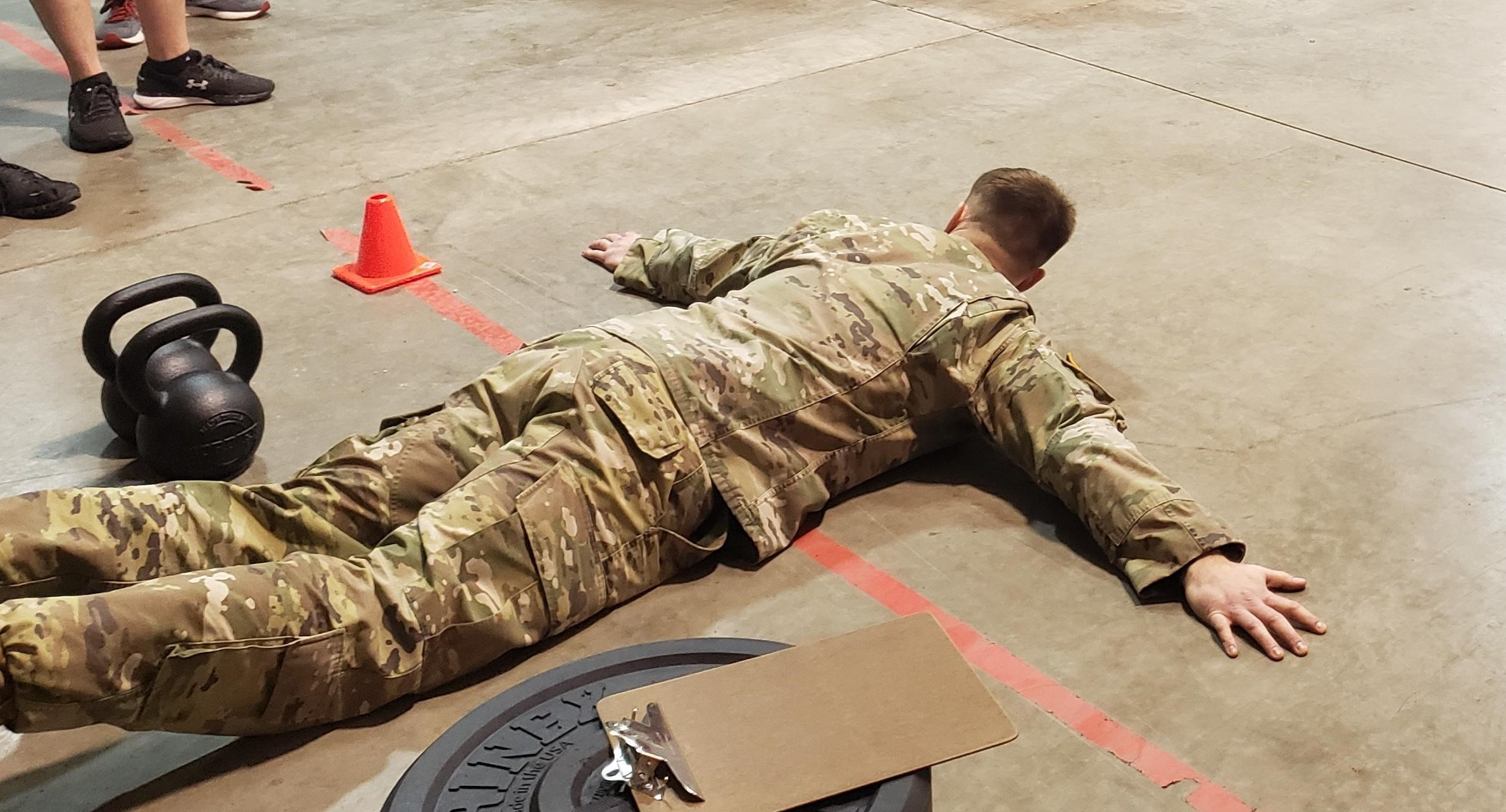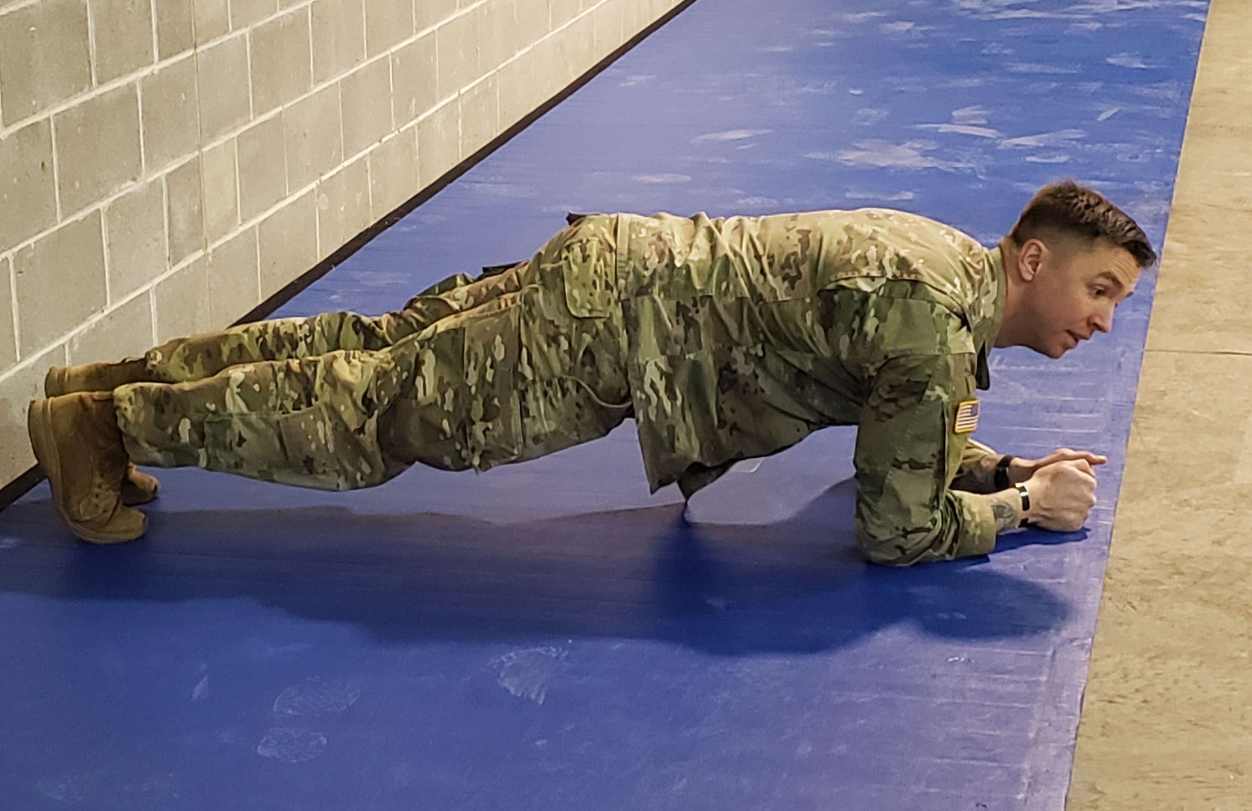 Staff Sgt. Jon Rambow demonstrates the Army Combat Fitness Test's two minute plank at Camp Grafton Training Center during the 817th Engineer Company's Inactive Duty Training period on Jan. 9, 2021.
