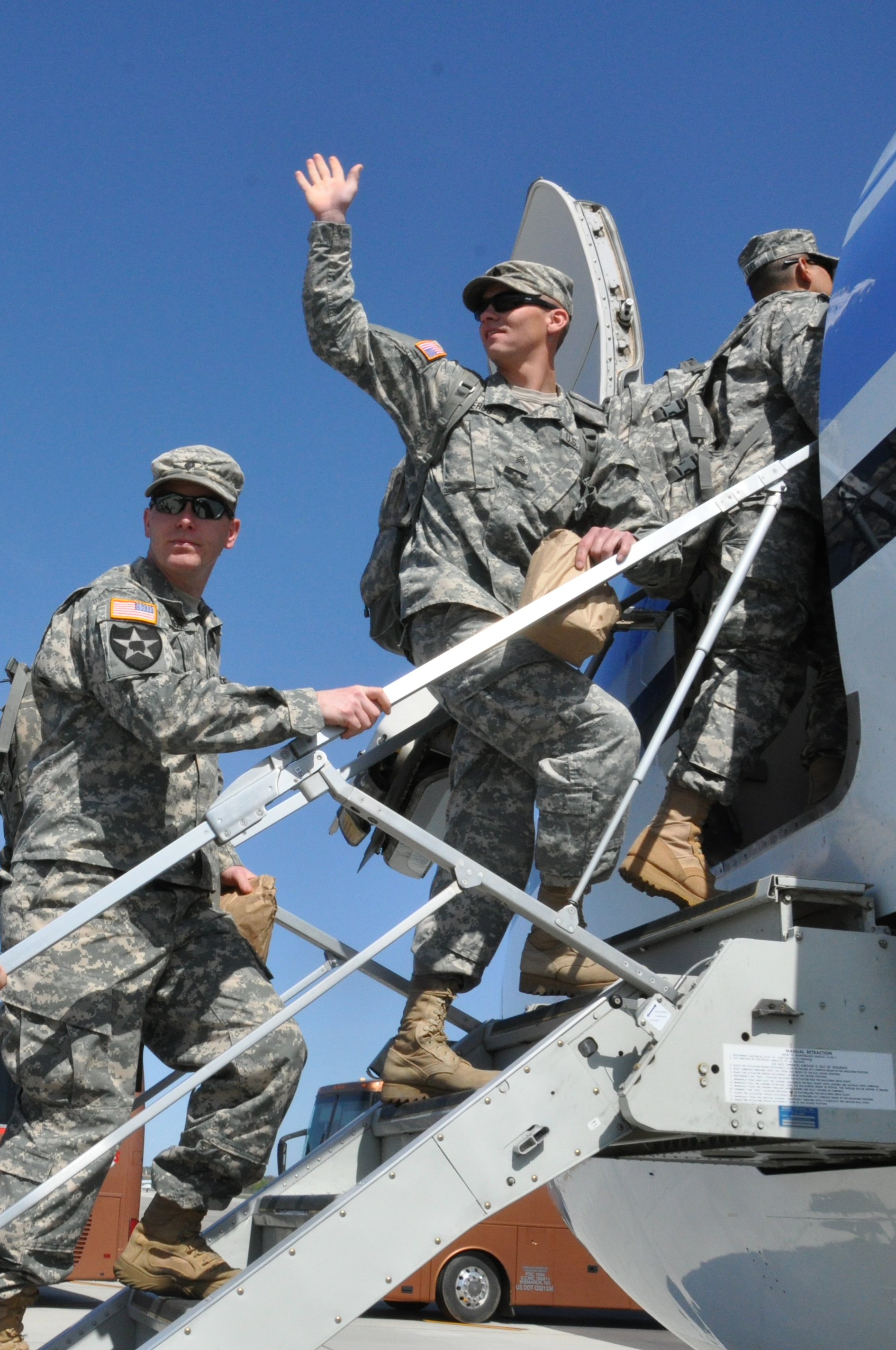 Soldiers of the North Dakota National Guard's 818th Engineer Company (Sapper) board their chartered flight beginning their year-long deployment to Afghanistan at the Bismarck Airport, Bismarck, N.D. on April 30, 2012. (National Guard photo by Bill Prokopyk, N.D. National Guard Public Affairs)