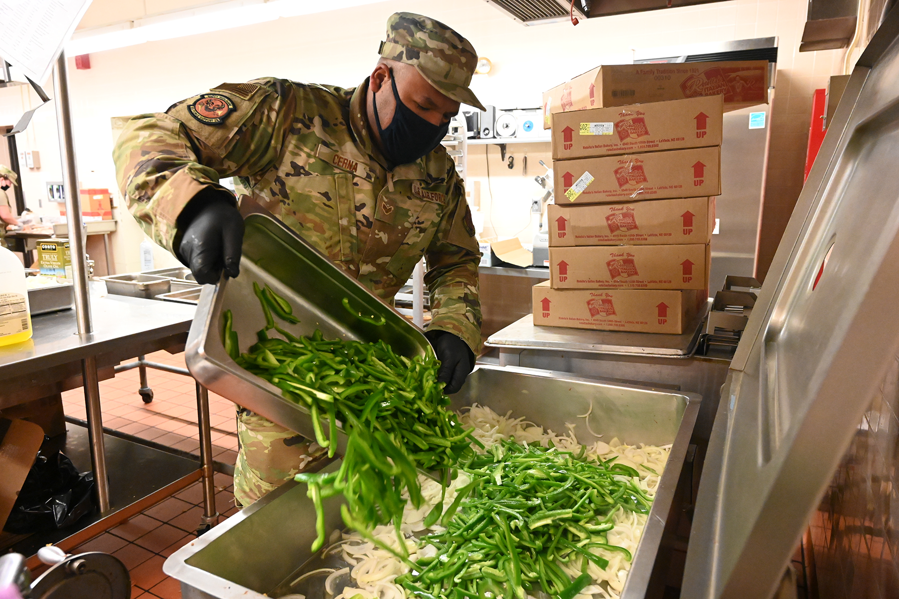 Senior Airman Jhon Cerna, 119th Services Flight, empties a pan of green peppers onto a cooking surface as he helps prepare a hot fajita meal for unit training assembly lunch at the N.D. Air National Guard Base, Fargo, N.D., Jan. 10, 2021. (U.S. Air National Guard photo by Chief Master Sgt. David H Lipp)