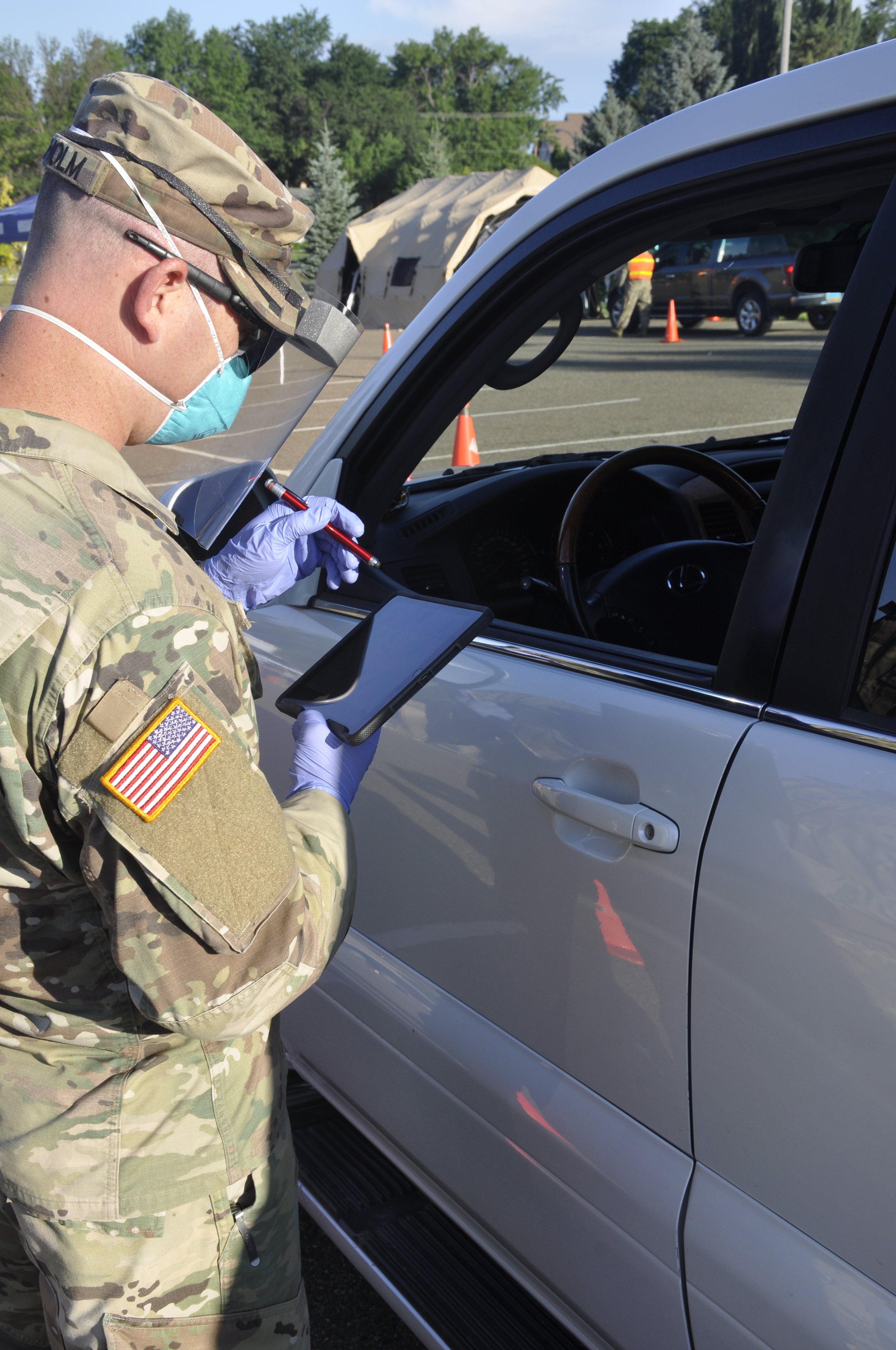 Sgt. Scott Leidholm, 1st Battalion, 188th Air Defense Artillery Regiment, collects data from a COVID-19 test participant at the N.D. State Capitol in Bismarck on July 6, 2020.